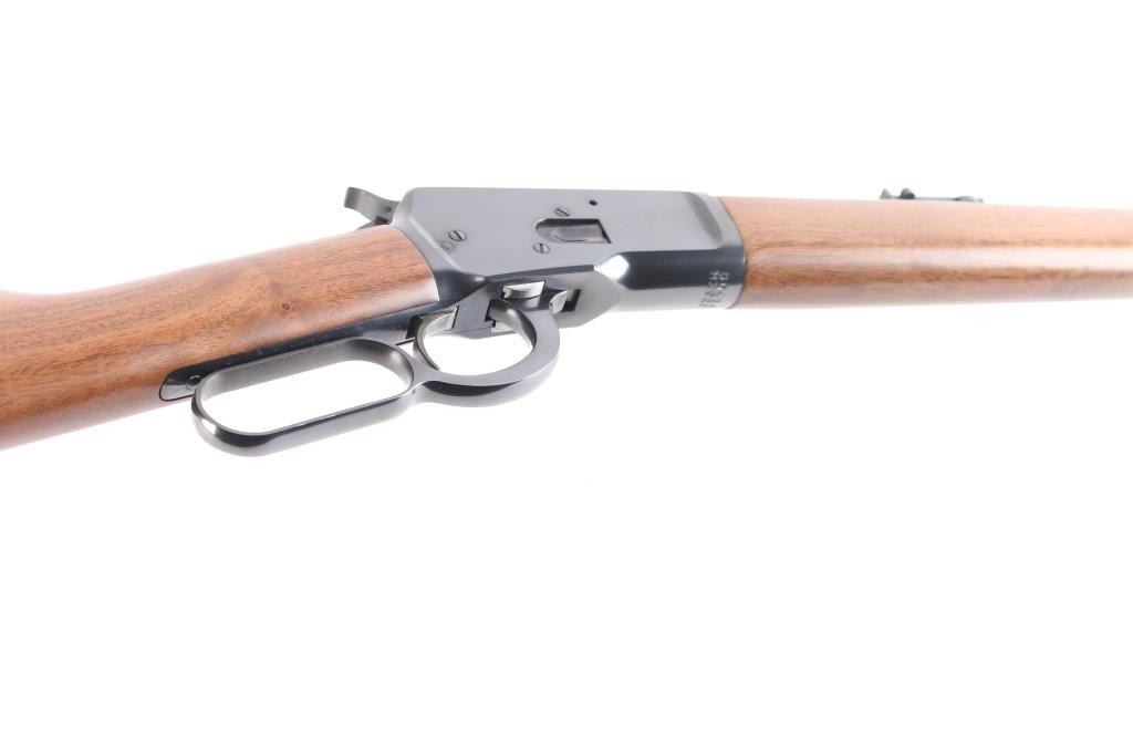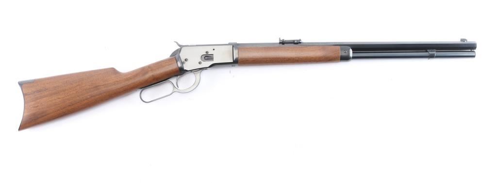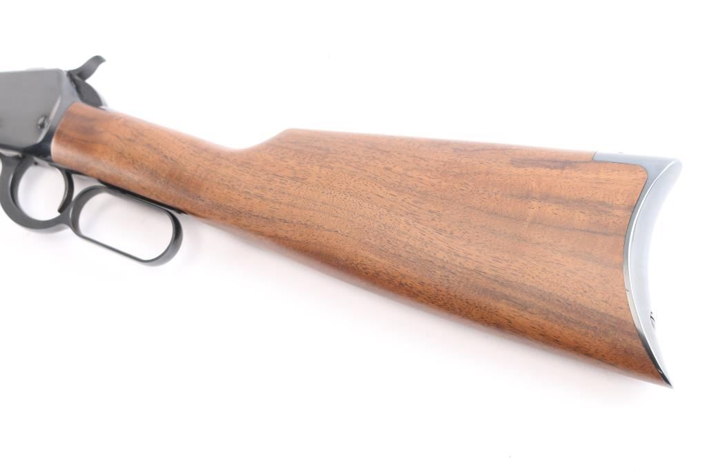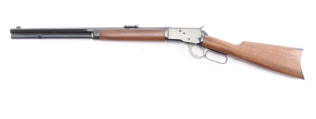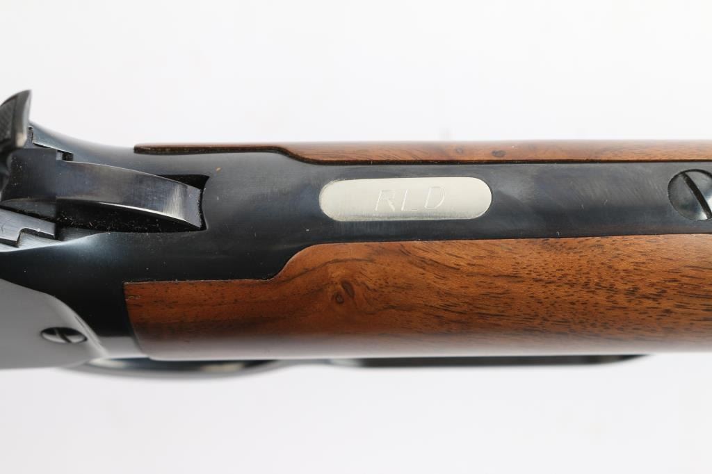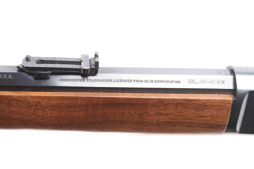 .38-40 Caliber. SN:00414MX92F 'Limited Series - 1 of 500'. Lever action repeating rifle chambered in .38-40. Government. Licensed from Olin Corp, manufactured in Japan by Miroku circa 2003 (MX Date Code) and imported by U.S. Repeating Arms Co. of New Haven, CT. Features a high polish blue finish, 20", Octagonal barrel, front sight is a brass beaded blade dovetailed to the front of the barrel. The rear sight is a semi-buckhorn U-notch elevator sight, full length tube magazine. The stocks are 2-piece smooth walnut with capped forend, straight grip, straight comb, and steel crescent buttplate. The right barrel flat is marked "Limited Series-1 of 500". There is a stainless steel inlay on the upper tang with the initials "RLD". The bore is pristine, the action is smooth, the blue is about 99% with a few very minor scratches on the receiver and the wood is fine/excellent.
