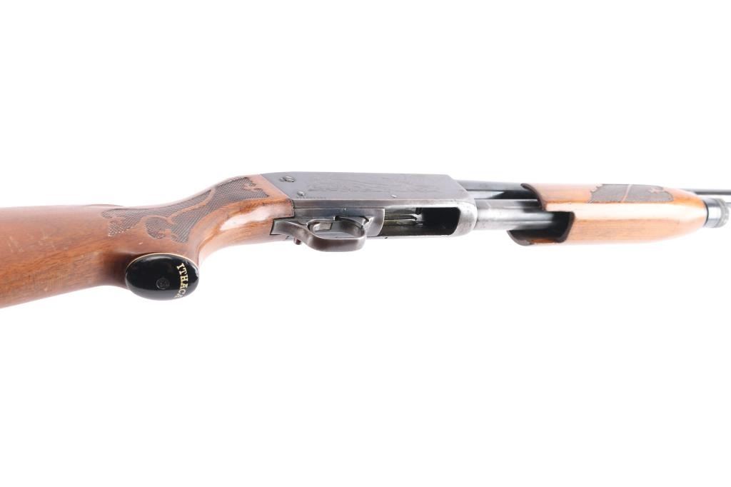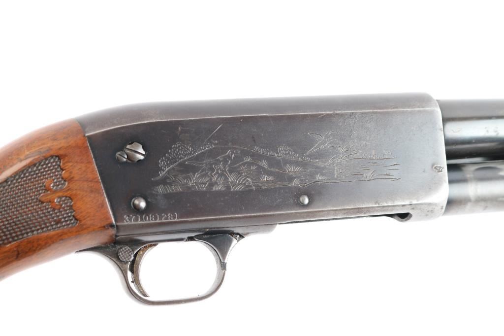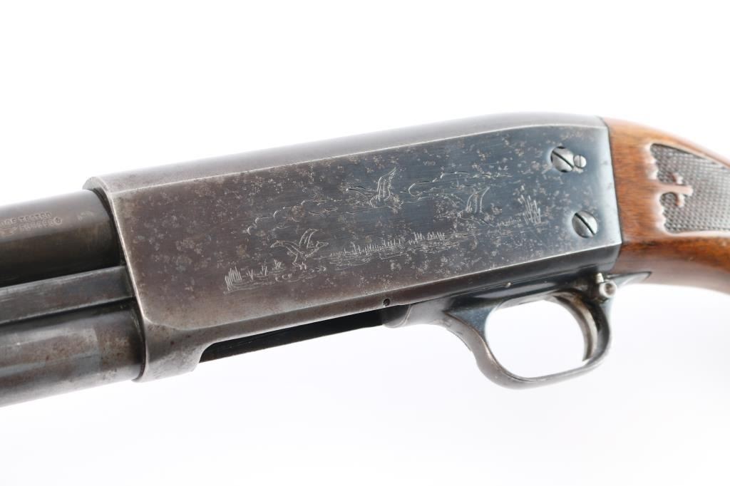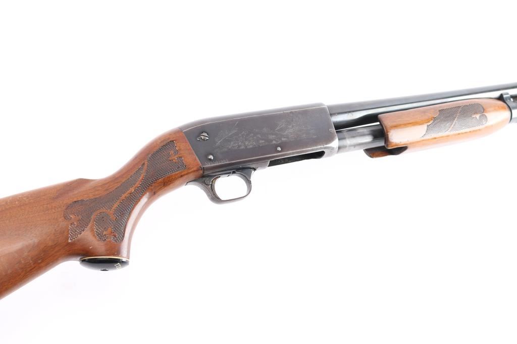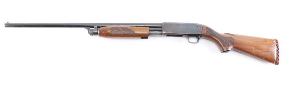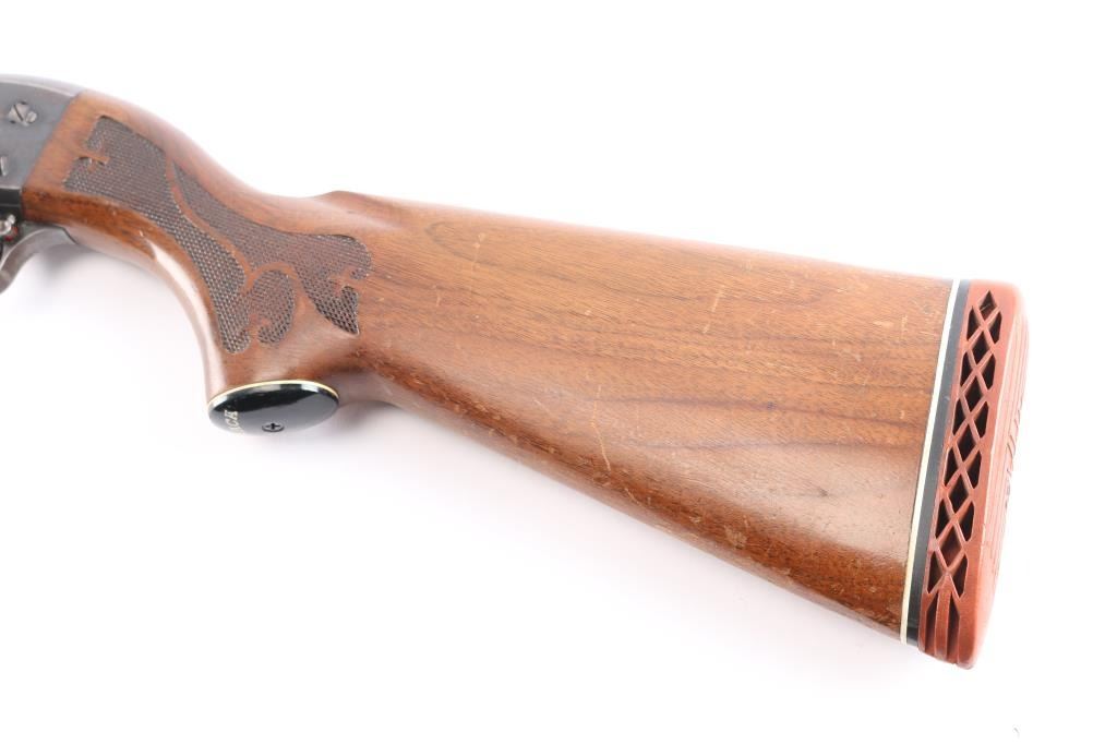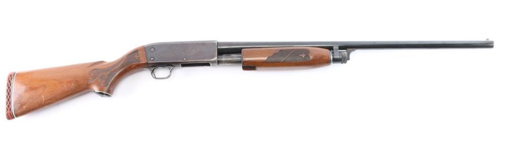 American made 'Featherweight' slide-action 12 Gauge shotgun chambered for 2 3/4" shotshells. Manufactured circa 1969 in Ithaca, NY. Featuring a 26" round barrel, blued finish, bore measures 'CYL' (drop-in gauge), orange fiber-optic front sight, five round tube magazine, smooth curved trigger, bottom eject, and checkered push-button safety. The walnut furniture consists of a semi-pistol grip shoulder stock, floral checkering at the wrist, floral checkered forearm, factory red ventilated recoil pad, 14" length-of-pull, and black grip cap with white spacer. The receiver displays limited coverage of dog and waterfowl scenes roll stamped on both sides. The action is smooth and crisp, with a bright and shiny bore. The original blued finish retained is approximately 45% with heavy wear on the receiver, pin prick pitting on receiver, edge wear, and thinning. Furniture wood is good with scattered scratches, dents, and handling wear.