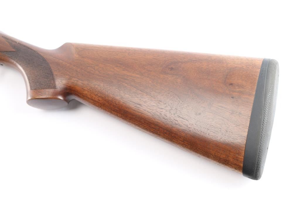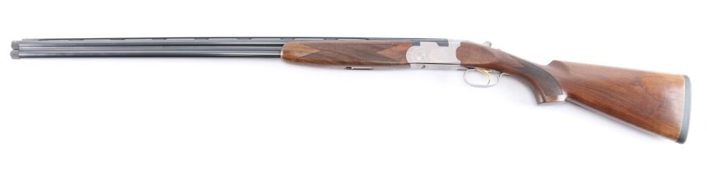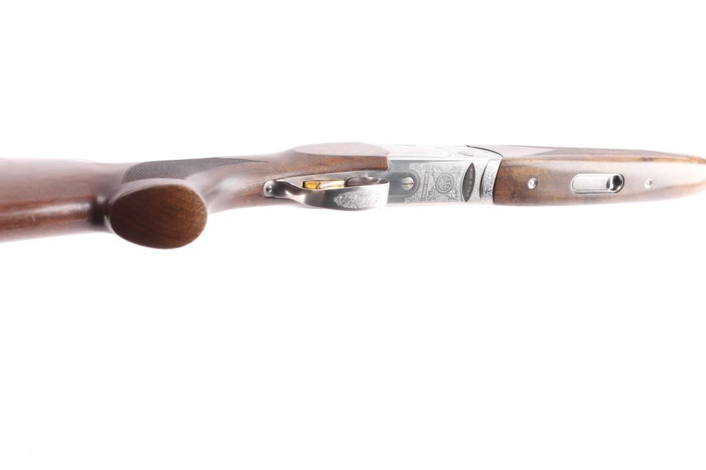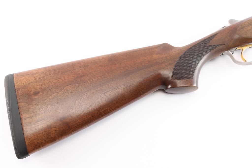 'Baby Frame' Italian made under and over box-lock double barrel shotgun chambered for 2 3/4" 28 Gauge shells, manufactured circa 2014 ('CM' date code). Features blued 30" vent-rib barrels, accepts choke tubes with extended Imp Cyl / Imp Cyl installed, steel bead front sight, selective automatic ejectors, single curved smooth gold-toned trigger, serrated sliding tang safety with sliding barrel selector, and serrated top lever. Furniture consists of a satin semi-pistol grip shoulder stock with checkering at the wrist, checkered forend with deeley latch release, 14 3/4" length-of-pull, 1-1/4" drop at comb, 2-1/8" drop at heel, and a black factory 'Micro Core' recoil pad. The barrels have a high gloss blued finish. The receiver, and the rest of the coin finished components have full coverage of floral scroll engravings, and edge designs. Shotgun exhibits approximately 98% of its original blued finish with a few very light scattered scratches on the right side of the barrel. The receiver is excellent displaying only superficial scratches. Action is crisp and smooth with the top lever resting slightly left of center, and the bores look excellent, but are dirty. Furniture wood is Excellent with a few extremely light scattered blemishes. Shotgun includes grey factory luggage style hard case.