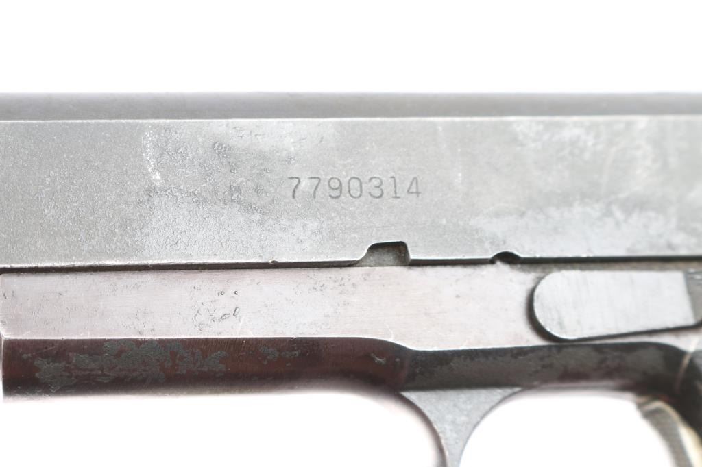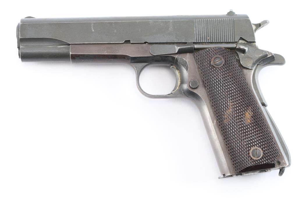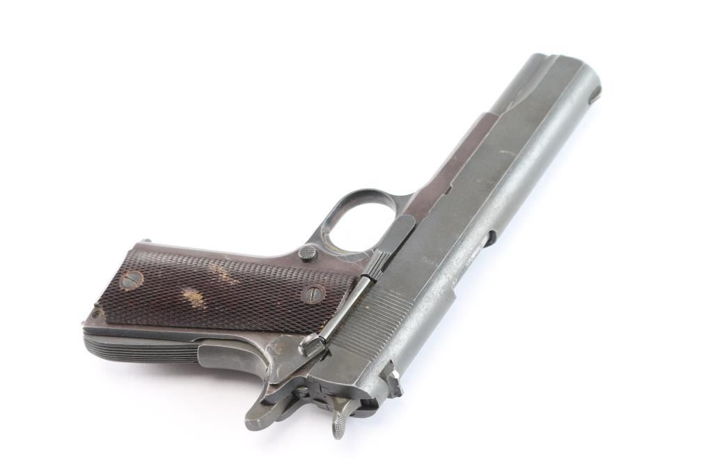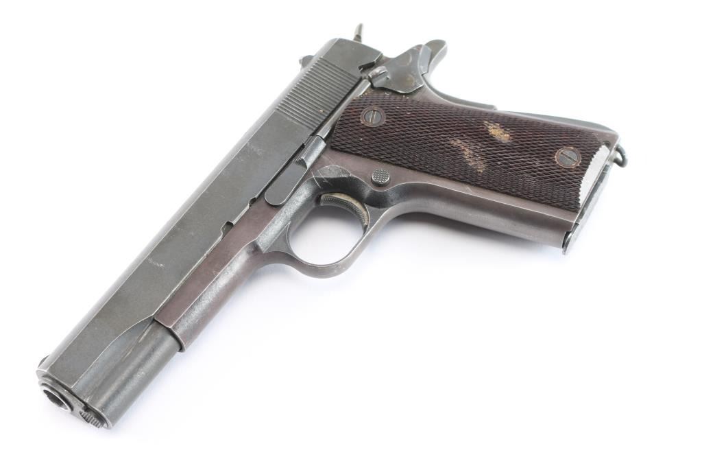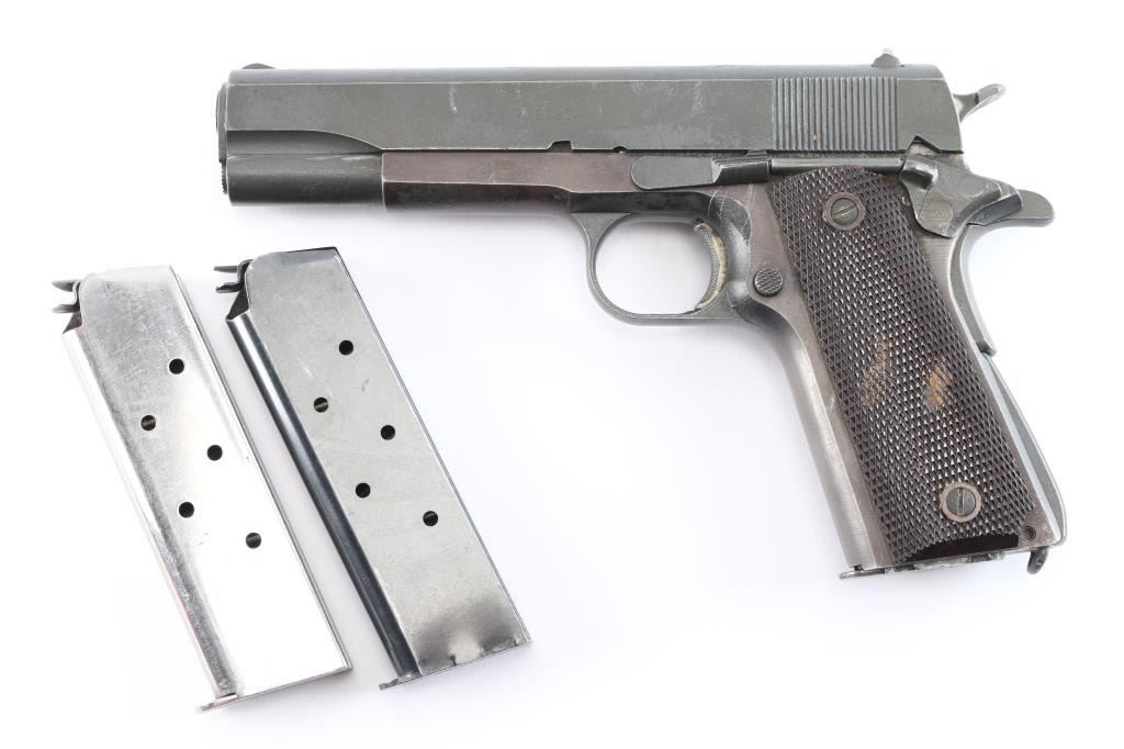 A 1911-A1 semi-automatic pistol chambered in .45 Automatic Colt Pistol. Consisting of mostly GI parts, it features a blued finish, standard sights (rear sight corners relieved), checkered trigger, checkered hammer spur, serrated mainspring housing, manual safety, beavertail grip safety, push button checkered magazine release, and two piece checkered brown plastic grips (Keyes style U.S.G.I. replacement grips). Includes three total 8 round magazines, one looks G.I., a Randall, & one Colt magazine. Slide bares a matte blue finish. The pistol retains approximately 94% of its finish with light handling wear with, scattered scratches, and edge wear. The frame is turning plum. The action is smooth and crisp. The bore is dirty, but appears bright with strong rifling. The plastic grips are very good with a substance in the checkering. This firearm is covered with dried oil, or CLP from storage.
