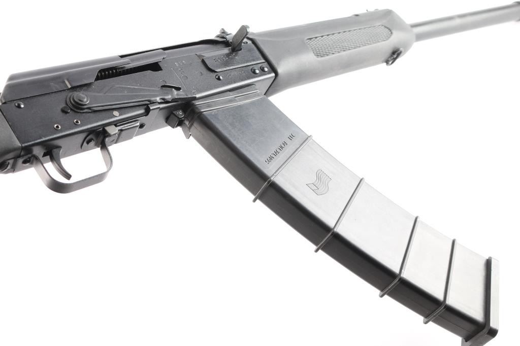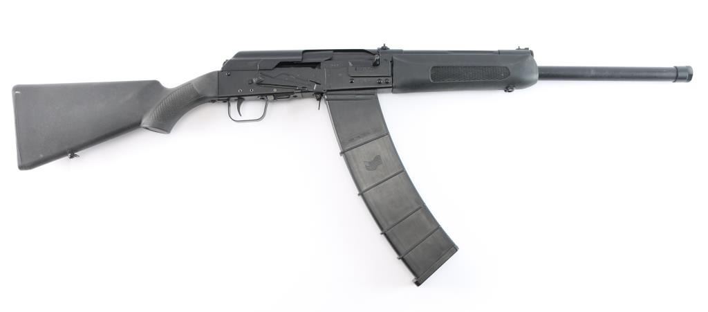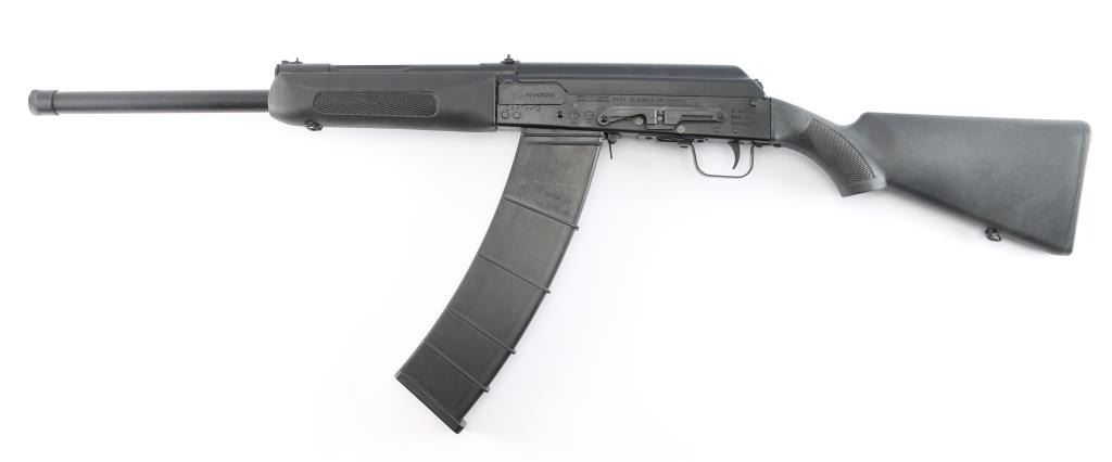 #H11428206 Shotgun. Semi-automatic. Russian made, and imported by U.S. sporting goods. 1997-present. AK style. 19" barrel, with open iron sights. Threaded muzzle. Black metal finish. Checkered black synthetic pistol-grip stock, and fore grip. Bore appears excellent/bright. Action is crisp/tight. Stock, and metal are very good, with some minor scratches/rubs. Comes with a SGM Tactical 12-rd magazine.