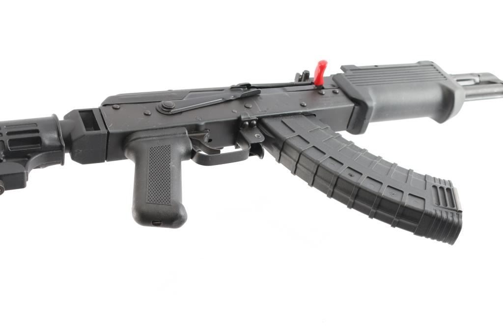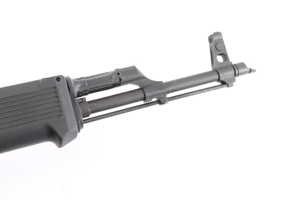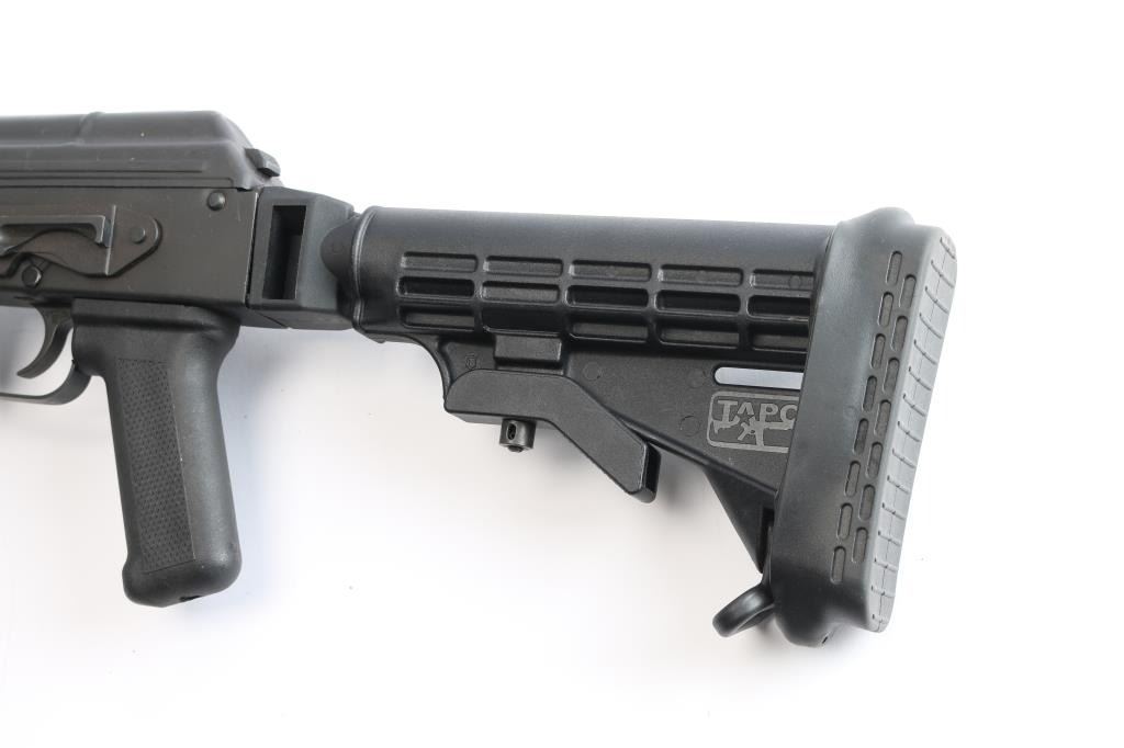 #RG9071 Semi-Automatic. Romanian made, imported by CAI. 1986 dated. AK style. Single-stack receiver, chrome lined barrel. Pistol grip, trigger housing, slant muzzle brake, and gas piston were replaced with U.S. made parts to comply with US regs. 16" barrel, with red front post, rear tangent. Tapco trigger, cleaning rod, Lever safety. Parkerized finish, Black synthetic Tapco forearm, and adjustable stock. Bore is excellent/bright. Action is smooth. Furniture is excellent. Metal has some minor scratches/rubs, Comes with a 30-rd Tapco magazine. Original factory box with matching label, wood furniture for rifle, and a black synthetic spare pistol grip.