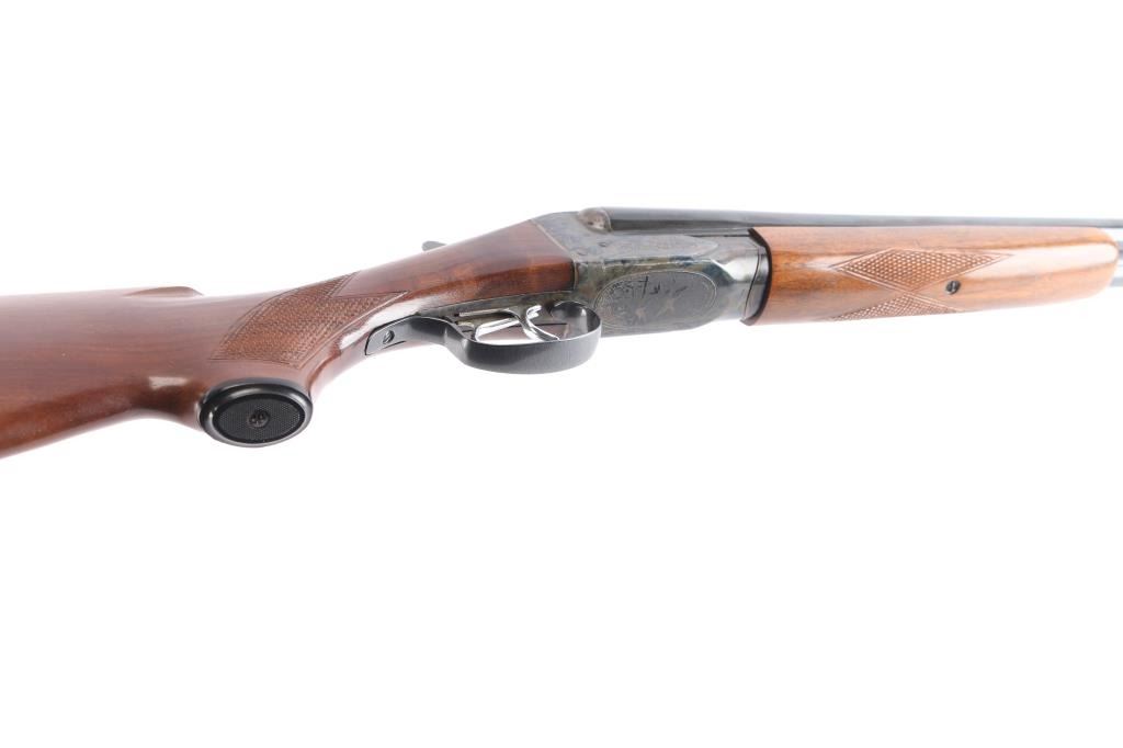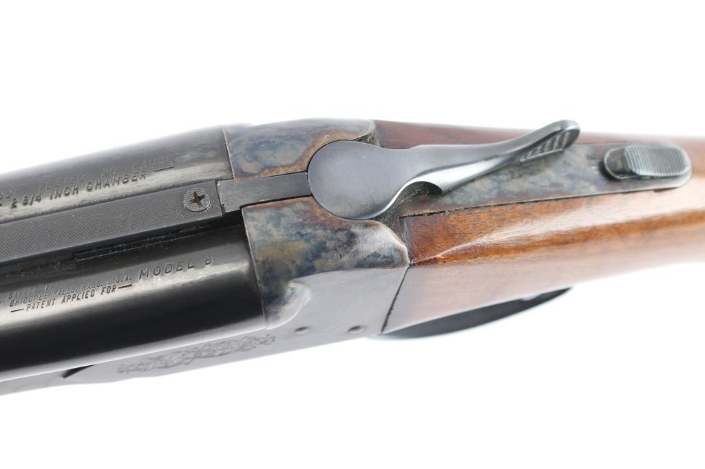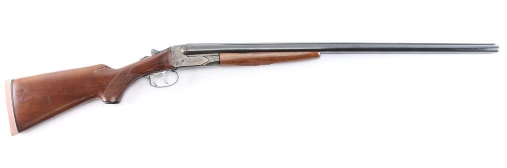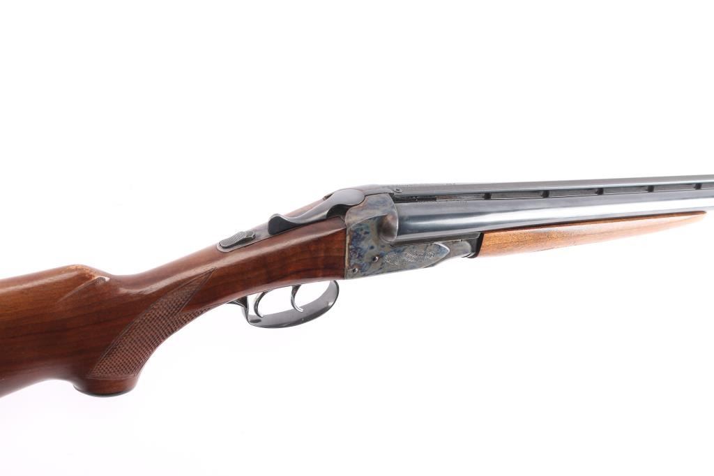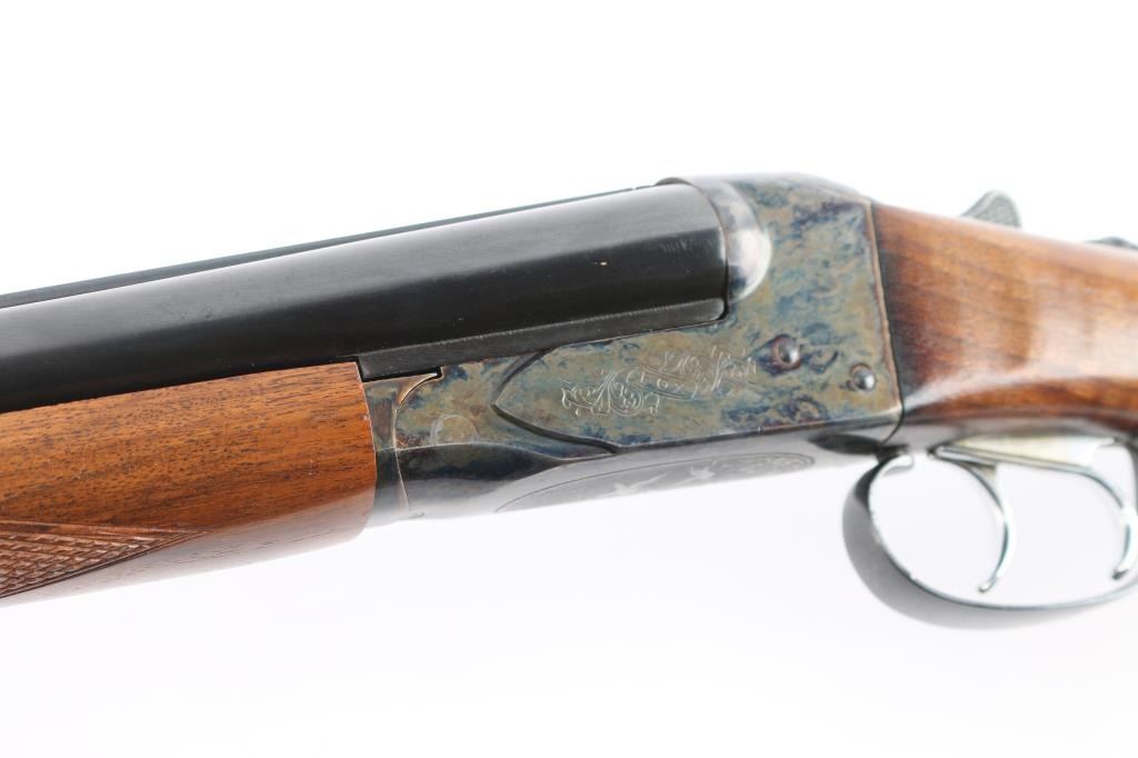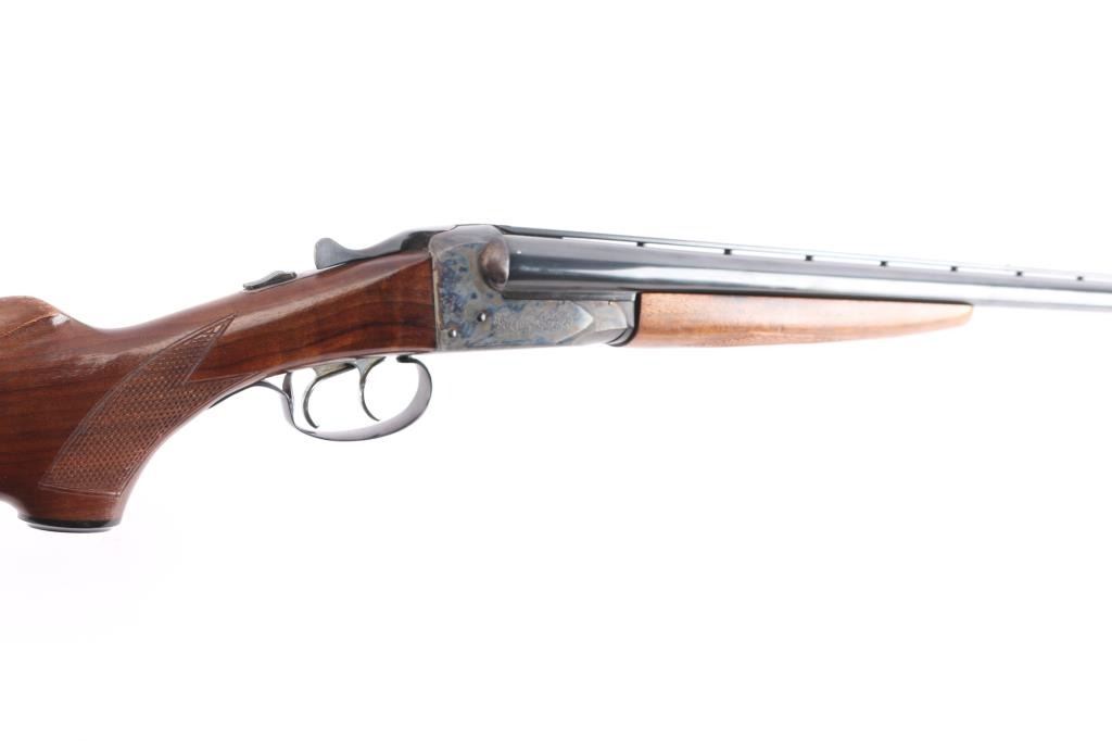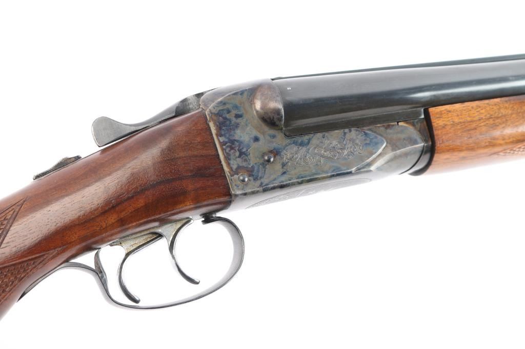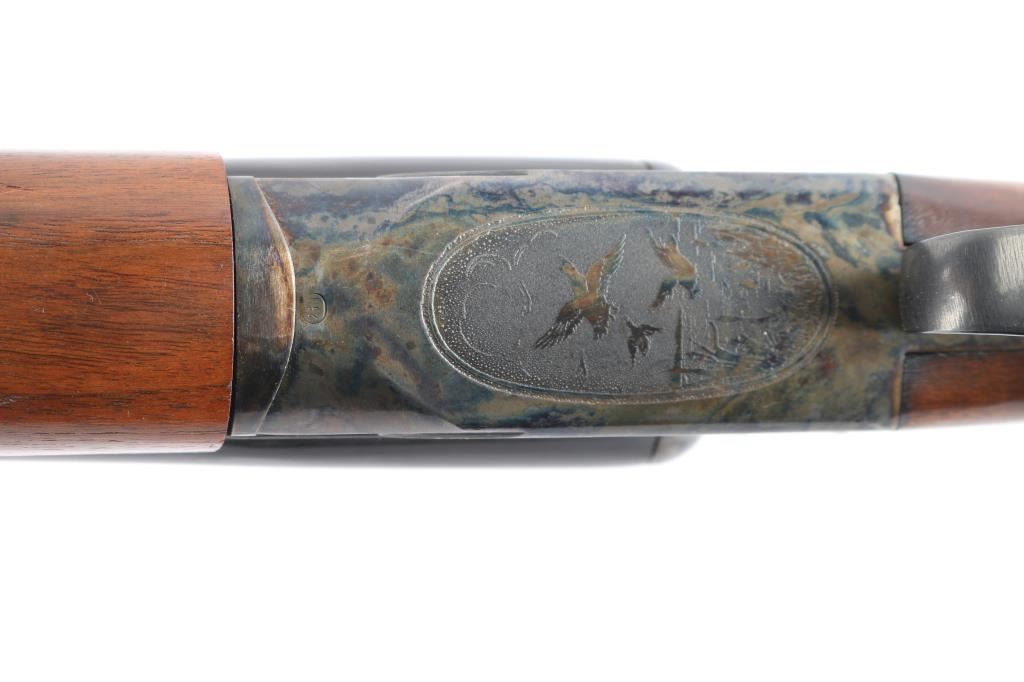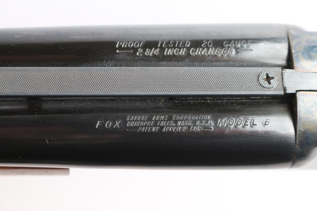 Fox Model B side by side double barrel 20 gauge box-lock shotgun by Savage Arms manufactured between 1939 and 1988 (This firearm is Pre-'68). It features approximately 28" blued raised vent rib barrels, steel bead front sight, steel bead rear sight, 2 3/4" chambers, color-case hardened receiver, serrated sliding tang safety, extractor, and dual polished silver toned triggers. The hardwood furniture consists of a semi-pistol grip buttstock with checkering at the wrist, grip cap, checkered forend, and a red Noshog solid rubber recoil pad. The receiver displays limited coverage of floral engravings on the sides with 'Fox' in the centers, and an etched water foul hunting scene is depicted on the bottom. The bores appear bright and shiny, and the action locks up tight. The original blued finish remaining is approximately 97% with thinning along the side of the right barrel, and scattered superficial scratches. The color-case hardened finish is excellent. Wood furniture is near excellent with some very minor handling marks on the buttstock. The length-of-pull is 14.5". The left bore measures 'IM,' and the right bore measures 'IC' with a drop-in gauge.