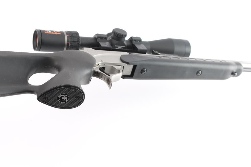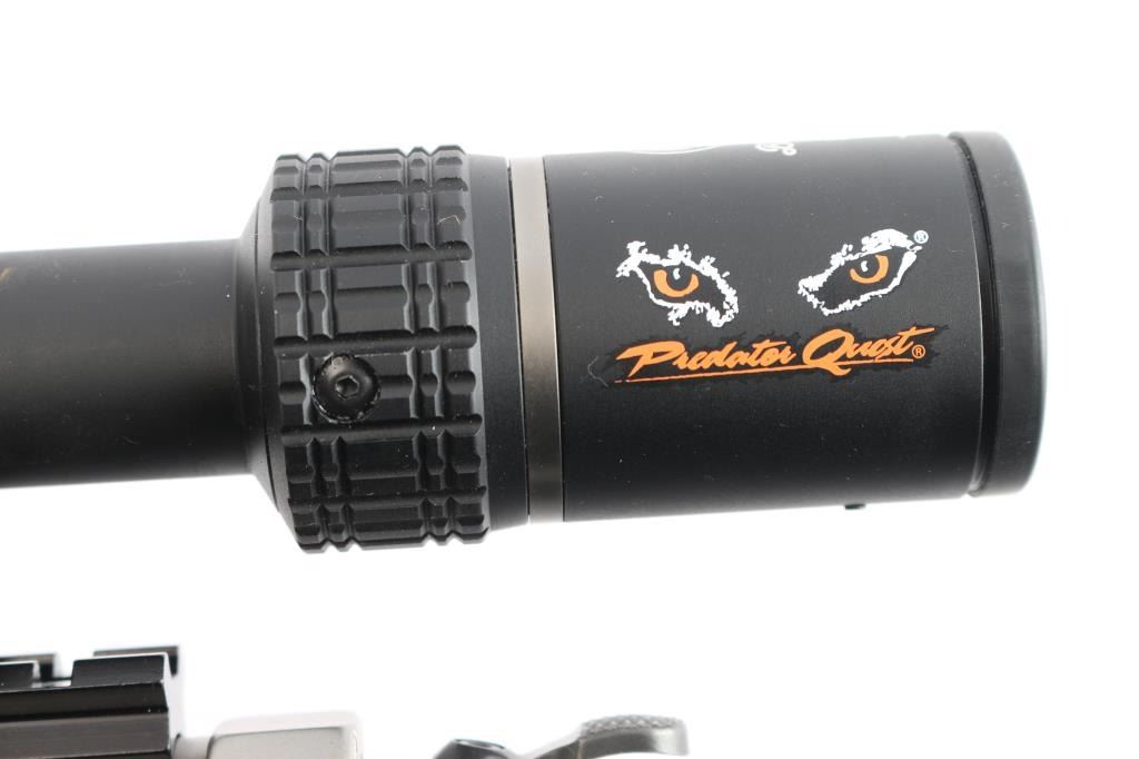 SN: PS46576. Single shot, break-barrel muzzleloader rifle in .50 Cal. using a 209 primer ignition. Satin stainless steel construction, 28" partially fluted barrel, red fiber optic front, fully adjustable green fiber optic rear sights, angle-adjustable knurled hammer spur and smooth semi-curved trigger, metal ramrod with folding handle, black synthetic thumb hole stock with sling studs and forearm with rubber panels. Mounted with a Burris 'Predator Quest' 3-9X40 scope, Ballistic Plex E1 reticle, excellent condition Bore is pristine/bright with very strong rifling. Retains approx. 98% finish with no visible losses, synthetic surfaces are excellent.