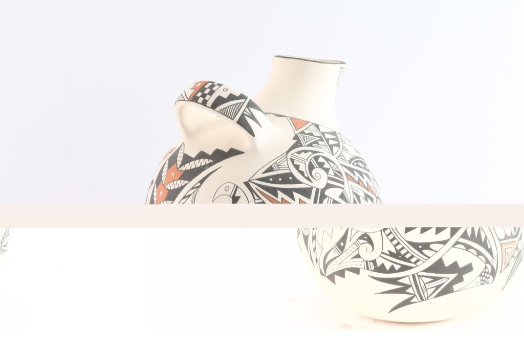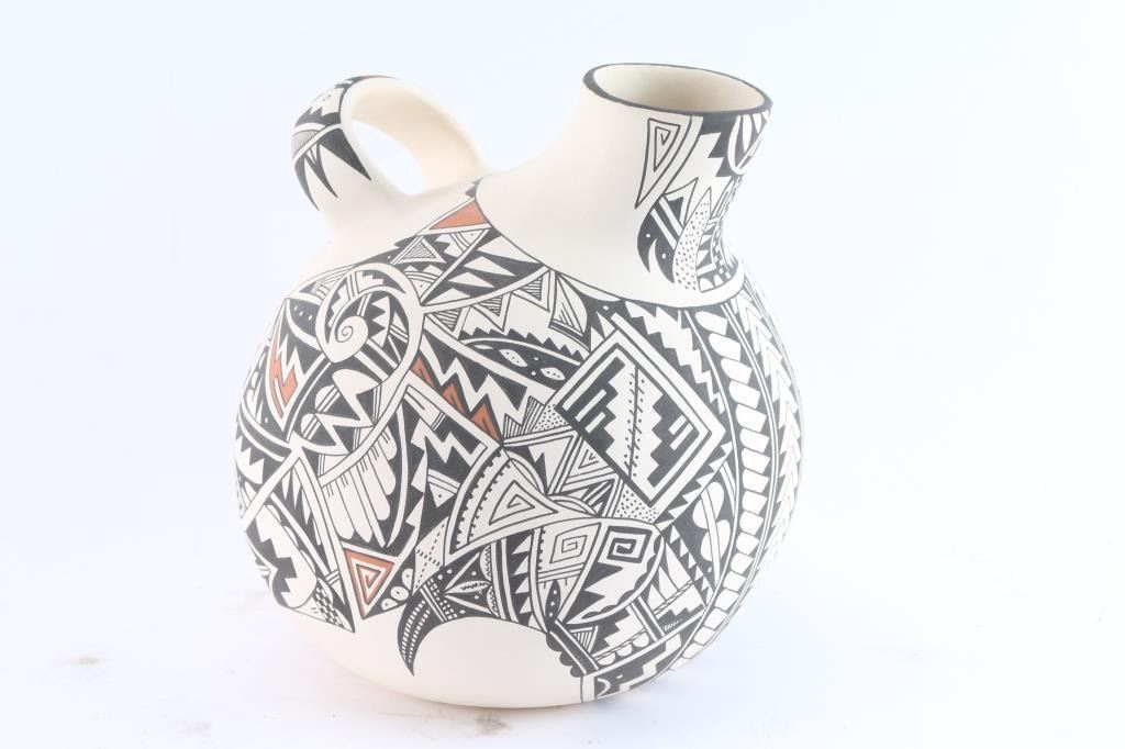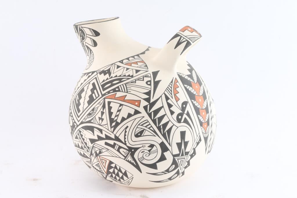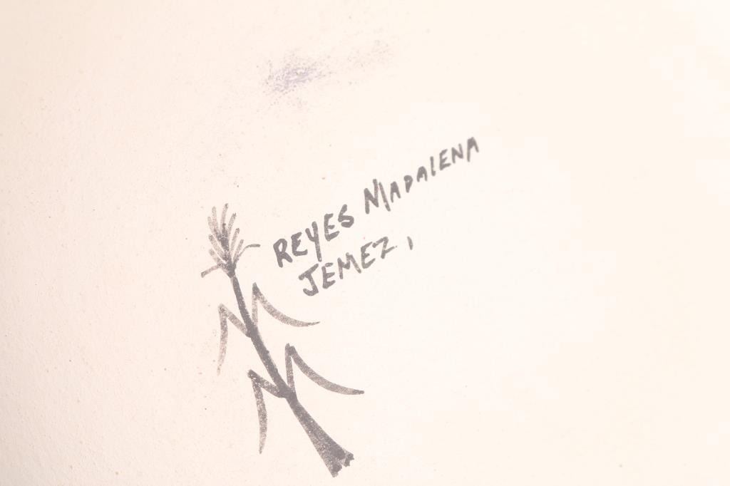 Measures 8" by 8", with off-center spout and handle for pouring. Signed by artist Reyes Madalena, a Jemez Reservation Pueblo. With copy of article on the artist printed in Moab Happenings dated May 2006.