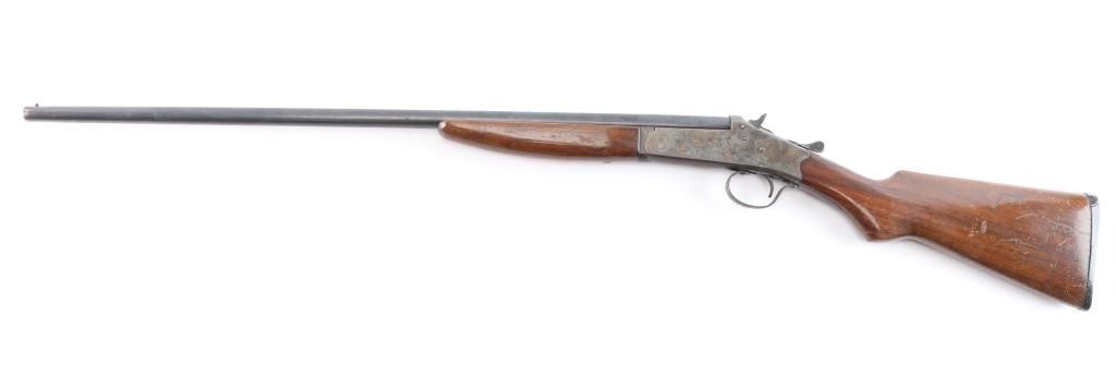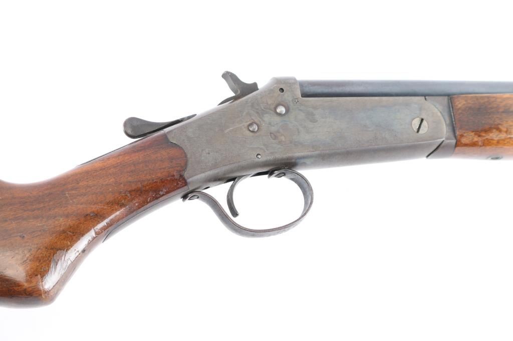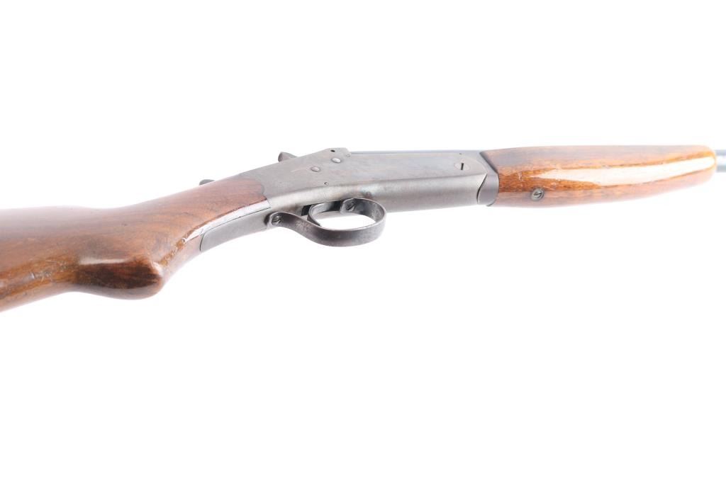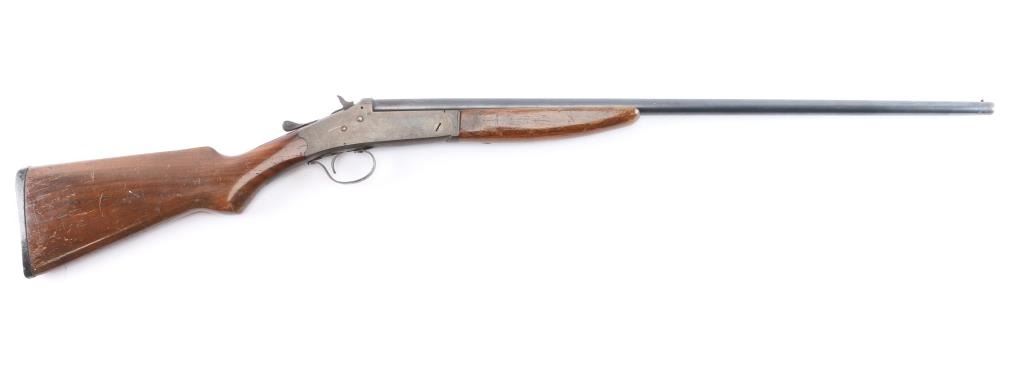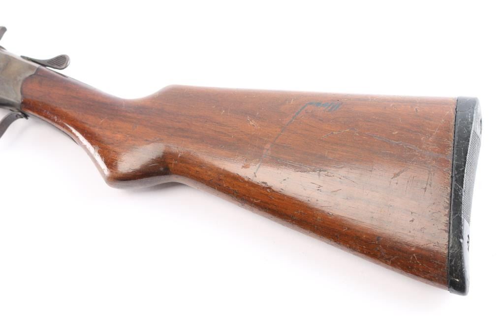 American made single shot break barrel shotgun chambered in .410 Gauge. Manufactured as a store brand, and possibly by Stevens because it closely resembles the Stevens Model 94. It is also a pre-1968 firearm because it is not serialized. This shotgun features a blued finished approximately 26" barrel, brass bead front sight, smooth curved trigger, 13 1/8" length-of-pull, 2 1/2" chamber (measured with a drop-in gauge), 'Full' .410 bore (Measured with a drop-in gauge), exposed hammer with serrated spur, checkered top lever, and ejector. The hardwood furniture consists of a smooth forend, a smooth semi-pistol grip buttstock, and a serrated black plastic buttplate. Barrel, trigger, trigger guard, and top lever are blued. The receiver, hammer, and handguard hardware are color-case hardened. Overall blued finish remaining is approximately 80% with some thinning on the small parts, light scattered scratches, some edge wear and browning patina. The color-case finish is good with colors muted. The metal exhibits some light scattered rust. Furniture wood is fair with numerous hairline cracks around the wrist, shows no heavy marks, but displays a fair amount of handling wear in the form of scratches, and finish losses. The action is smooth and crisp. Bore condition is good and mostly bright, it may need to be cleaned.