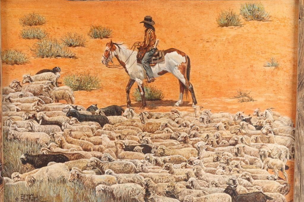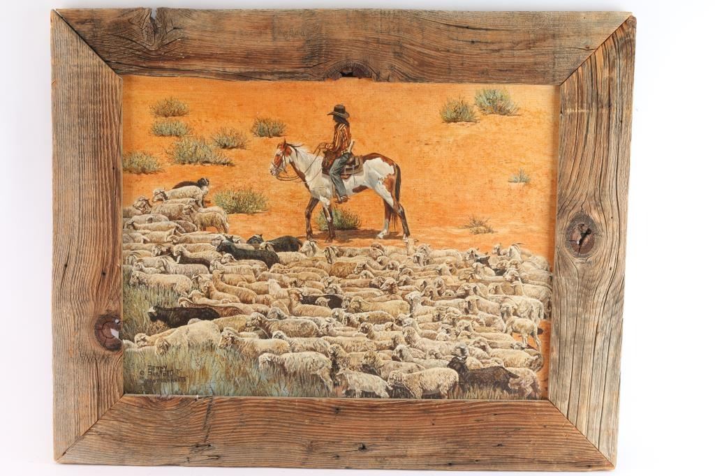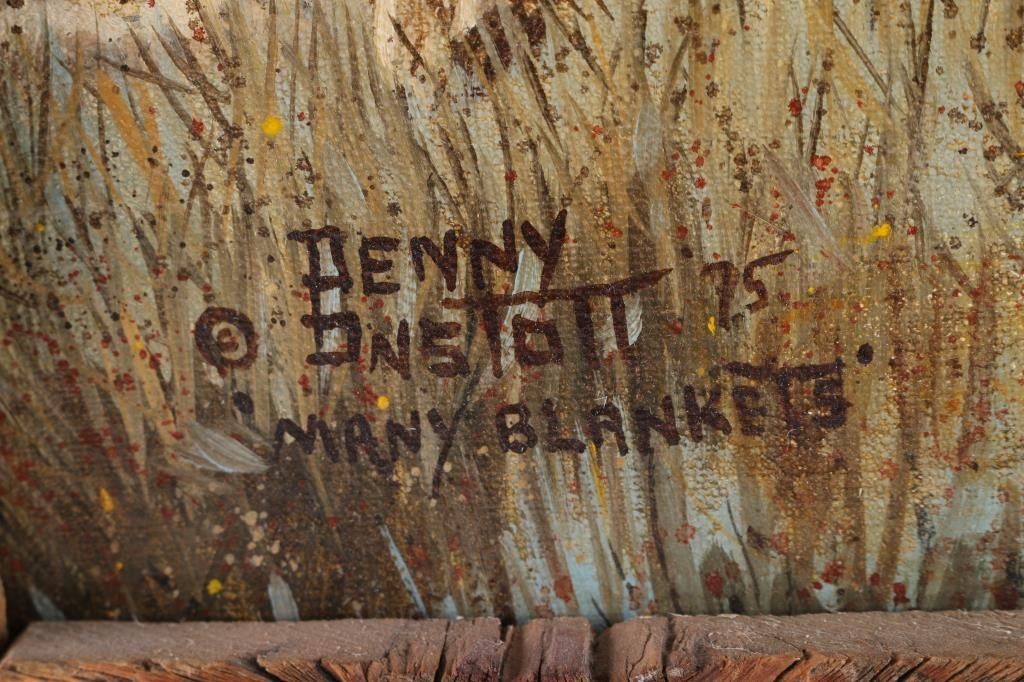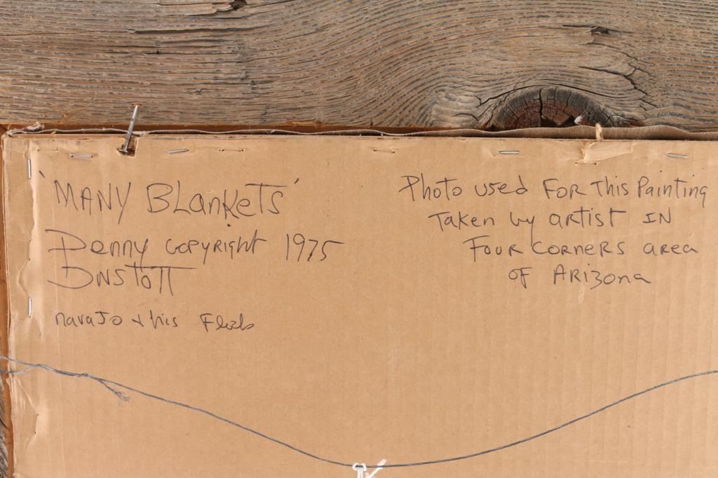 By Navajo Penny Onstott, titled "Many Blankets". Framed in 4" flat driftwood-type frame, measures 25" x 31 1/4". Originally from the Estate of Karen Nelson Smith, donated to and de-accessioned by The George Phippen Art Museum. Signed lower left corner.