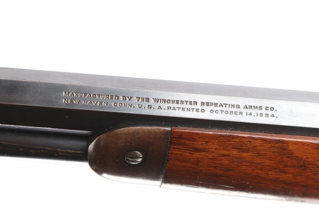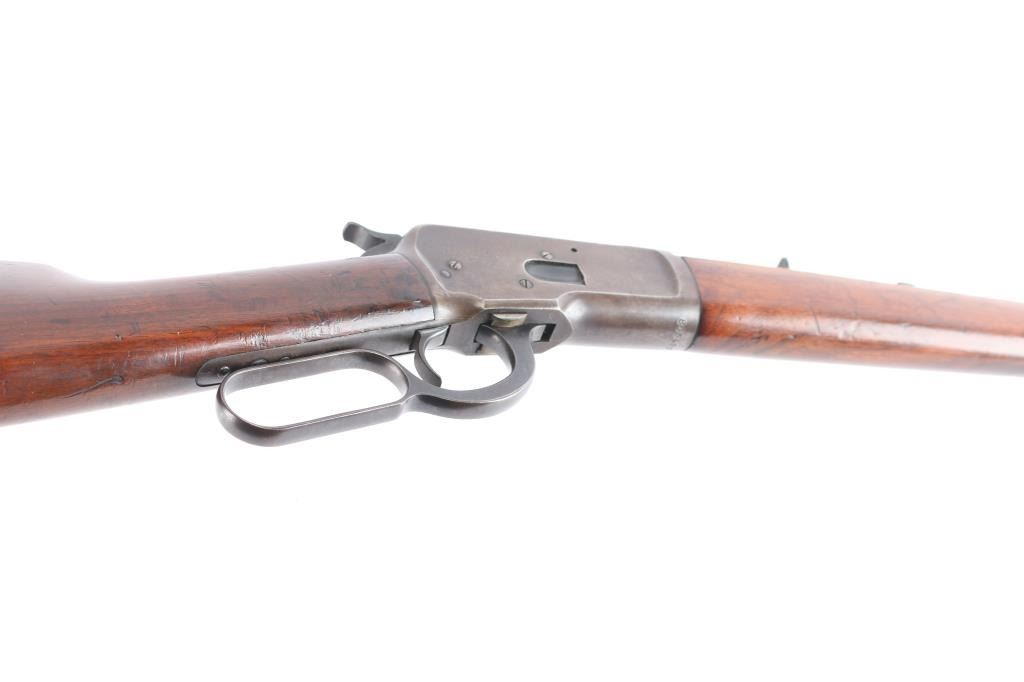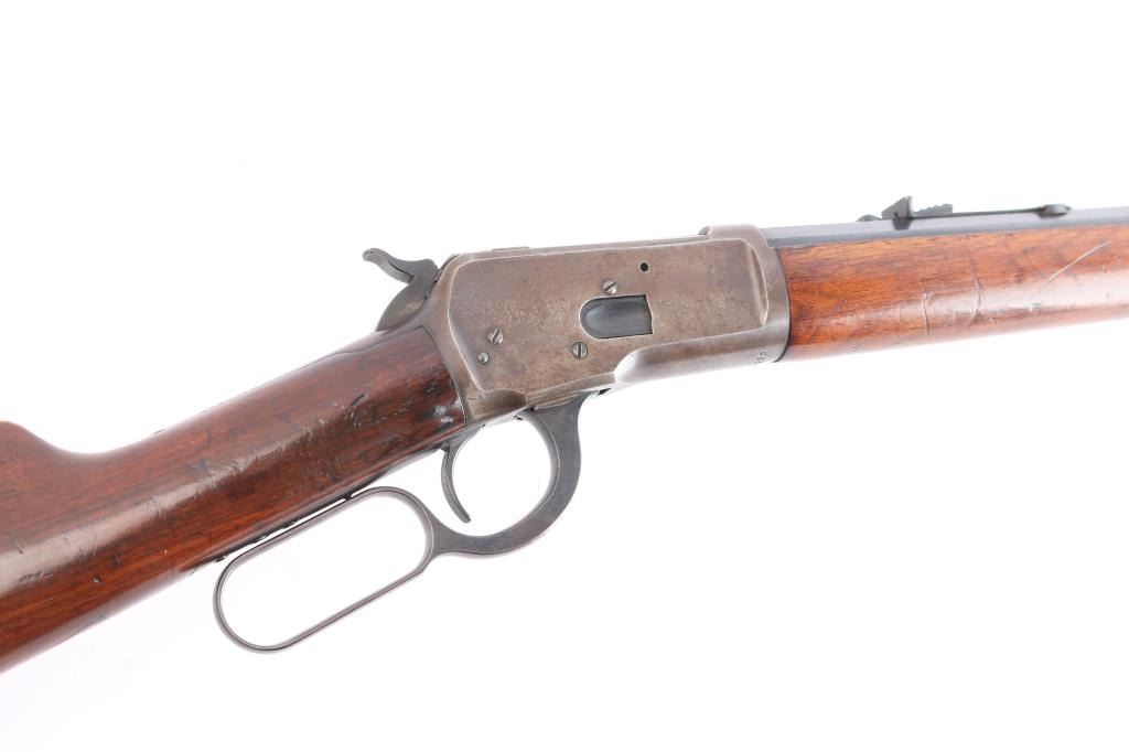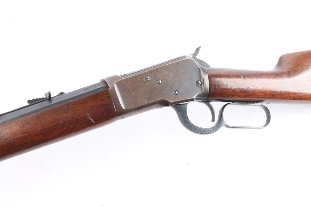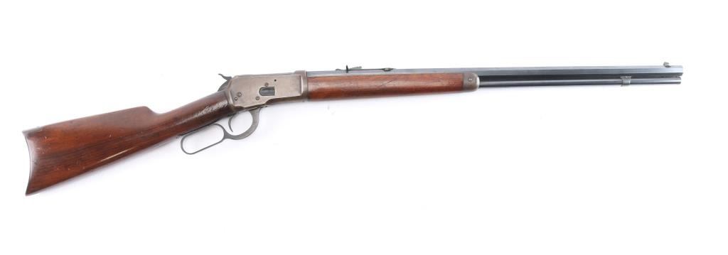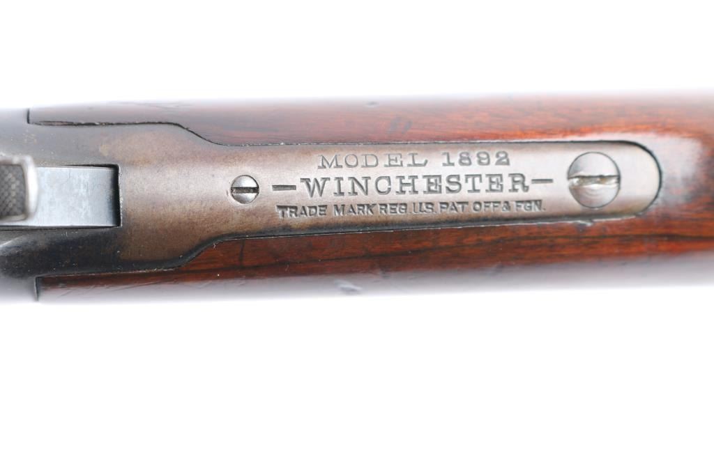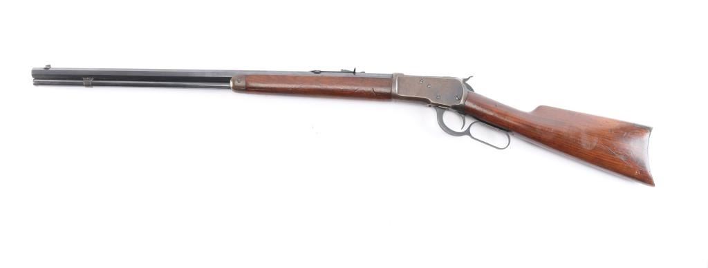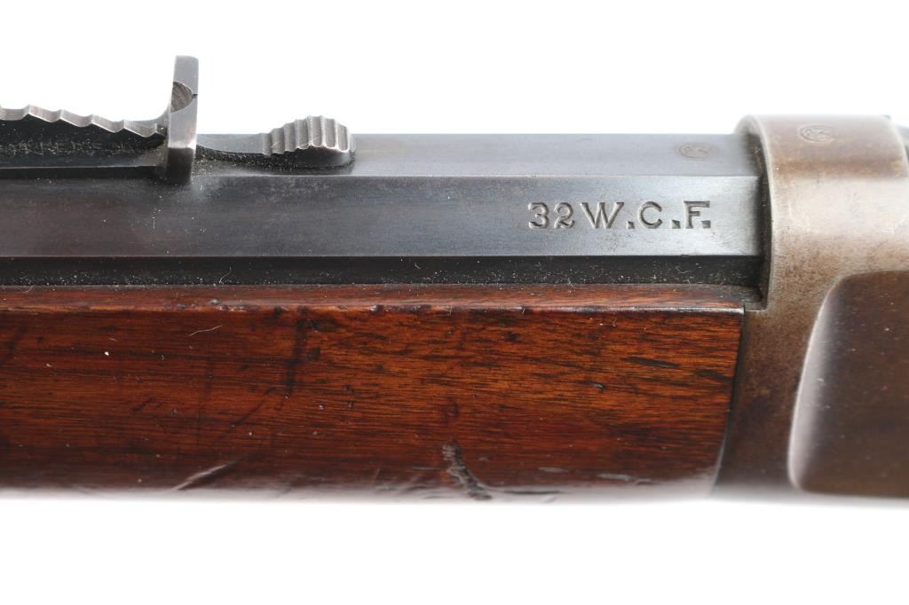 Vintage lever action rifle chambered for .32 Winchester Center Fire ammunition circa 1919. Features a 24" octagon barrel, full length magazine tube, blade/bead front sight with 1902 patent date, adjustable rear sporting sight, smooth trigger and knurled hammer spur. Two piece smooth wood stocks have a metal forend cap and a crescent metal butt plate. Blue is about 60% with edge wear, handling wear, mostly on the receiver & fore cap, receiver has mostly turned a gray/brown patina wood is overall good/sound with many scratches/dings, has been varnished at some point, action is crisp/tight, bore is very good/bright with strong rifling. Winchester markings & serial number are clear/readable.