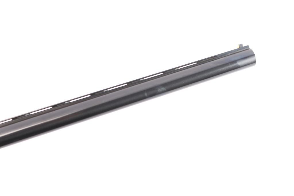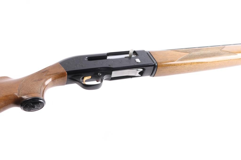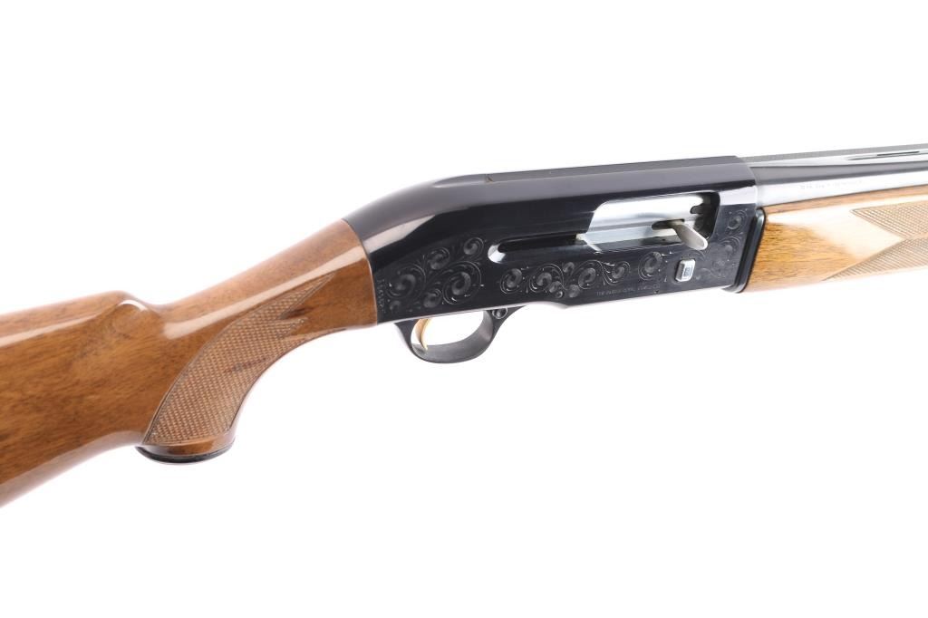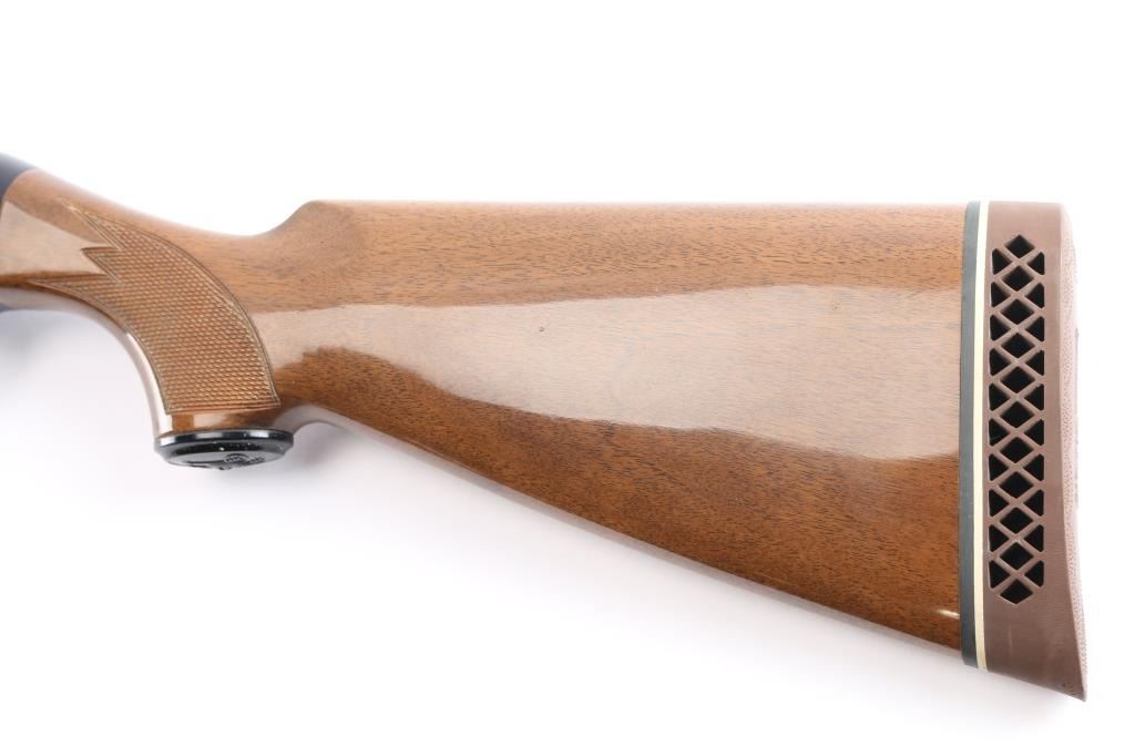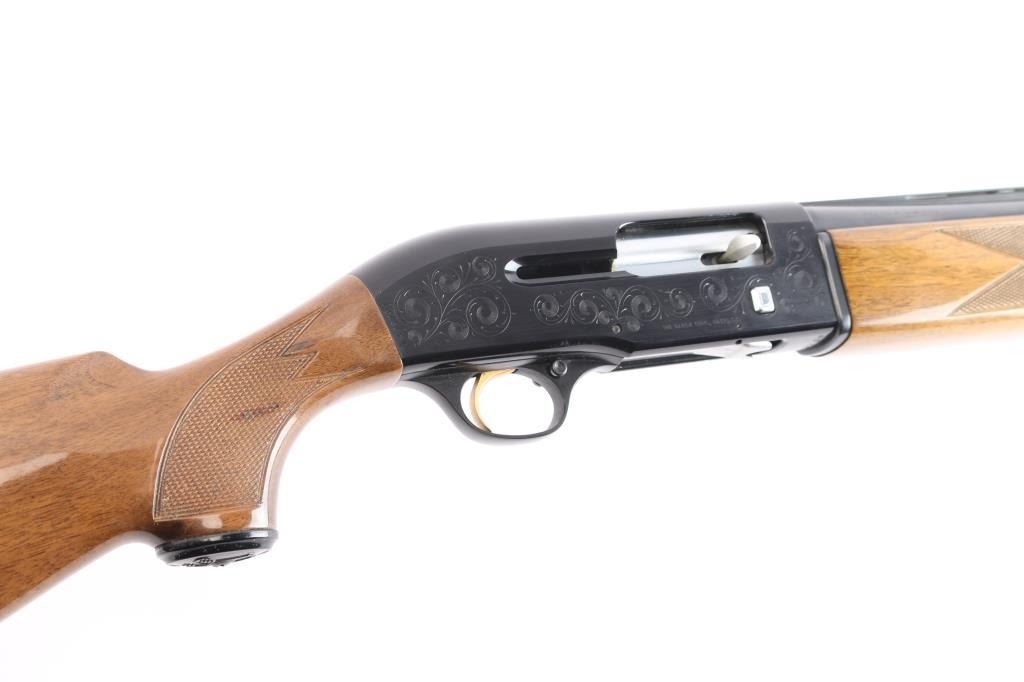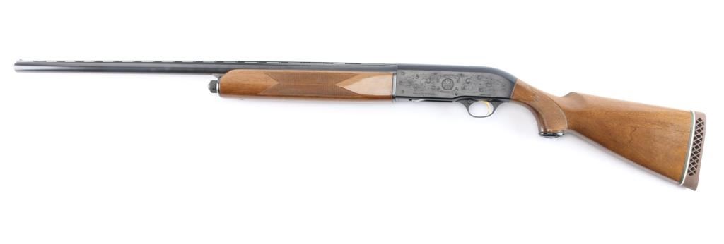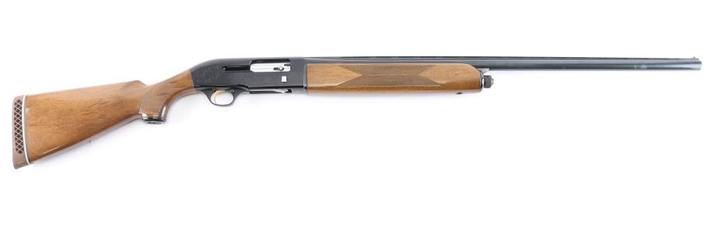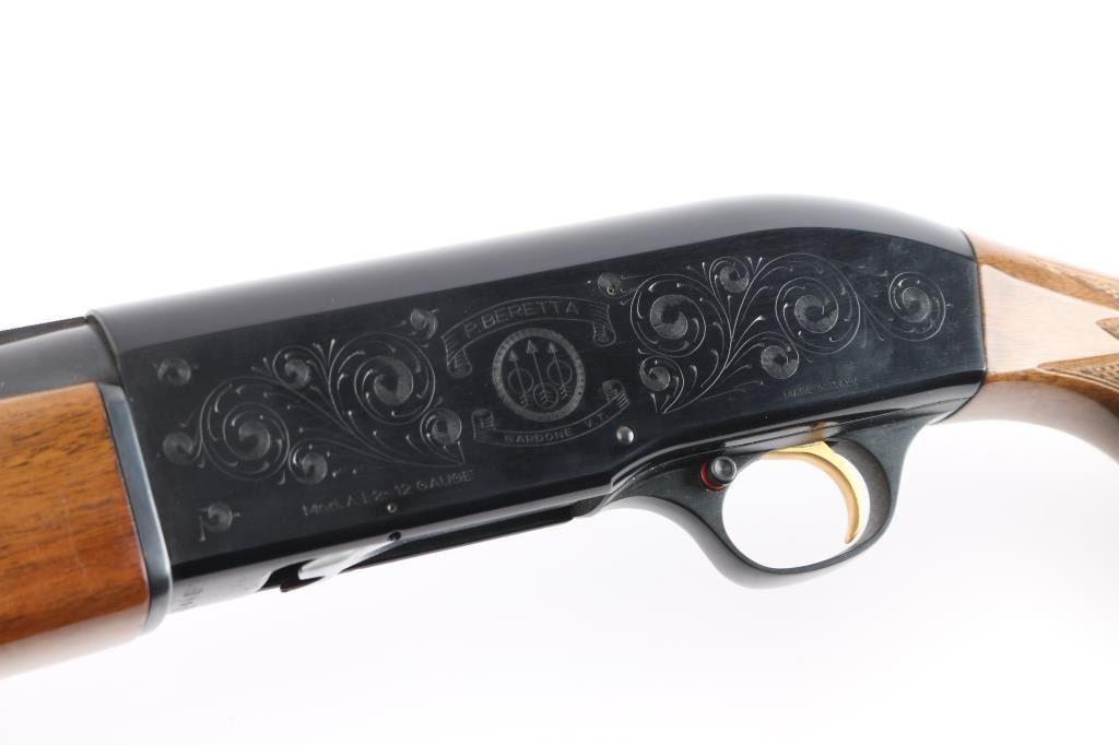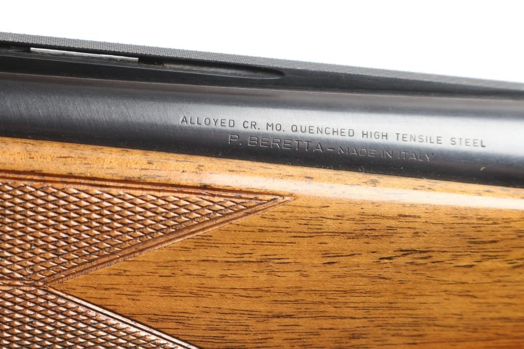 Italian semiautomatic shotgun imported by Beretta USA, Accokeek MD. Features blued finish, engraved receiver, checkered wood forend, wood but with curved grip & checkered wrist, ventilated rubber recoil pad, 30" vent rib barrel, white plastic Bradley front bead, white polymer mid bead, fixed Full choke, manual safety. Bore is excellent condition. Retains 95% blue with handling marks. Stock is very good condition. Engraving consists of majority coverage to sides of receiver, displaying a floral scroll pattern with simple elements. Approx stock dimensions: 14-3/8" Length of Pull, 1-1/2" Drop at Comb, 2-1/2" Drop at Heel.