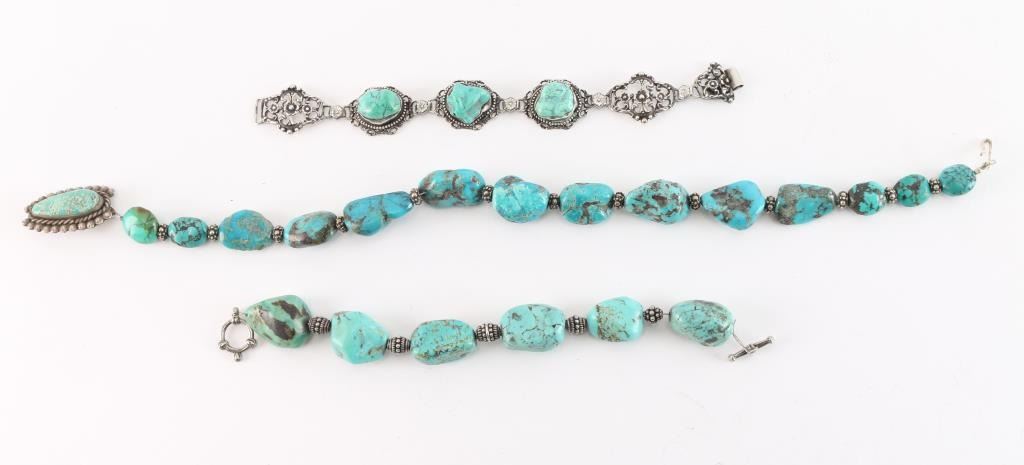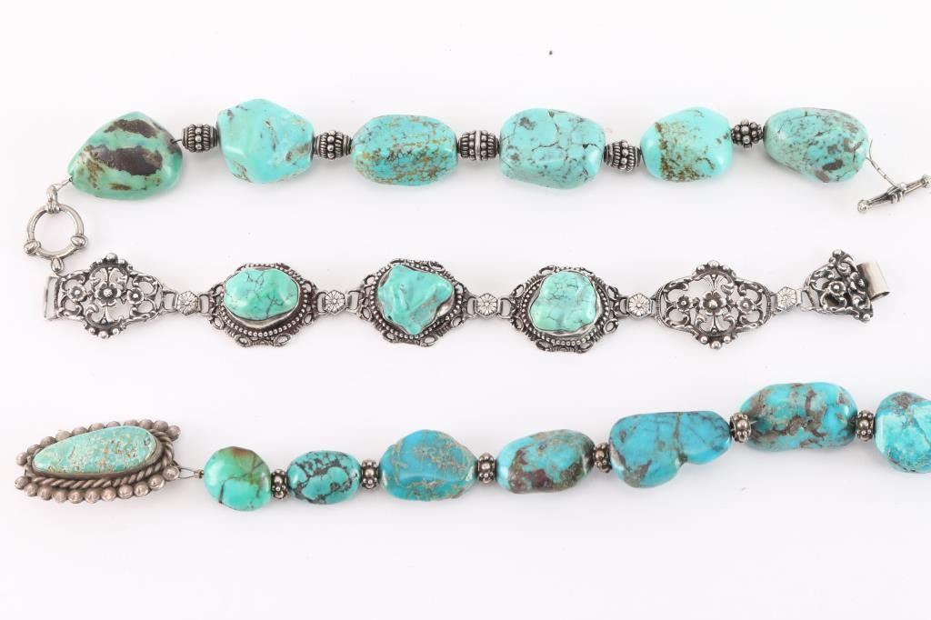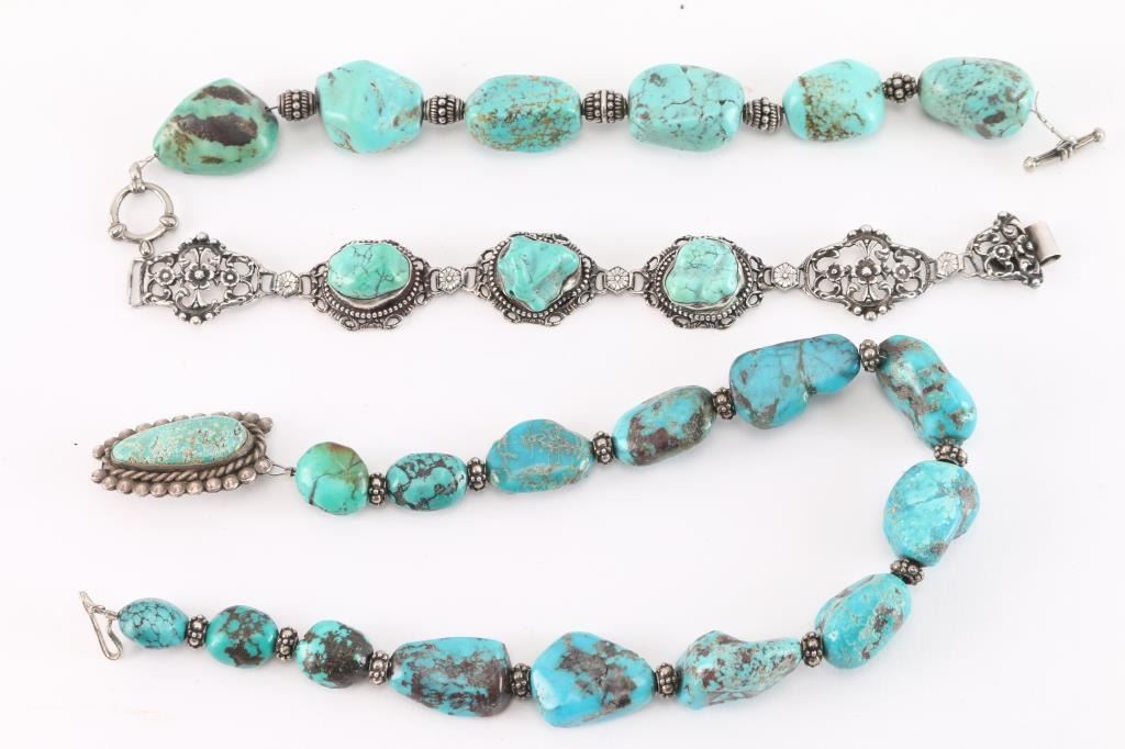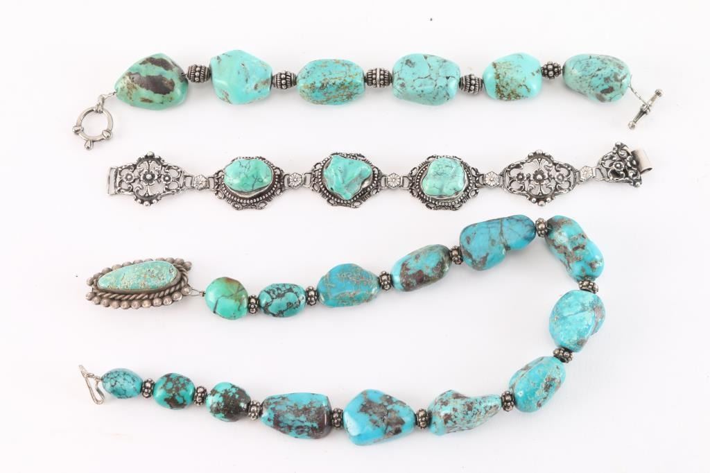 Including nugget turquoise choker with pin; and a nugget turquoise bracelet with lobster closure; and a turquoise and sterling silver bracelet with floral motif.