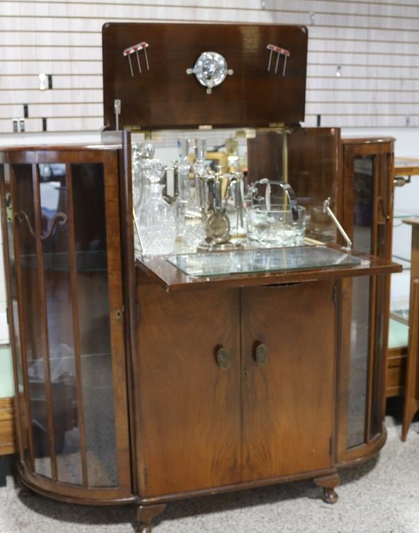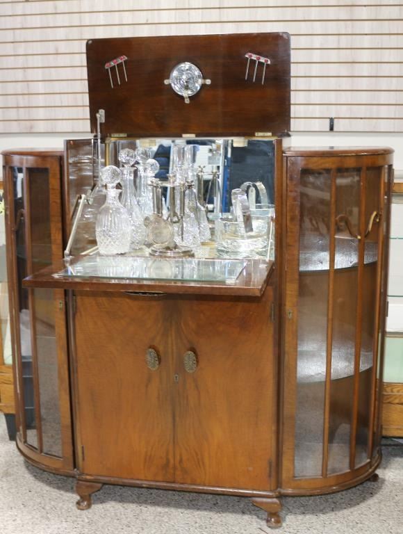 Walnut veneered cabinet with center drop down door, which shows interior glass section featuring three cut glass decanters in upper gallery, an Orrefor's Swedish ice cube bowl, a sterling plated hanging bar utensil set. Upper gallery has lemon/lime juicer, also hangers for 6 olive garnishments. Lower gallery cabinet features cutouts for glass bottles, side cabinets have 3 shelves for displaying stemware, measures 47" tall by 49" long by 15" deep. Condition is fair, some scratches and minor losses to veneer on one side.