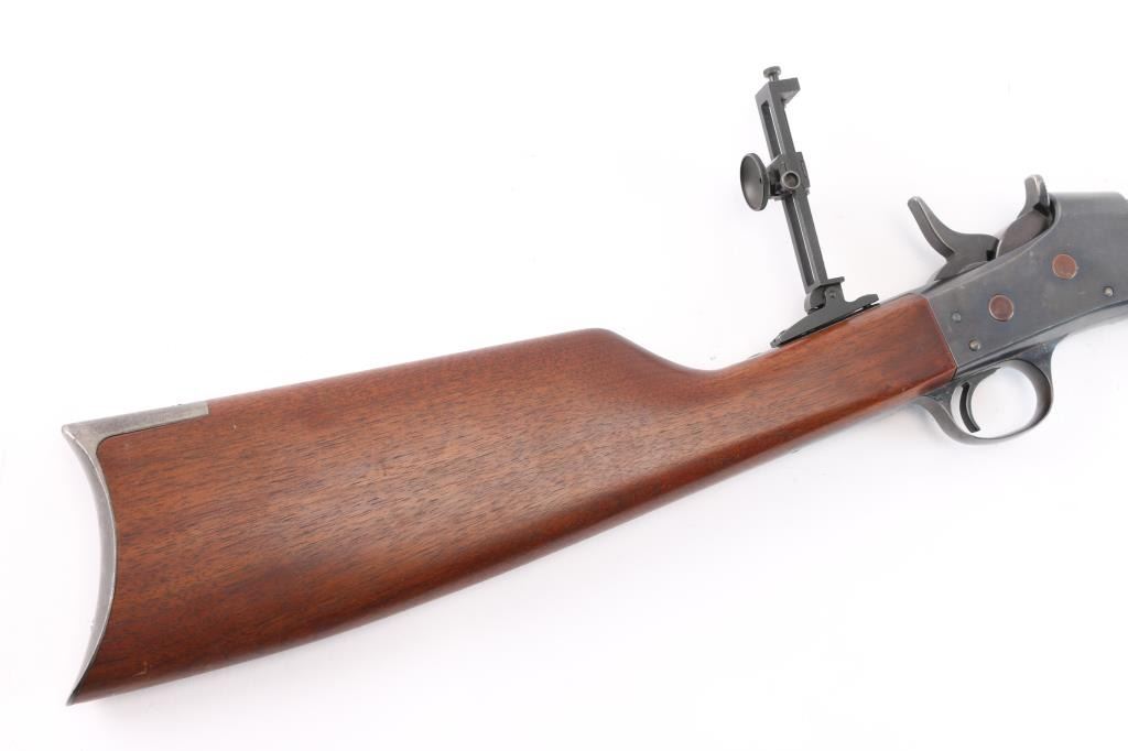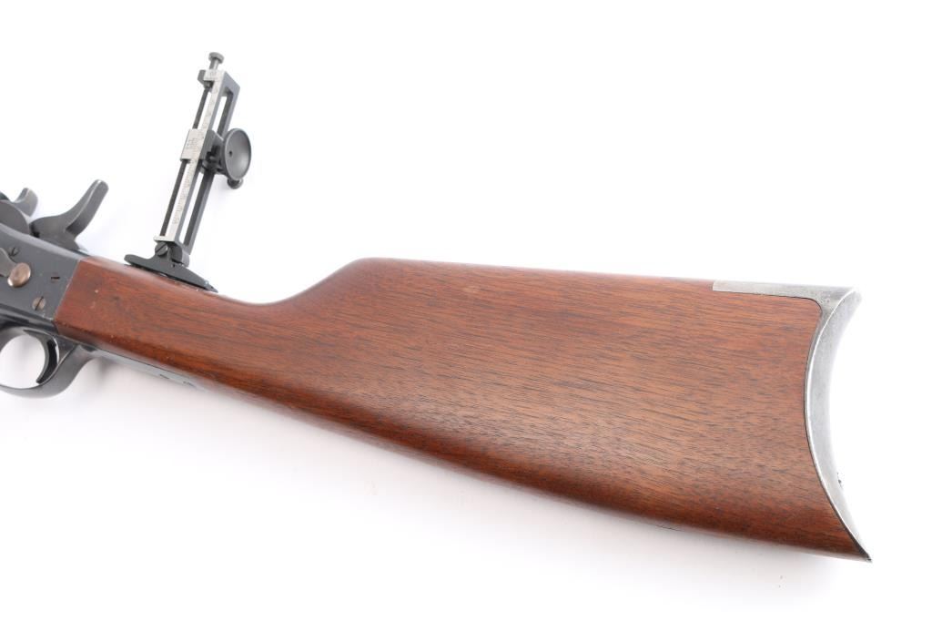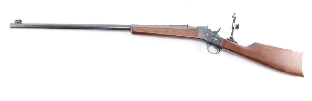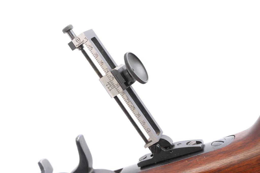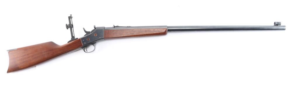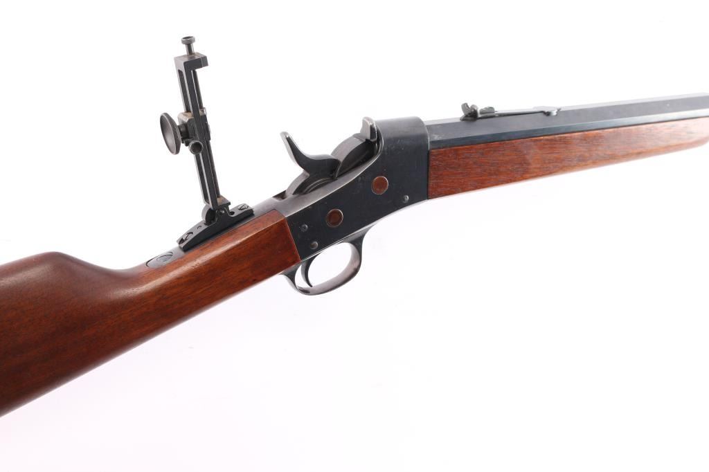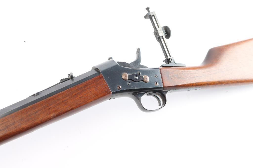 Custom rolling block single shot rifle. Features a 31 1/2" part octagon heavy barrel, globe front sight with post insert, dovetail adjustable sporting rear sight and a Pedersoli Vernier tang sight with variable aperture diopter, smooth trigger, knurled hammer spur, smooth walnut forend and straight grip shoulder stock with crescent metal buttplate. The barrel exhibits approximately 95% of it's blued finish showing some faint scattered pin prick pitting and slight edge wear. Action is smooth/tight, the bore is bright with very strong rifling, wood stocks are very good with one dent on the bottom left forearm and some on stock. Remington marked tang.