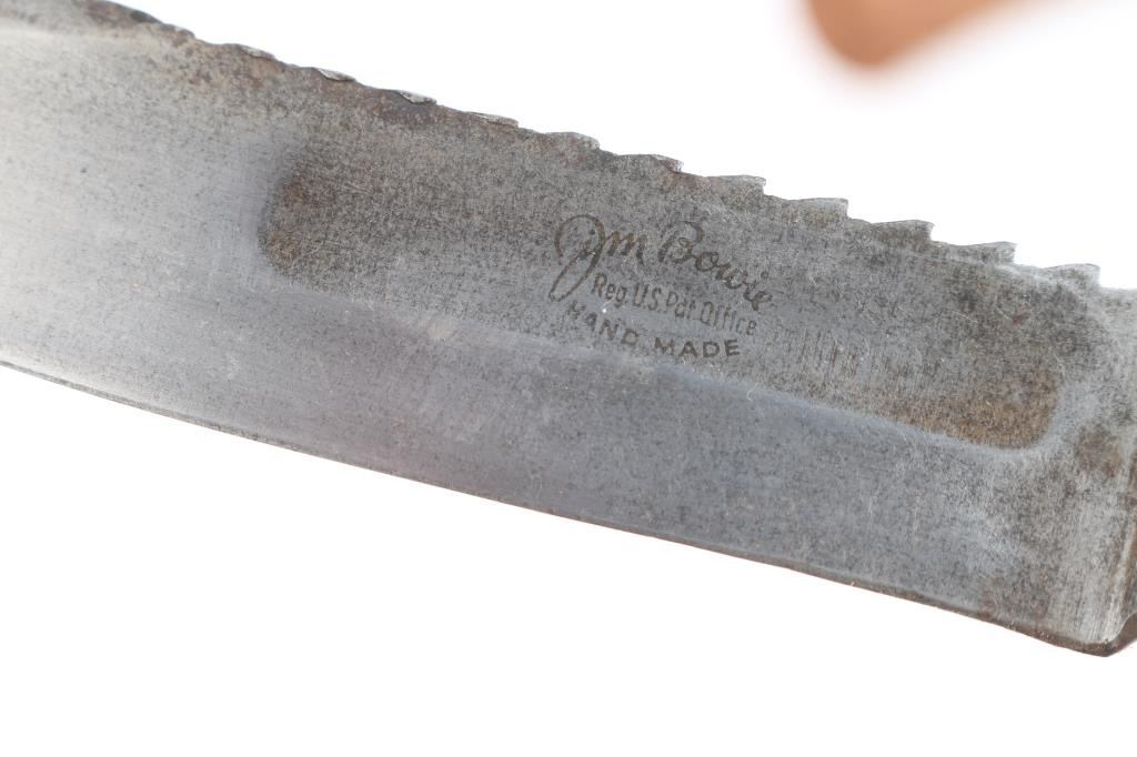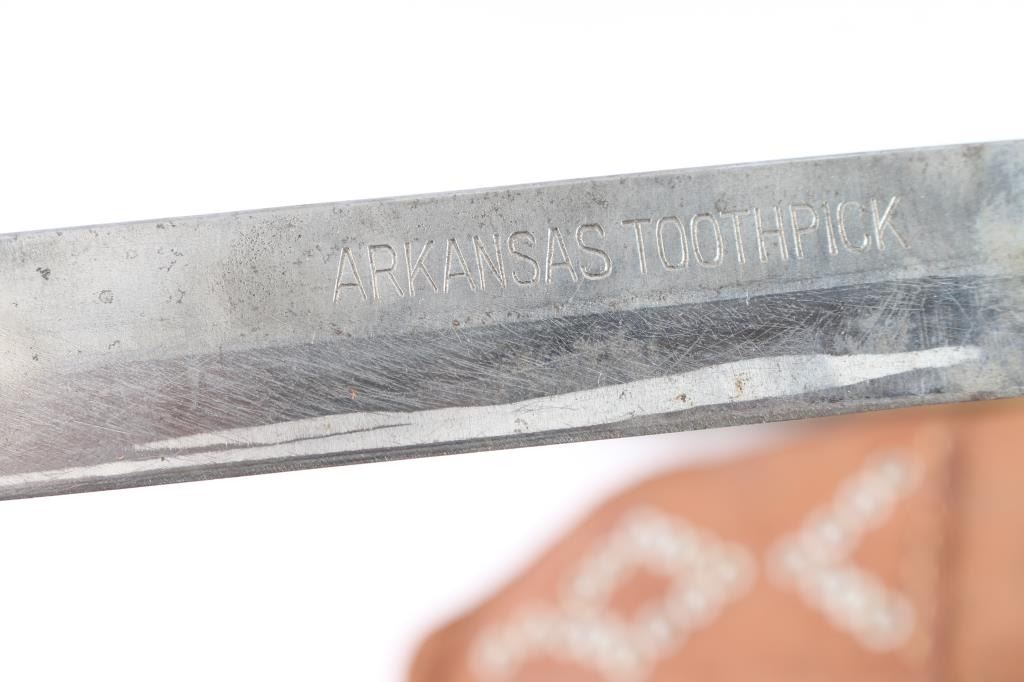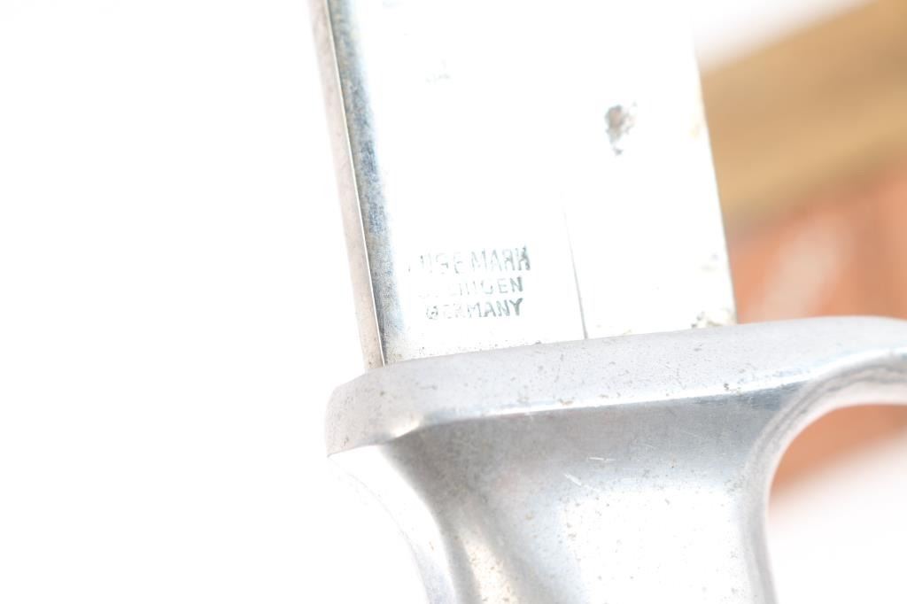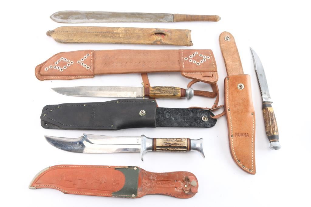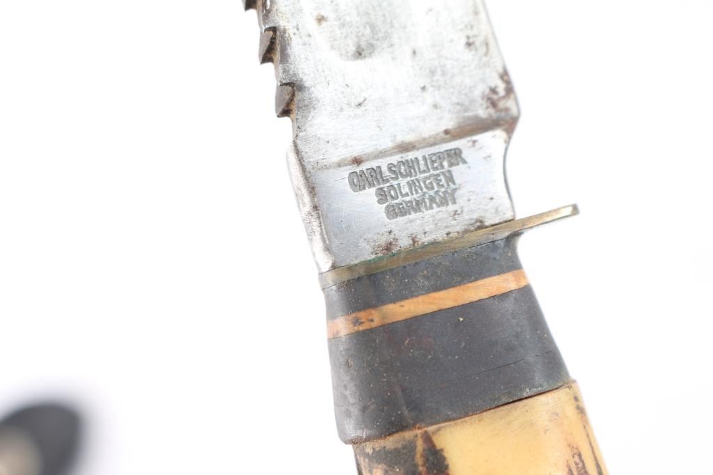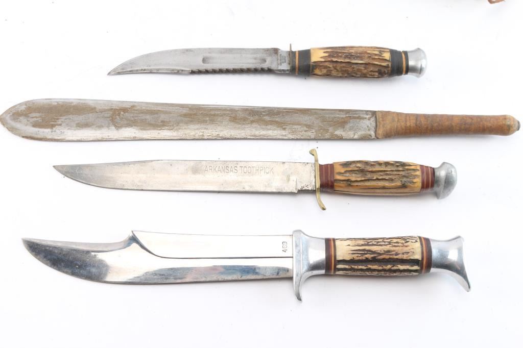 Includes: 1 - Vintage Edge Mark 469 Bowie, made in Soligen German. 8 1/4" blade, stag horn grips and steel pommel and guard. Comes w/ original scabbard; 1 - Carl Schlieper Bowie made in Soligen Germany, 6" clip point blade w/stag grips; 1 - Arkansas Toothpick, 88H, 8 1/2" blade made in Germany w/stag horn grips, brass and steel guard and pommel; 1 - Vintage African Massai short hunting knife w/scabbard & 1 - brown leather tooled scabbard w/o knife.