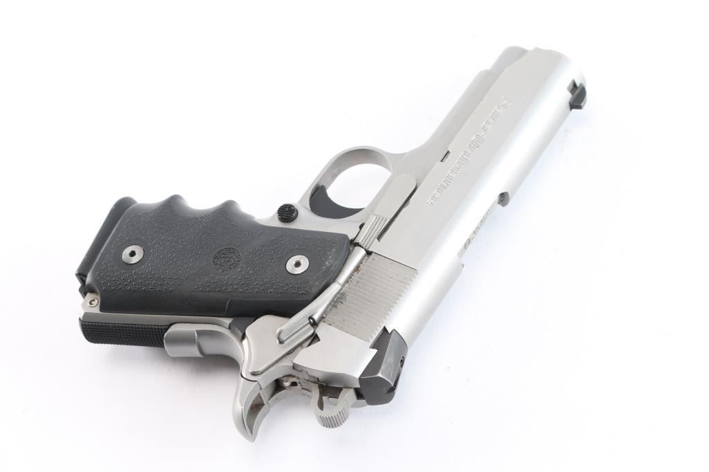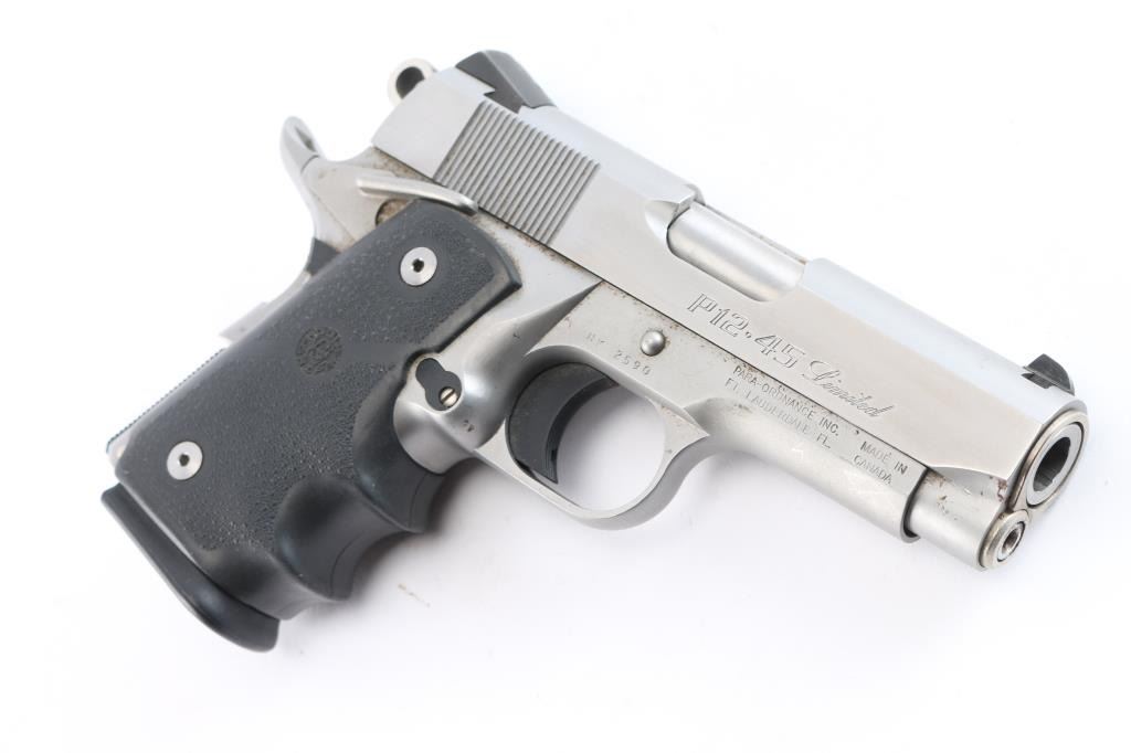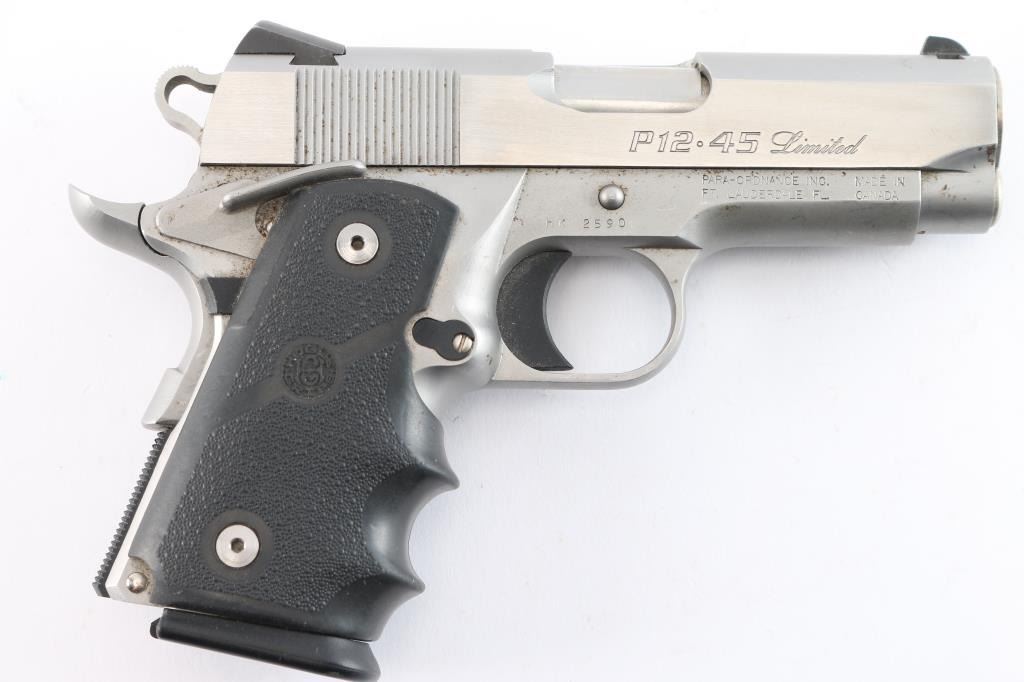 Canadian made single action 1911 style semi automatic pistol chambered in .45 Automatic Colt Pistol. Features a stainless finish, 3.5" barrel, three-dot sights, partially serrated slide, wide grip, 12 round double stack magazine, thumb safety, beavertail grip safety, black checkered Para Ordnance hard rubber grips, and serrated trigger, round skeletonized serrated hammer & checkered main spring housing. Includes three magazines total. Finish show edge wear and some rust on frame and slide. Action is tight, bore is pristine, and grips are fine. NRA Condition Good.