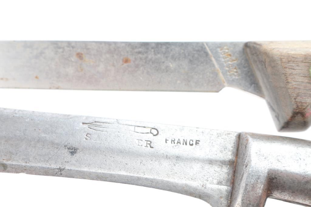 Includes: 1 - 6 1/2" French blade; 1 - 5 1/4" curved blade by Enterprise Casing Co. San Francisco; 2 - larger knives w/o markings & 1 - 8 3/4" blade by Western.
