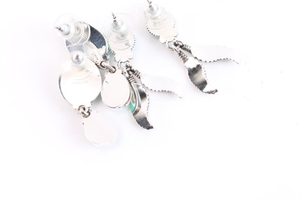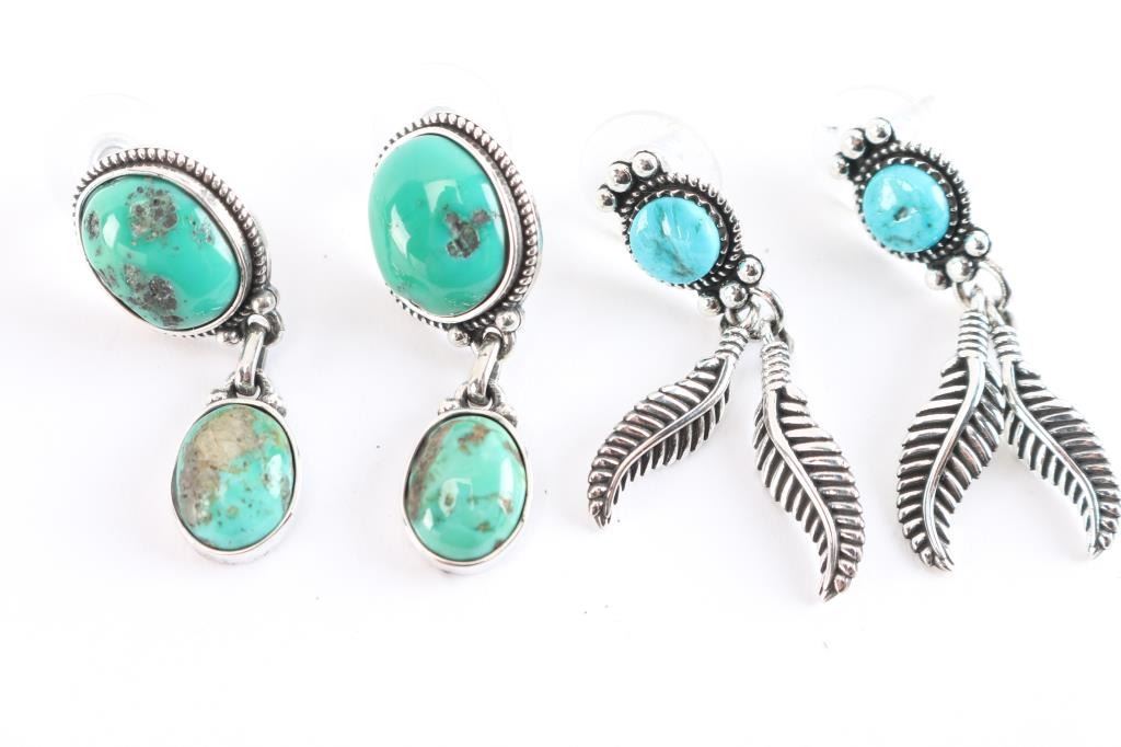 (1) Pair of two stone earrings set in sterling; and (1) Pair of earrings with turquoise and dangle feathers.