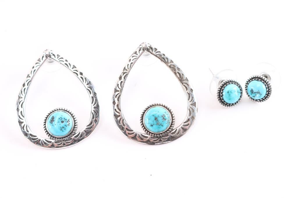 (1) Pair of tear drop shaped earrings with turquoise, sterling; and (1) Pair of turquoise studs all sterling.