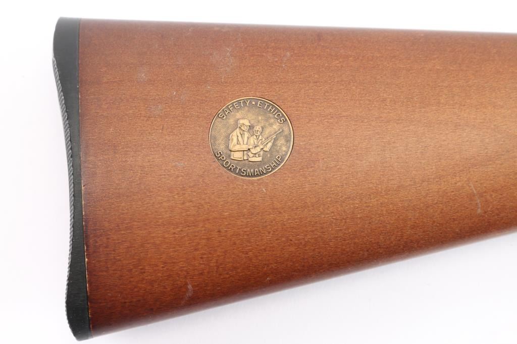 American made tube-fed semi-automatic rimfire sporting rifle chambered in .22 Long Rifle. Manufactured circa 1990 in North Haven, CT. Rifle features a blued 22" micro-grooved round barrel, fifteen-round tube magazine, serrated ramped blade front sight, adjustable rear sporting sight, integral optic rail cut into the receiver, serrated curved gold-toned trigger, annular cut push-button safety, bolt catch on the right side of the trigger guard, and 3/4 length magazine tube with knurled magazine button. The hardwood furniture consists of a smooth semi-pistol grip shoulder stock, smooth forend, an "Safety Ethics Sportsmanship" medallion inlayed on the right side of the stock, and a checkered factory black plastic butt plate. Rifle retains approximately 99% of its original blued finish showing very little wear. The receiver's satin black painted finish is very good to excellent with minor scratches and blemishes. Metal displays no rust, or deformation. Action is smooth and crisp, and the bore is bright with strong rifling. The hardwood furniture is very good to excellent with very light handling marks on the right side of the stock with one small tear drop shaped spot of finish loss.