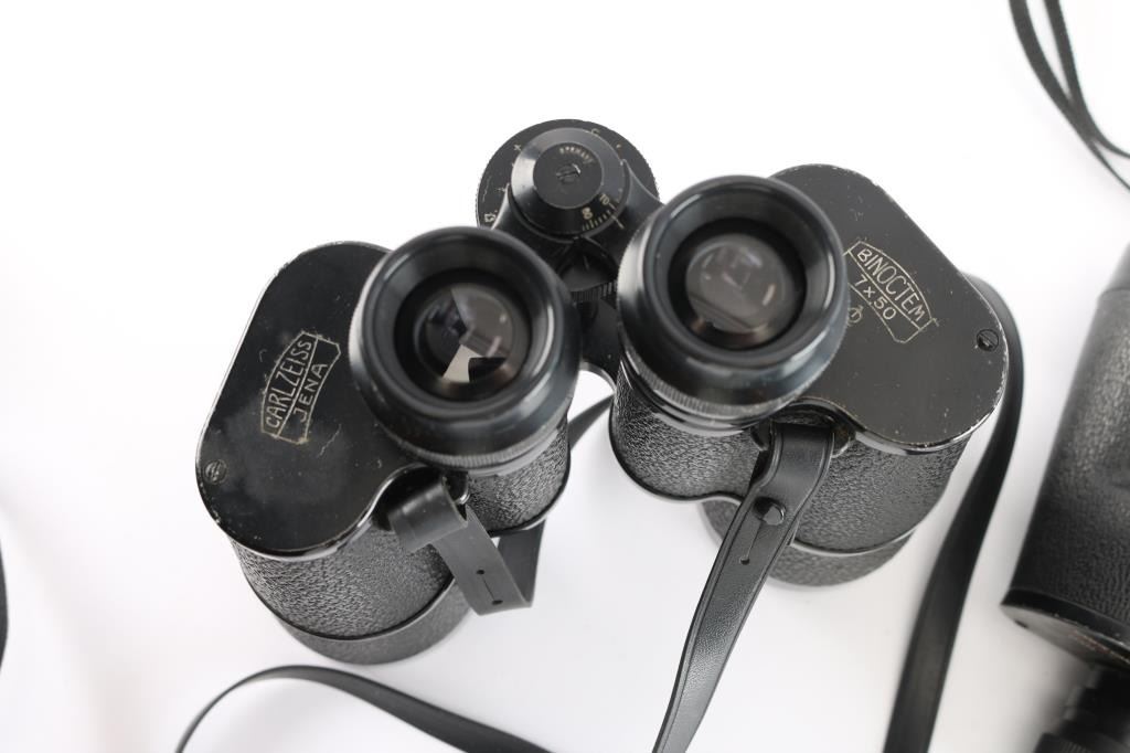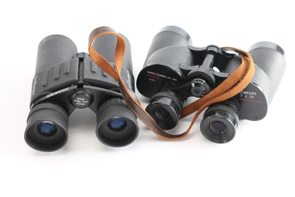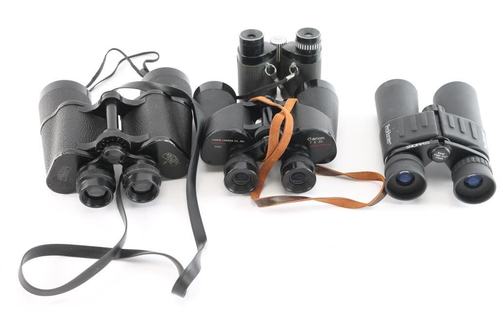 These low-powered optics are great for bird watching and low light situations. 1) Carl Zeiss Jena Binoctem 7x50 model dates back to 1919, that same year Carl Zeiss introduced the Binoctar 7x50. The Binoctem is optically the same as the Binoctar, but with an individual focusing system. The Binoctem features a bridge and central focusing. This model is slimmer because of a change in the metal utilized. As a result of the material change, the weight of the Binoctem was also decreased. The binoculars feature a black finish with a pebbled texture, a single lens coating, and black neck strap. The sight picture is bright and clear, with a slight yellowing. The condition is very good with handling blemishes, and edge wear. 2) Nikon 8x24 7* ('7' field of view degrees) vintage compact binoculars, made in Japan. This set has a black finish with a checkered rubberized texture. The finish is good with some edge wear and some light scattered scratches. The body shows some dents on the rear at the corners. All of the parts appear to work correctly, and the sight picture is clear with the slightest of yellowing. 3) Japanese made Canon 7x35mm set of binoculars. This set of binoculars has a black finish, and a black pebbled texture on the body. The finish condition is very good with some edge wear at the rear, some light scattered scratches, and chip on the left eyepiece. The sight picture is sharp and clear with all of the components working smoothly. Includes rear lens covers, leather neck strap, and a fabric carrying case. 4) Simmons 'ProHunter' 8x42mm set of binoculars. These are touted as being waterproof, fog proof, and having coated lenses. The external condition of this set of binoculars is excellent with a dirty residue that looks like it can be cleaned off. All of the mechanical components work smoothly, and the sight picture is bright and sharp. Includes a fabric soft case.