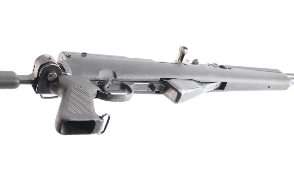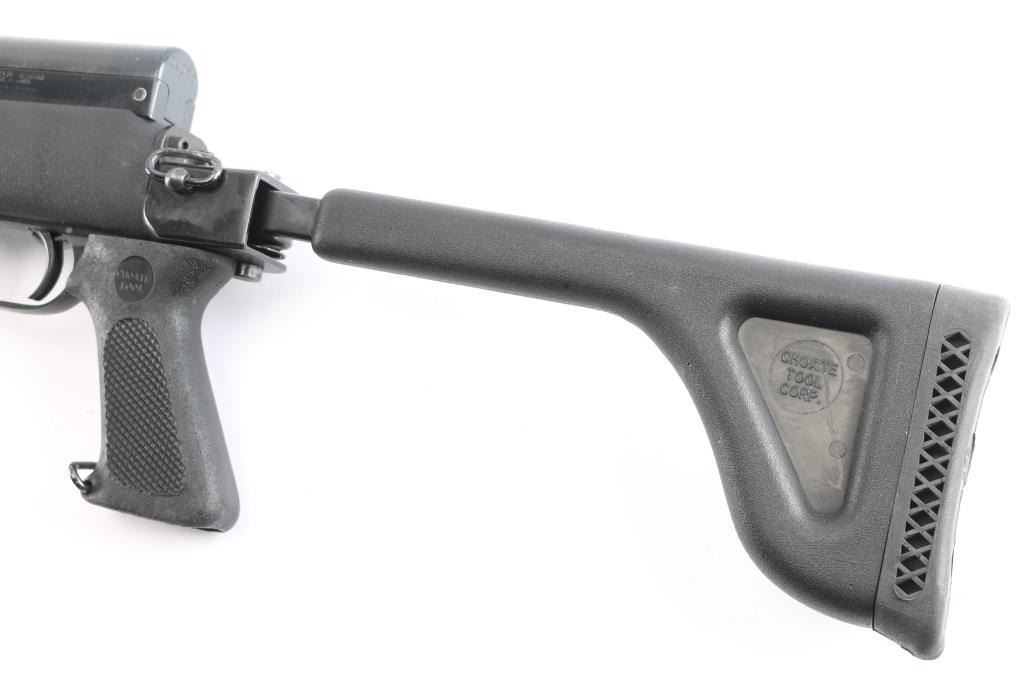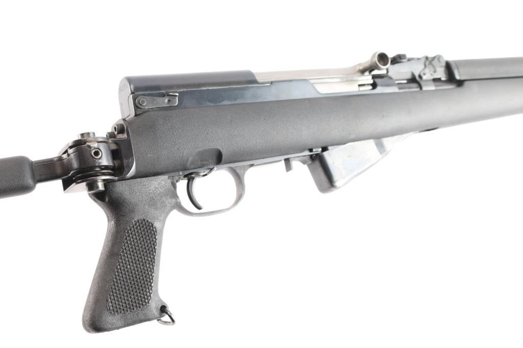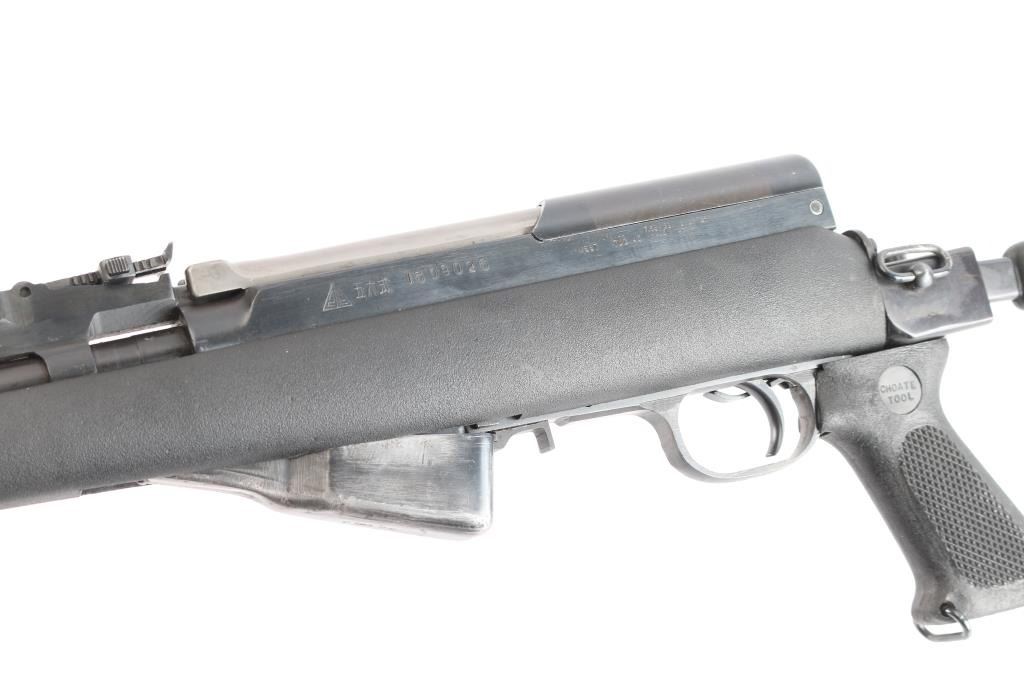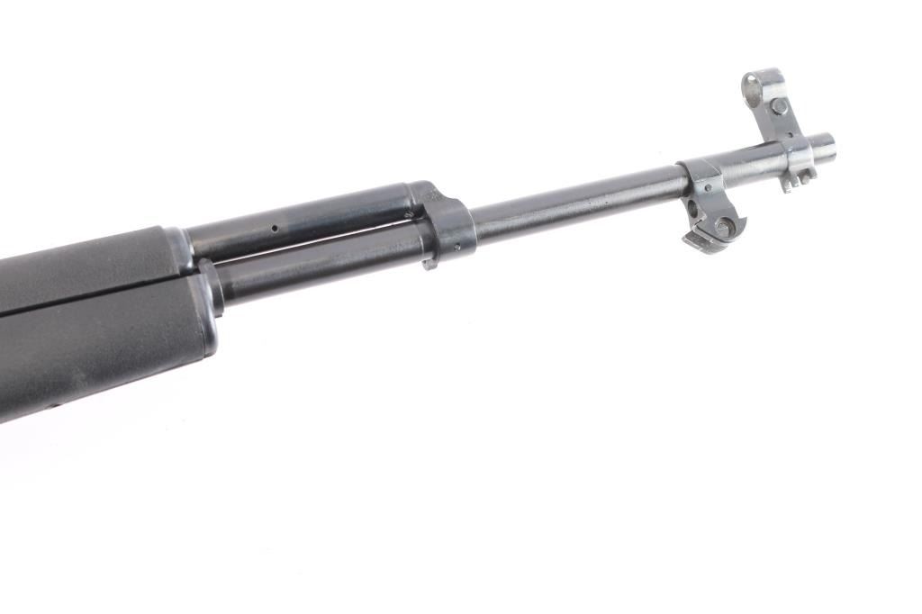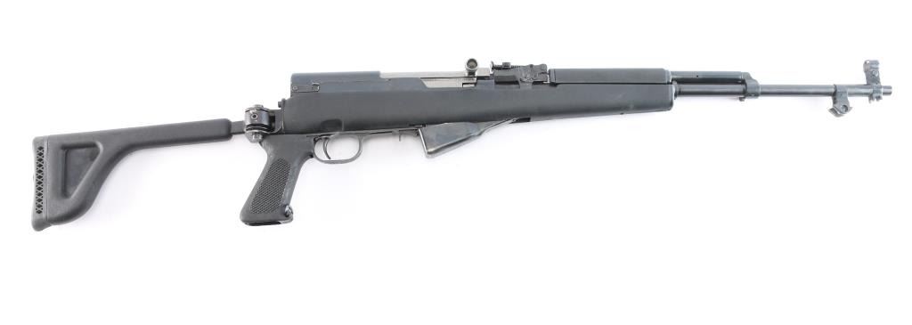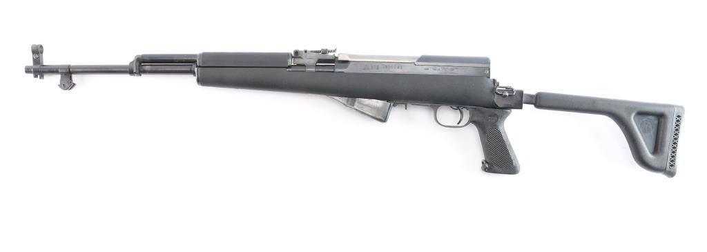 Chinese made semi-automatic short-stroke centerfire rifle chambered for 7.62x39mm, and imported by B-West out of Tucson, AZ. Rifle features a blued finish, a 20.5" chrome-lined barrel, folding spike bayonet removed, elevation and windage adjustable protected post front sight, tangent notched rear sight graduated to 1000 meters, knurled bolt handle, stripper clip guides cut into bolt carrier, fixed ten-round box magazine, smooth curved trigger, milled trigger guard, trigger guard mounted manual safety, sling swivel on the gas block, sling swivel at stock hinge, checkered black plastic pistol grip with as sling swivel at the toe, and black synthetic Choate Tool folding stock with ventilated rubber recoil pad. Matching serial numbers on receiver, bolt, bolt carrier, trigger guard, and receiver cover with the magazine differing. The original blued finish retained is approximately 94% with light scattered scratches, edge wear, thinning on the magazine, and patchy spots of thinning. Metal displays no deformation, but shows small spots of rust on the rear gas tube ferrule, magazine, and the left receiver rail. Bore looks bright with strong rifling. The action smooth and crisp. The black plastic Choate stock is excellent with handling marks on the pistol grip, and superficial blemishes on the shoulder stock.