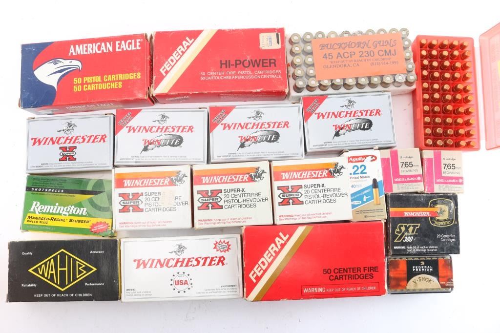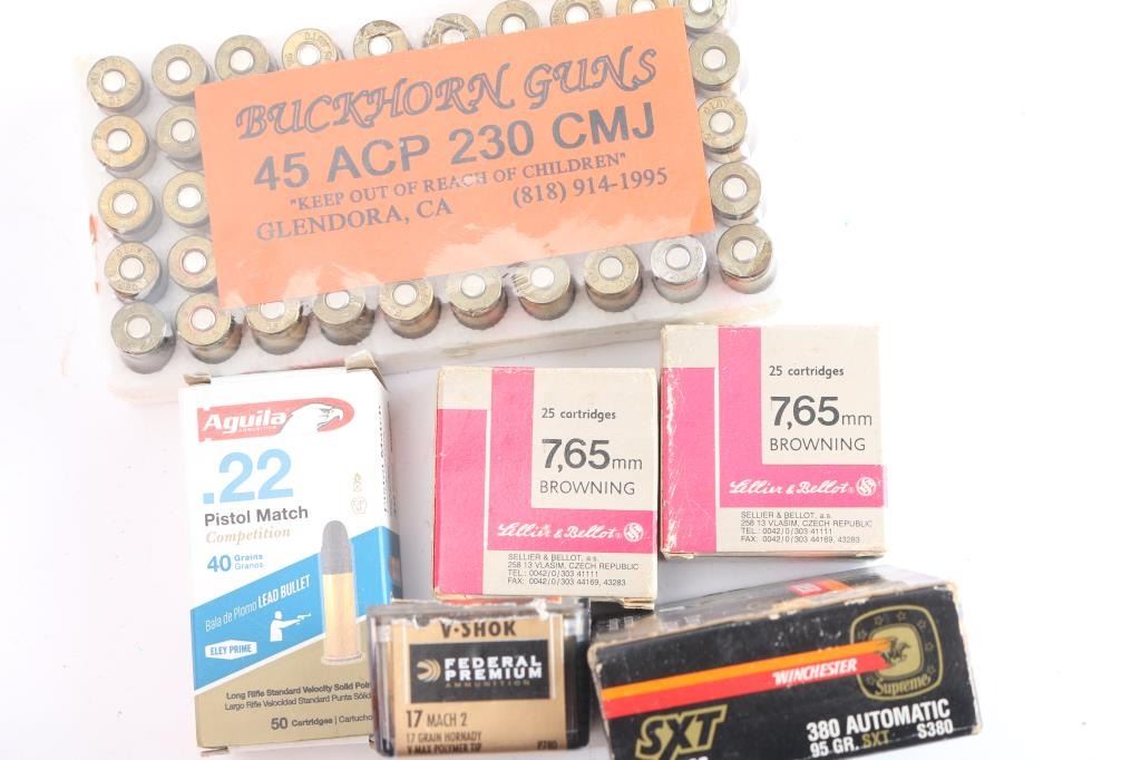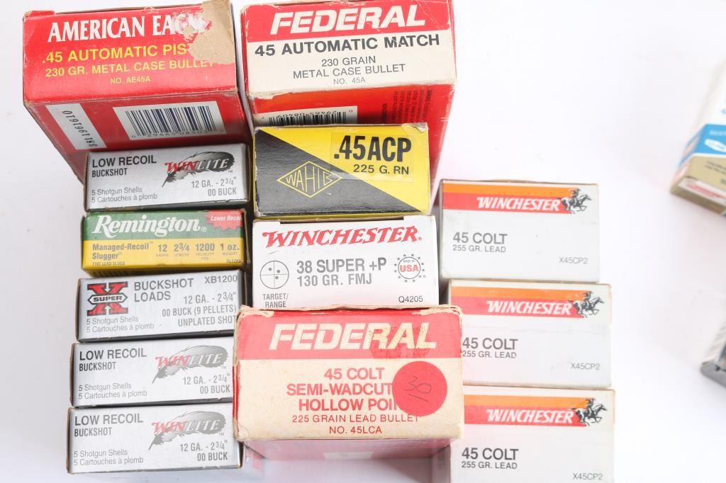 Includes: 110rds 45 Colt, Winchester 255Gr. Lead & Federal 225Gr. Lead wadcutter; 199rds of 45ACP, Various makers, 230Gr. & 225Gr. ; 70rds 380ACP, Winchester SXT 95Gr. & Wadcutter reloads; 50rds 38 Super, Winchester 130Gr. FMJ; 50rds 7.65 Browning, S&B 73Gr.; 25rds 12Ga., Winchester 00buck & 1oz. slug; 50rds .22LR Aguila 40Gr. lead & 50rds 17 Mach 2, Federal 17Gr. polymer tip. All except 50rds are factory new ammunition in factory boxes.