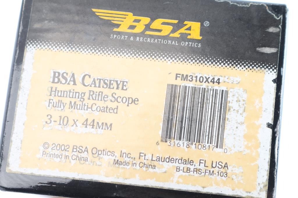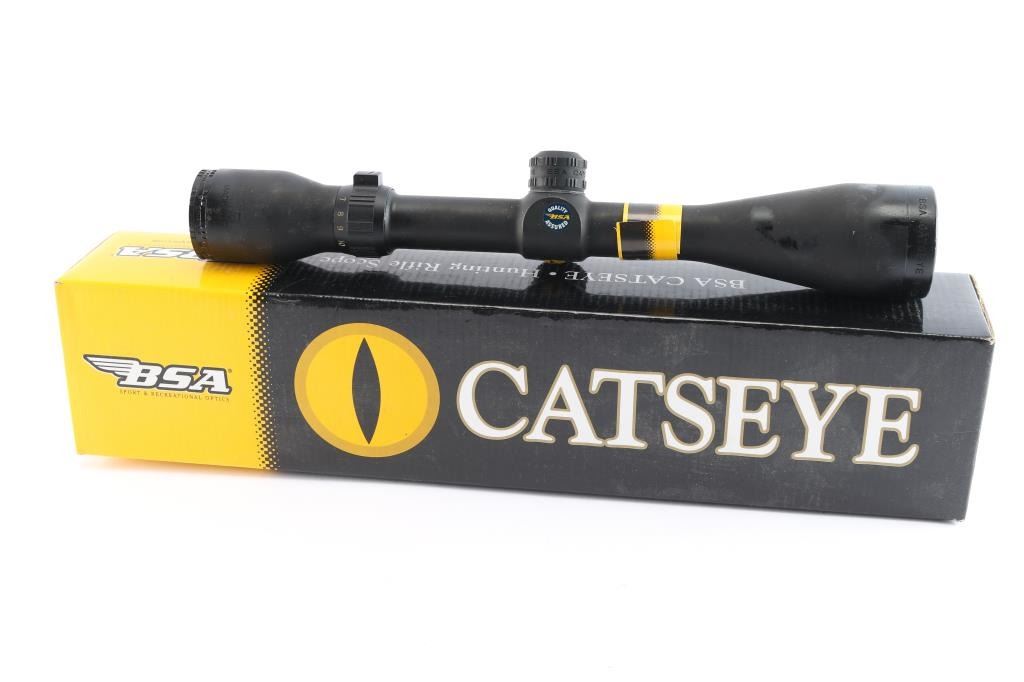 BSA 3-10X44mm Catseye Scope was designed to see game better in poor lighting. It is touted for having camera quality glass for a clear, undistorted image. The objective and ocular lenses were then multi-coated for a bright picture. The large diameter ocular lens helps to create a big 4" to 5" eye relief without reducing the field of view, and a large exit pupil allows for better light. Featuring 1" single-piece aluminum tubing with a 'Shadow Black' finish, a sprayed-on, baked, rubber coating which provides a reflection-free matte black finish. It has a German #4 style reticle. The condition is very good to excellent with a oily residue. Scope comes with original box, paperwork and lens covers.