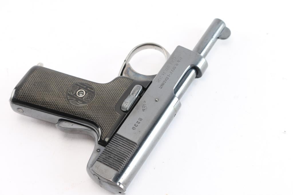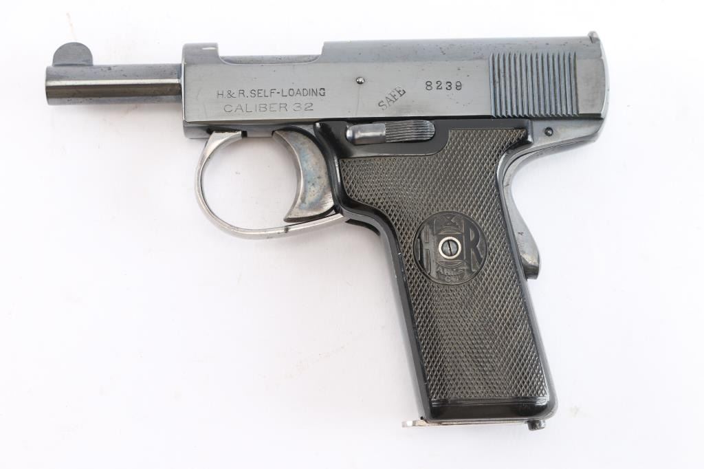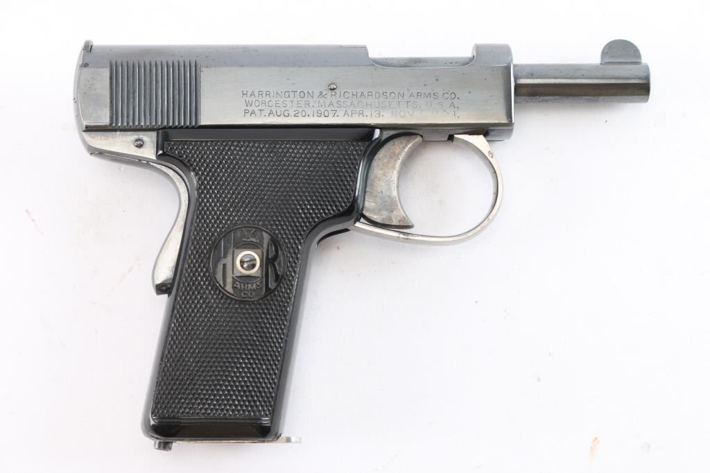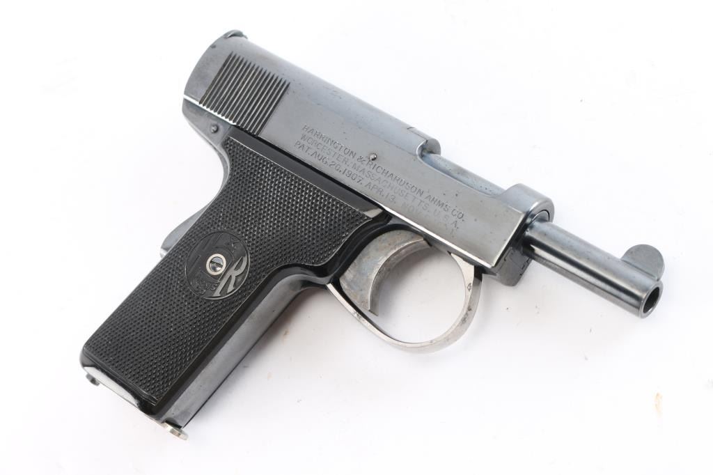 Introduced in 1912, an American made semi-automatic centerfire pistol chambered for .32 Automatic Colt Pistol, and manufactured in Worcester, MA. Pistol features a blued refinish, a 3" round barrel, fixed blade front sight, fixed 'V' notched rear sight, smooth grip safety, serrated left frame mounted manual safety, color-case solid smooth curved trigger, checkered push-button mag release on heel, smooth grip straps, and two-piece black checkered hard rubber grips that bear the H&R monogram. The markings display the standard three line address with the 1907 and 1909 patent dates marked on the right side of the slide. The other side of the frame shows a two line model and caliber marking, along with the serial number on the left side of the slide. The blued refinish retained is approximately 96% with light edge wear, and superficial scratches. Metal displays no deformation, but shows very small scattered spots of rust and pin-prick pitting. Bore is bright with strong rifling, and the action smooth and crisp. The hard rubber grips are also excellent. Pistol includes one nickel plated magazine.
