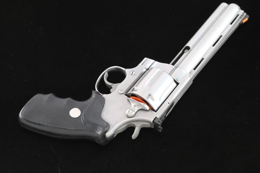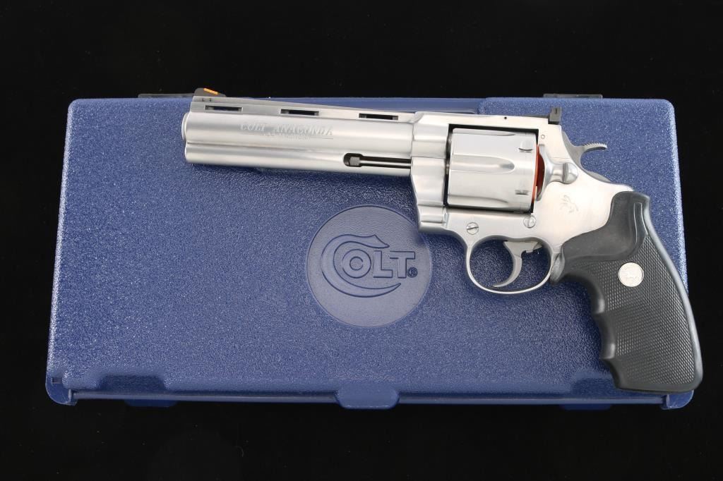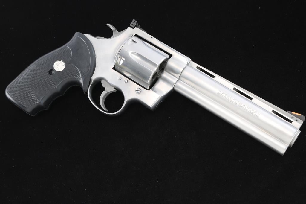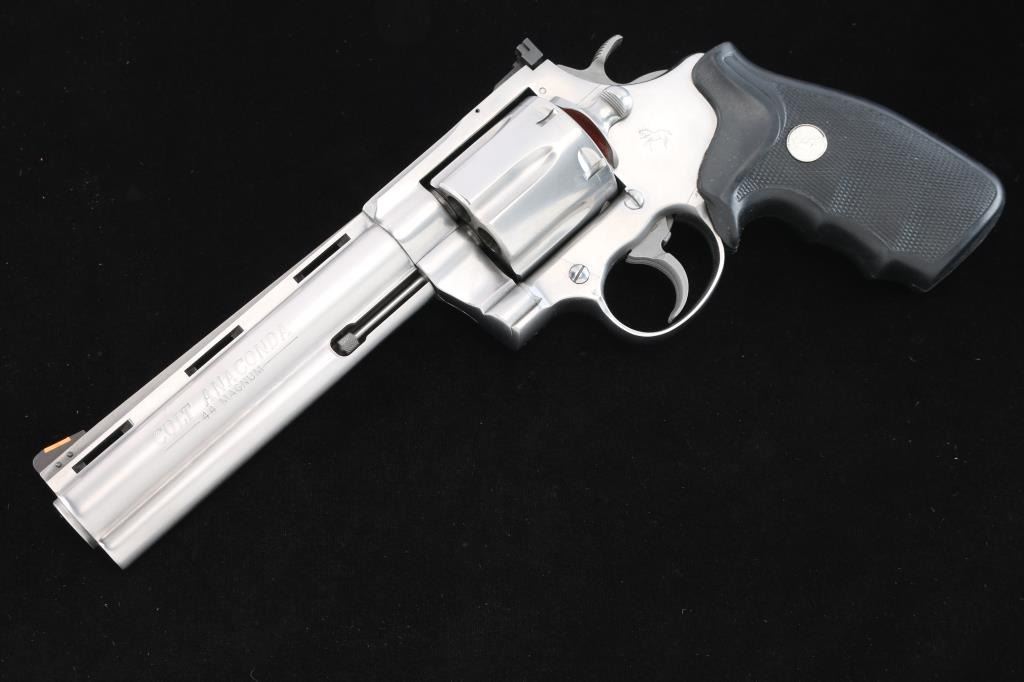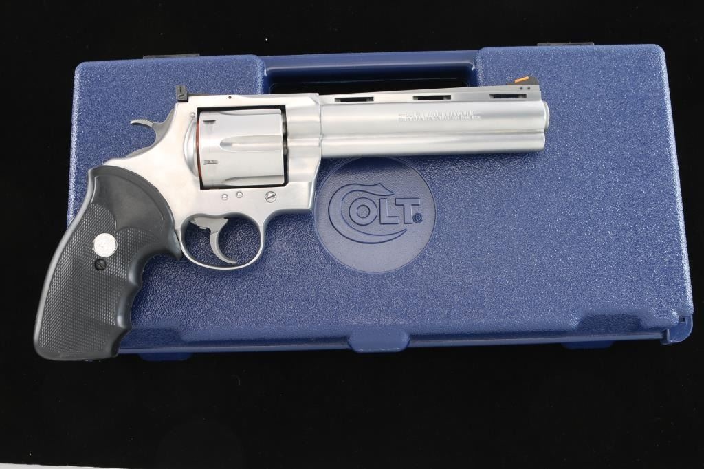 American made premium large frame stainless steel double action revolver chambered in .44 Magnum, manufactured circa 1992 in Hartford, CT. Revolver features a satin stainless finish, 6" vent ribbed barrel, shrouded ejector rod, full underlug, pinned ramp front sight with orange insert, micrometer adjustable square notch rear sight with white outline, fluted six-shot cylinder, partially serrated wide curved trigger, flat top frame, frame mounted firing pin, transfer bar safety, serrated wide hammer spur, and two-piece checkered black rubber finger groove grips with silver-colored colt medallions. Revolver's original stainless finish retained is approximately 99% with only superficial scratches, and a light drag line on the cylinder. Metal displays no rust or deformation. Action is super smooth and crisp with a very good lock-up. The bore is bright with strong rifling, and the cylinder chambers are also excellent. The rubber grips are excellent. Revolver includes original blue plastic factory box with cardboard sleeve, and paperwork.