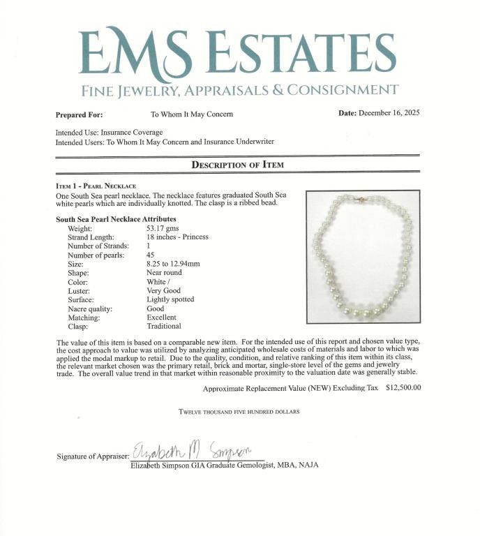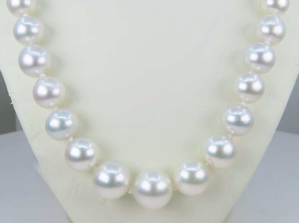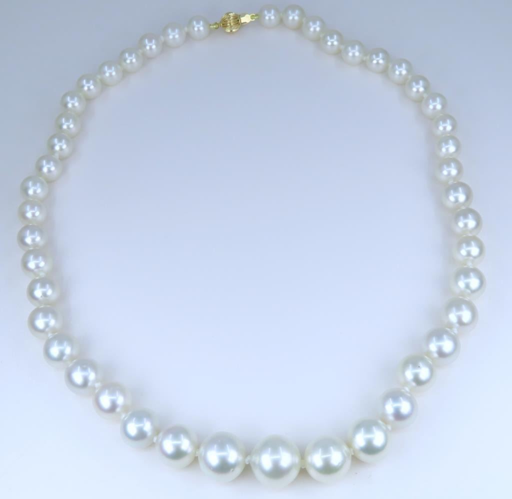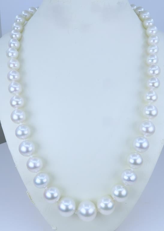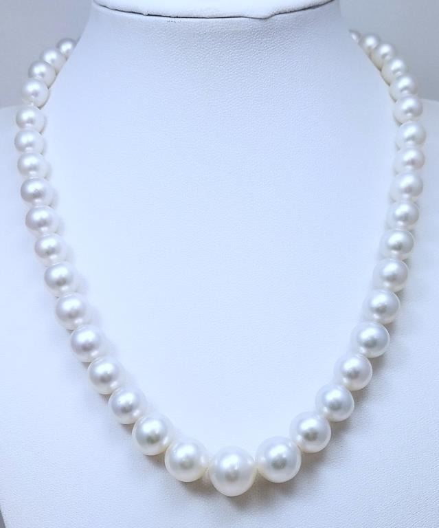 featuring a beautiful 18-inch graduated strand of White Pearls with blush overtones and rich luster, ranging between 8.00 mm to 13.00 mm in diameter accented with a 14 karat yellow gold ball style clasp. Full Retail Appraised Value - $12,500.