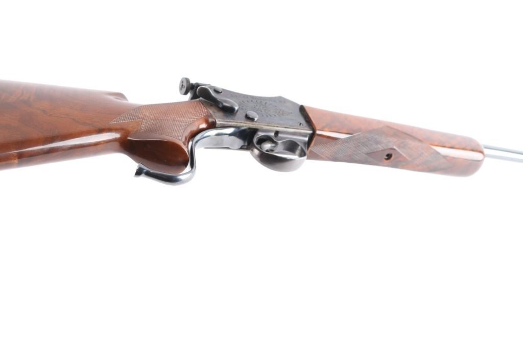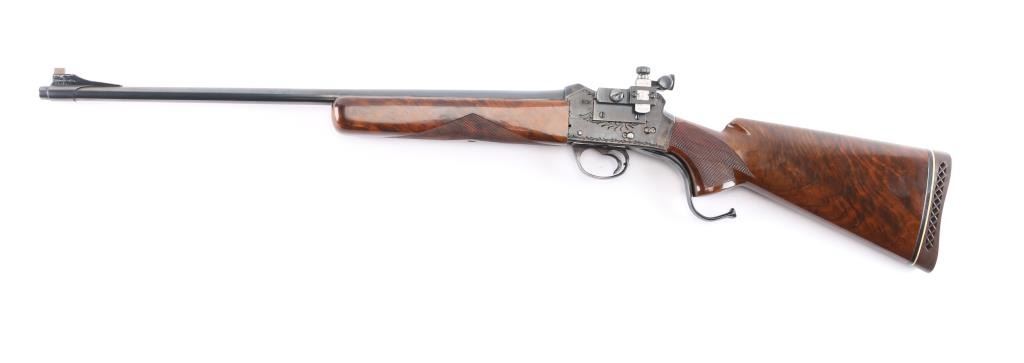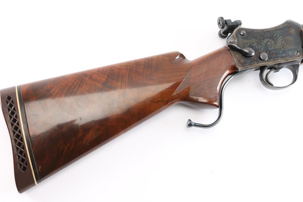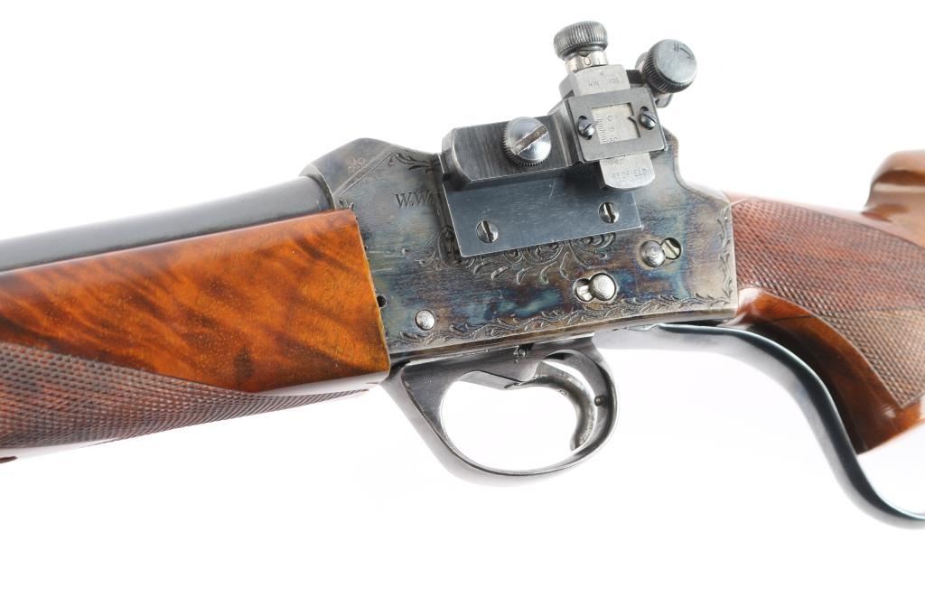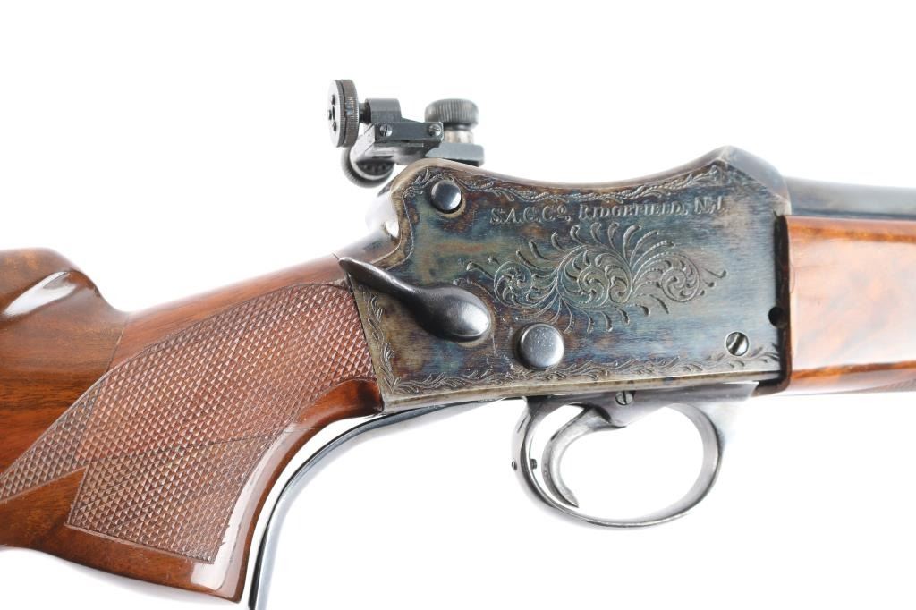 NVSN. Single-Shot Rifle. manufactured by W.W. Greener in Birmingham, Imported by S.A.C. Corp. of Ridgefield, N.J. ( Service Armament Co.), active in the 1950's & 60's. Classic Martini-Henry falling block action. High polished blue finish with case colored action. The right of the receiver is marked “S.A.C. Co. RIDGEFIELD, N.J.”, the left is marked “W.W. GREENER LTD. / BIRMINGHAM / ENGLAND”. The receiver is marked with a Birmingham nitro proof. 23 1/2" tapered barrel with raised Redfield blade front sight, Redfield Olympic model fully adjustable rear aperture sight installed on the left receiver. Nicely figured high gloss stocks with checkered panels on the wrist & forearm, Browning solid rubber recoil pad, buttstock has been spliced into the wrist, professionally done, barely noticeable. the. Receiver has floral/scroll engraving. The bore is excellent/bright, the action is smooth, the blue & case colors are very good with some minor scratches and the wood is overall excellent. NOTE* Consigner states this is chambered .30-40, we chambered a .30-40 round and it seemed slightly loose in the chamber, we recommend having it checked with a competent gunsmith before firing just to be on the safe side.