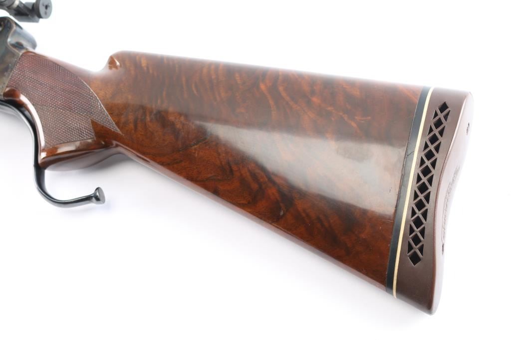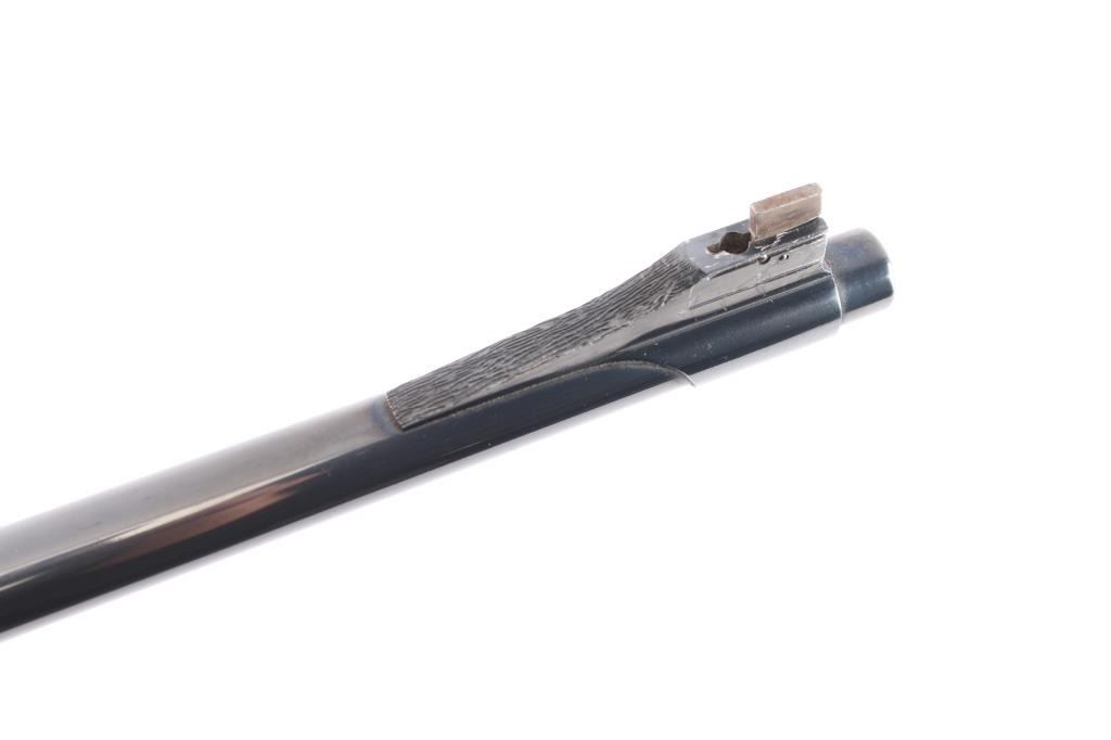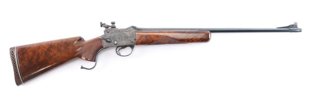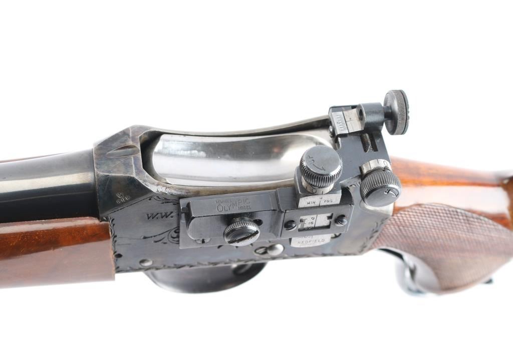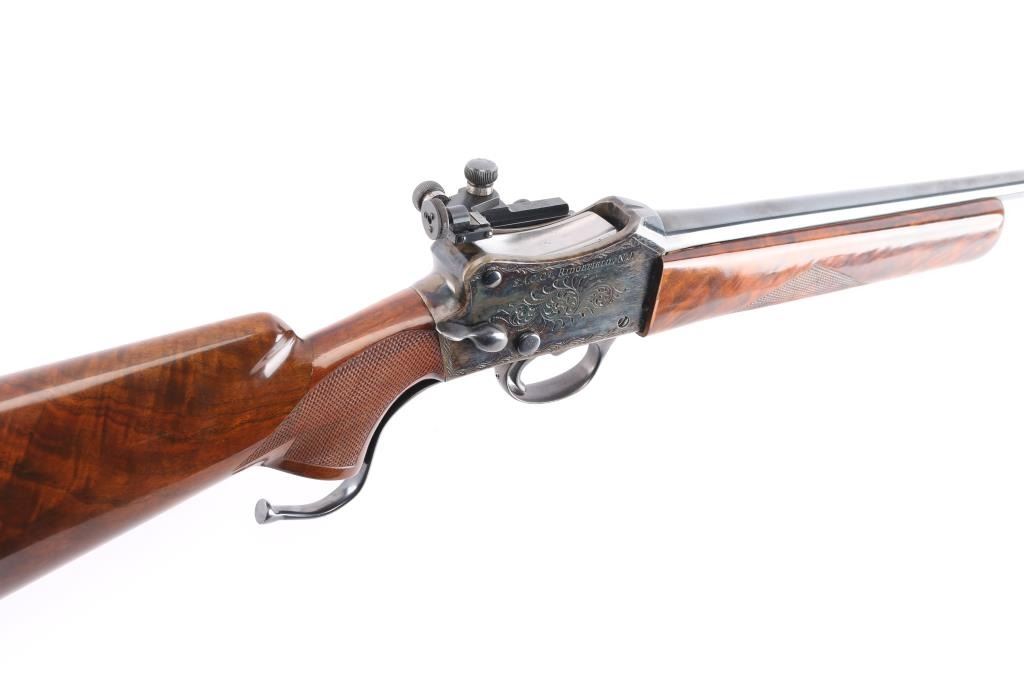 NVSN. Single-Shot Rifle. manufactured by W.W. Greener in Birmingham, Imported by S.A.C. Corp. of Ridgefield, N.J. ( Service Armament Co.), active in the 1950's & 60's. Classic Martini-Henry falling block action. High polished blue finish with case colored action. The right of the receiver is marked “S.A.C. Co. RIDGEFIELD, N.J.”, the left is marked “W.W. GREENER LTD. / BIRMINGHAM / ENGLAND”. The receiver is marked with a Birmingham nitro proof. 23 1/2" tapered barrel with raised Redfield blade front sight, Redfield Olympic model fully adjustable rear aperture sight installed on the left receiver. Nicely figured high gloss stocks with checkered panels on the wrist & forearm, Browning solid rubber recoil pad, buttstock has been spliced into the wrist, professionally done, barely noticeable. the. Receiver has floral/scroll engraving. The bore is excellent/bright, the action is smooth, the blue & case colors are very good with some minor scratches and the wood is overall excellent. NOTE* Consigner states this is chambered .30-40, we chambered a .30-40 round and it seemed slightly loose in the chamber, we recommend having it checked with a competent gunsmith before firing just to be on the safe side.