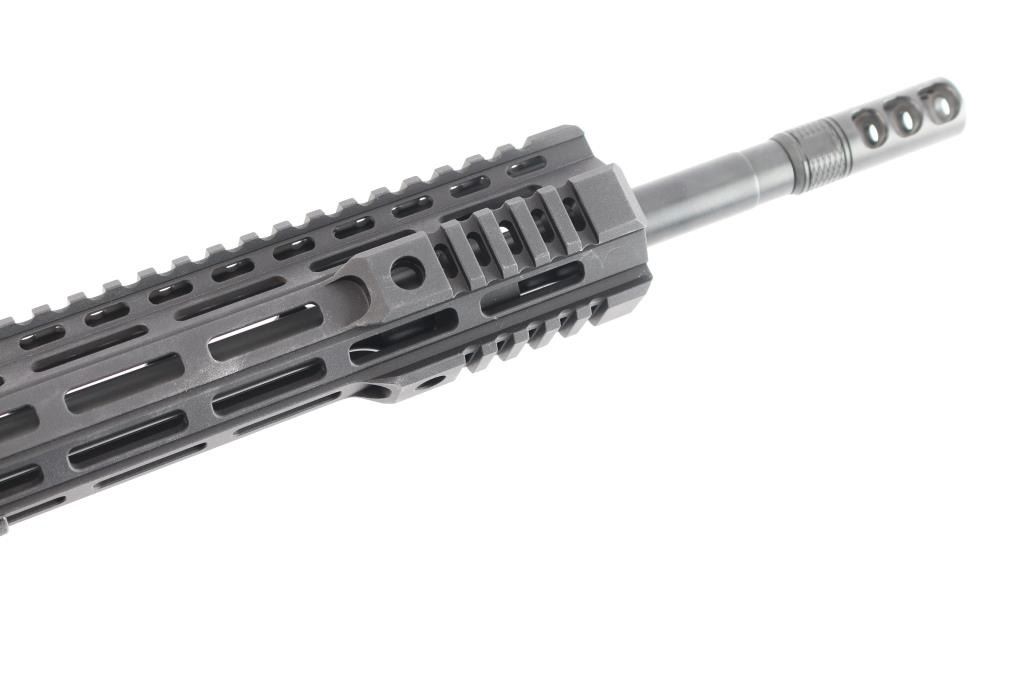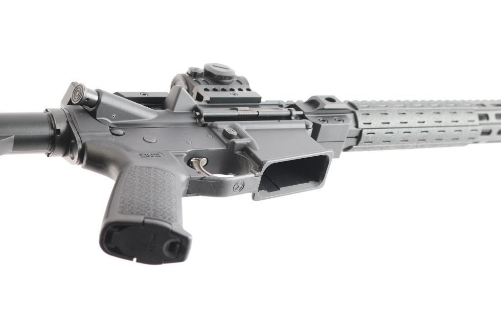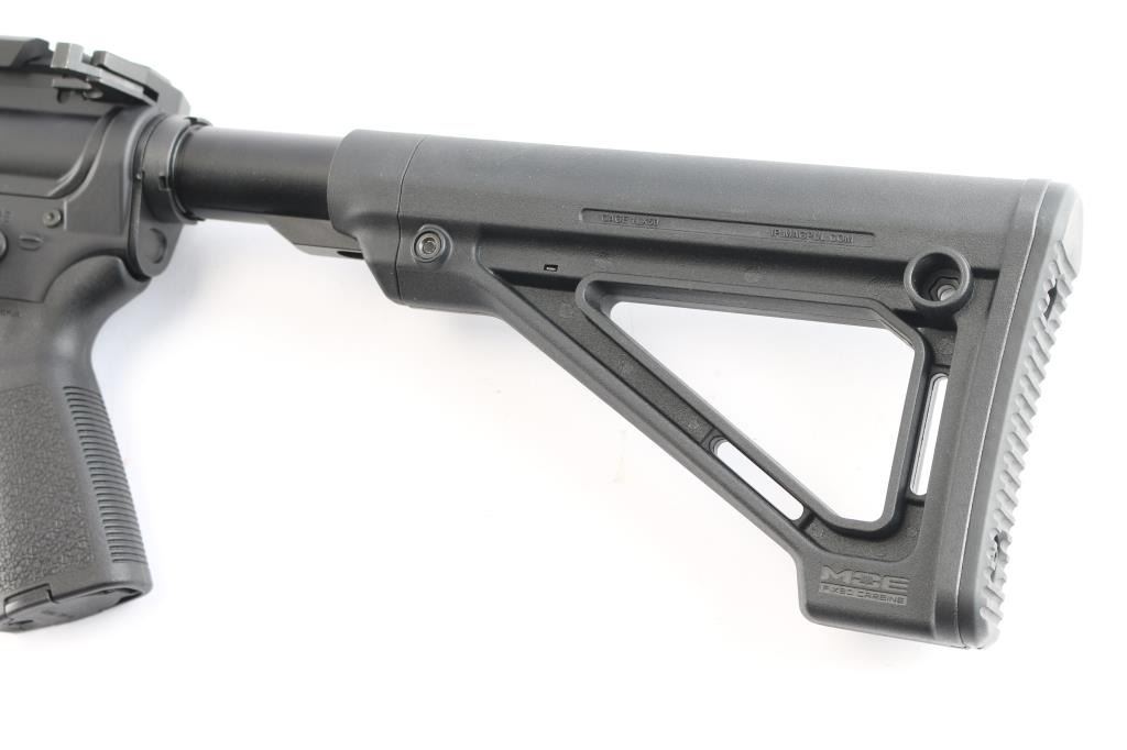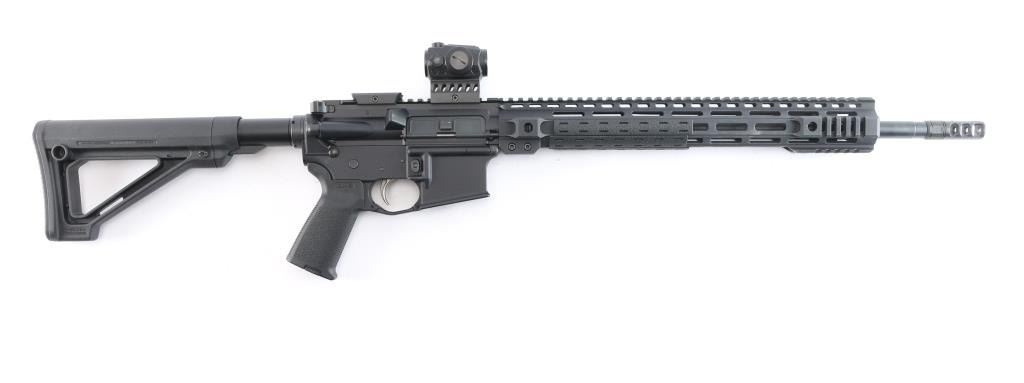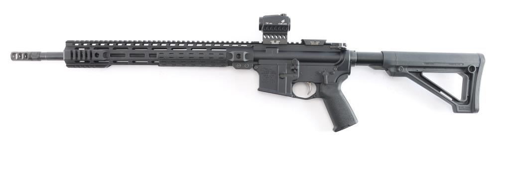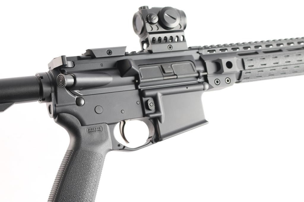 American made semi-automatic direct gas impingement operated AR15 style rifle chambered in 5.56x45mm NATO, and manufactured in Hebron, KY. Rifle features a matte black finish, 18" straight profile barrel with a 1/8 twist rate, rifle length gas system, three port muzzle brake, 15-1/4" free-float M-Lok handguard with QD sockets and sections of picatinney rail, Magpul MOE pistol grip, Magpul MOE fixed carbine buttstock, no iron sights, serrated receiver mounted manual safety, picatinney flattop receiver, ejection port cover, annular cut forward assist, shell deflector, flared magazine well, annular cut push-button mag release, M16 type bolt carrier, nickel Teflon coated mil-spec smooth curved trigger, winter trigger guard, mil-spec buffer and receiver extension, serrated bolt release, Accu-wedge in receiver, and extended charging handle. A Cyelee 'T10 X Pro' red dot sight comes mounted on this rifle, and there is another optic mount attached to the rifle behind it. Rifle retains approximately 99% of its original anodized black finish with nothing remarkable. Metal displays no rust or deformation. The action is smooth and crisp, and the bore is bright with strong rifling. The polymer furniture is also excellent.