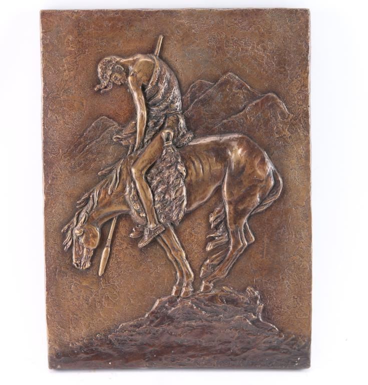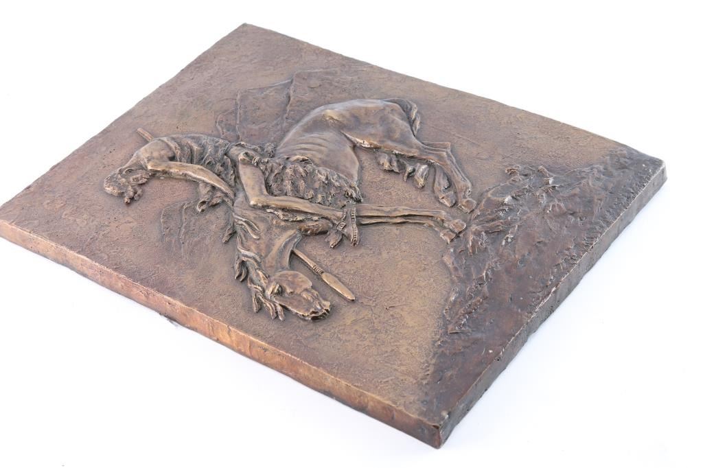 Wall hanging, inspired by Frazier, a scene of exhausted indian warrior. High relief with good detail. Measures 15 3/4" x 11 3/4" approximately. Has two mounting bars on back to secure to a door, building or whatever.