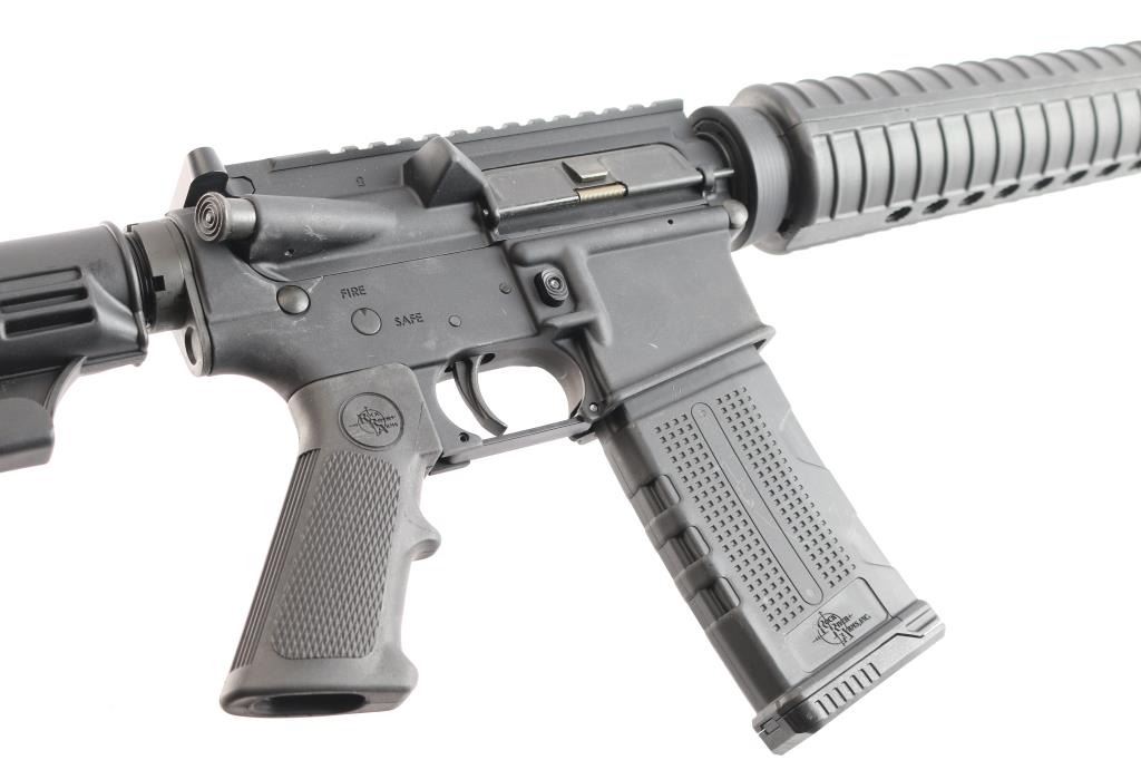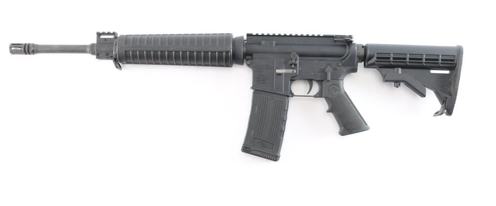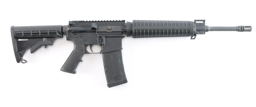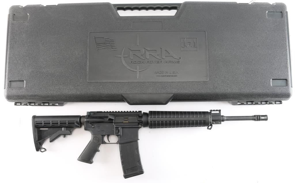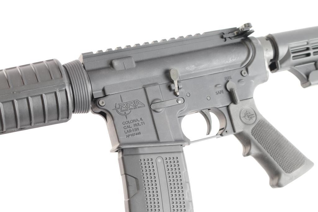 American made LAR-15M, a semi-automatic gas impingement centerfire modern sporting rifle chambered for 5.56x45mm NATO, manufactured in Colona, IL. Rifle features a matte black anodized finish, 16" chrome-moly barrel with 1:9" twist rate, 30-round stanag/AR-15 magazines, forged aluminum T-marked A4 flat-top upper receiver, forged lower receiver, dust cover, ribbed black plastic mid-length hand guards with heat shield, mid-length gas system with a receiver height picatinney gas block, A2 bird cage flash suppressor, left receiver mounted serrated manual safety, annular cut push-button magazine release, RRA two-stage smooth curved trigger, mil-spec charging handle, shell deflector, M16 bolt carrier, annular cut bolt assist, serrated bolt release, A2 checkered pistol grip, six-position buffer tube, mil-spec buffer and buffer spring, flared magazine well, and M4 style carbine buttstock. The original Matte black anodized finish retained is approximately 99% with nothing remarkable. Metal displays no rust or deformation. The action is smooth and crisp, and the plastic pistol grip and buttstock are also excellent. Bore is bright with strong rifling. Rifle includes original foam lined factory black hard case with end label, and owner's manual.