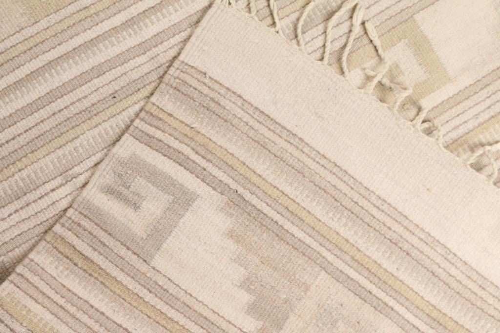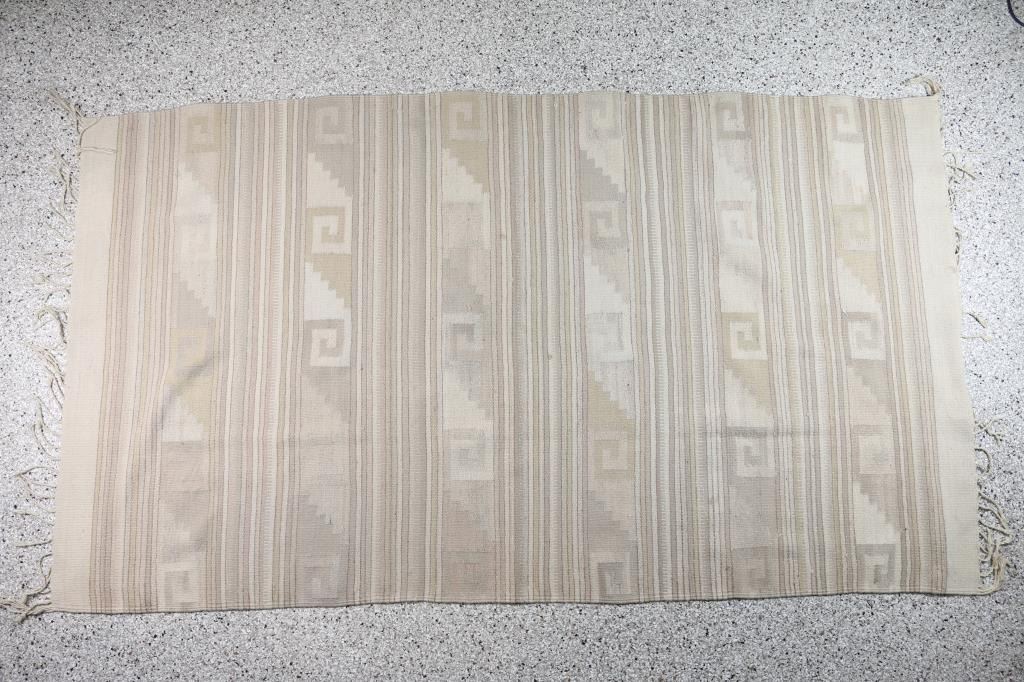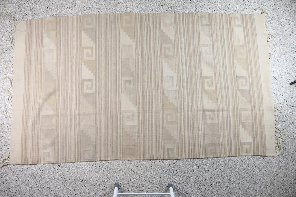Striped design, earth tones, cream, beige, grey. Measures 82" without fringe x 46". Good condition, minor staining.