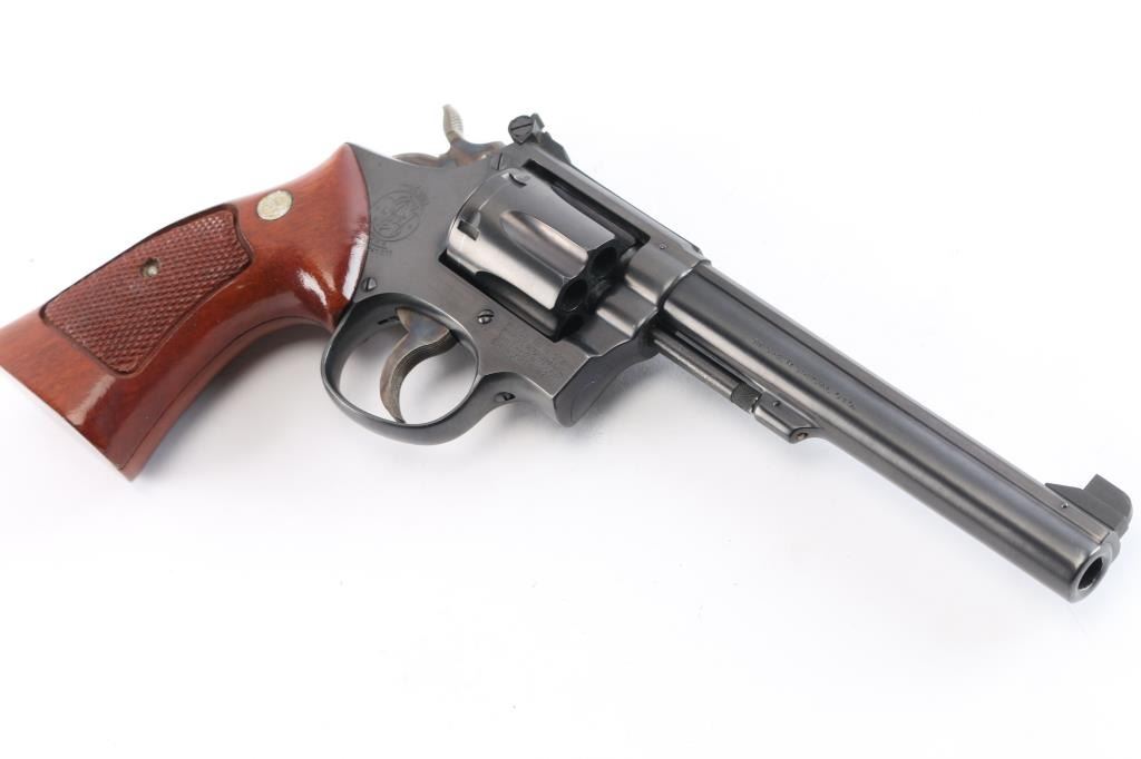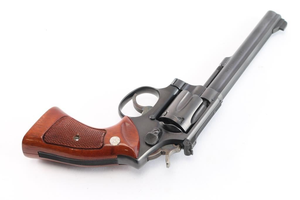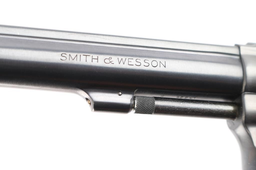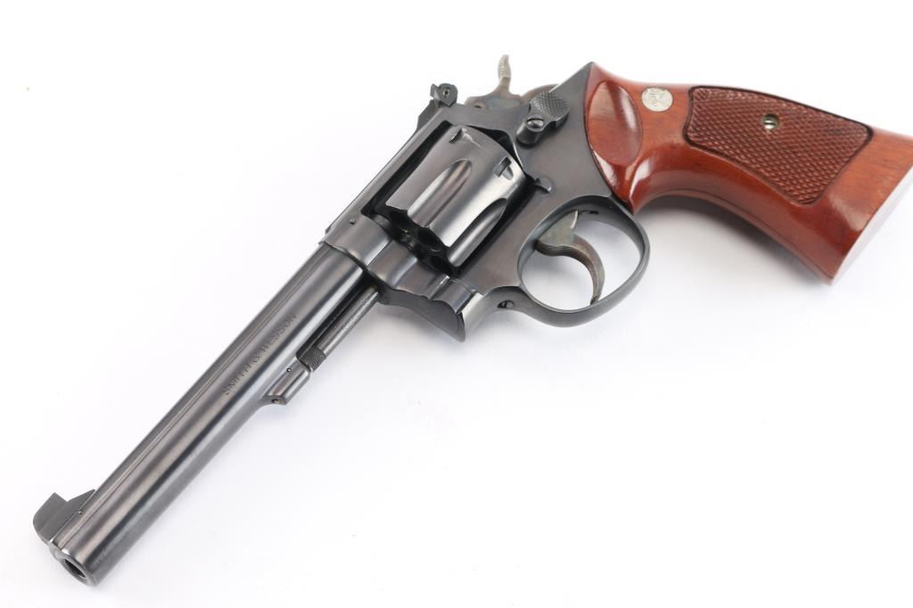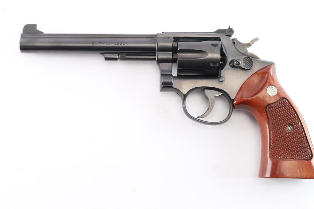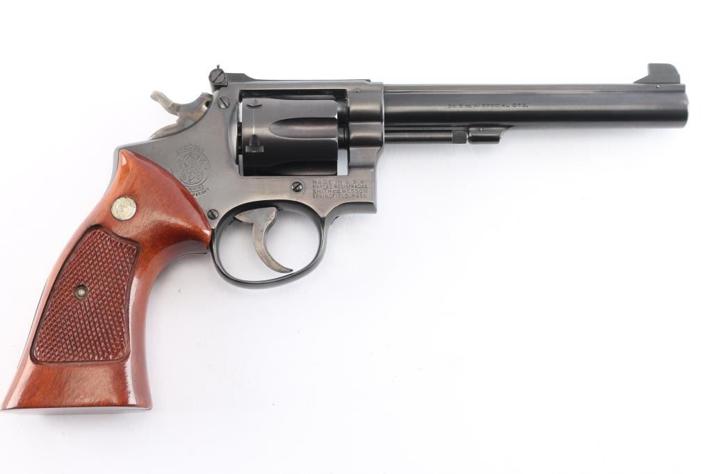 ‘Pre-Model 14,’ an American made medium frame double action revolver chambered in .38 Special, manufactured circa 1950 in Springfield, MA. Revolver features a gloss blued finish, 6” pinned barrel with serrated sighting rib, pinned & raised partridge front sight, micrometer adjustable rear sight, non-shrouded ejector rod, fluted six-shot cylinder, color-case serrated and curved anti-backlash trigger with adjustable stop, firing pin on hammer nose, color-case hammer, checkered hammer spur, five screw square butt 'K' target frame, six grove grip straps, and checkered magna grips with silver S&W medallions (not original). Matching serial numbers found on the frame, barrel, cylinder, and extractor star. Revolver retains approximately 98% of its original finish showing superficial scratches, and very light edge wear. Metal displays no rust or deformation. The action is smooth and crisp with a tight lock up. The bore is bright with strong rifling, and the cylinder chambers are also excellent. Wood grips are excellent with nothing remarkable.