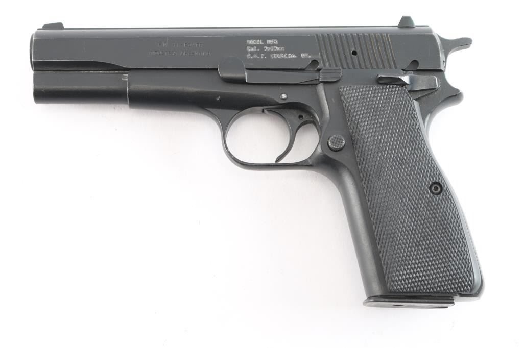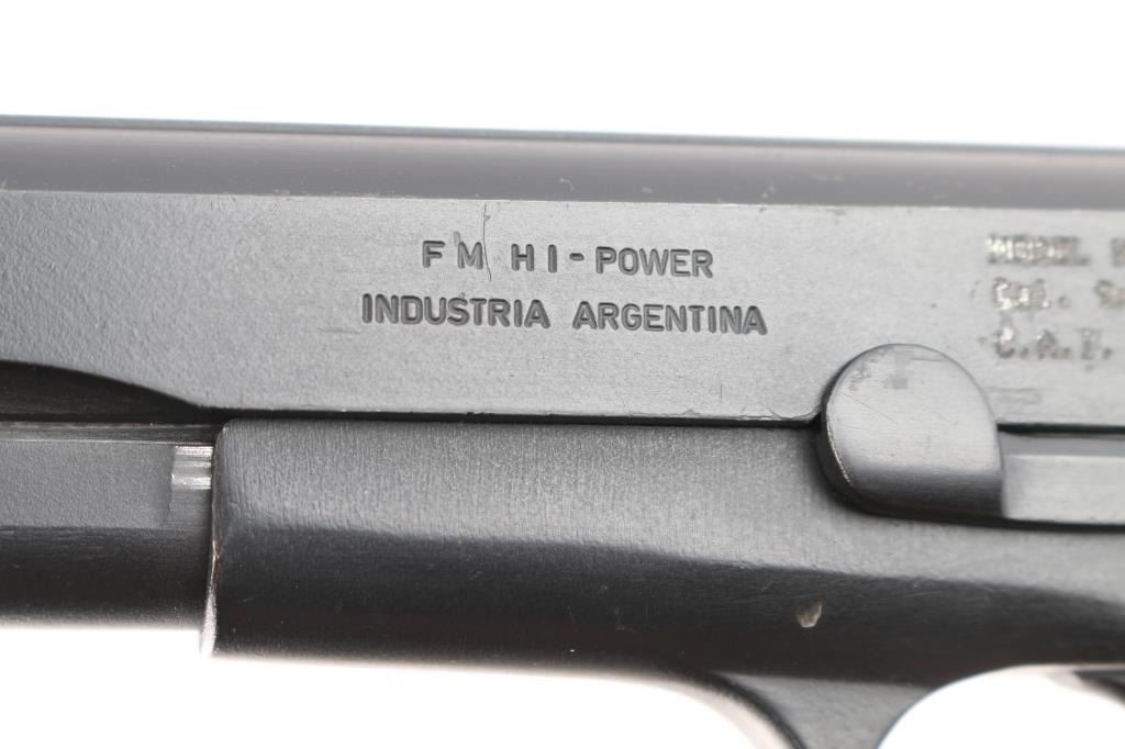 Argentine made single-action semi-automatic pistol chambered for 9x19mm, manufactured in Argentina by FM. Imported by Century Arms International out of Georgia, VT. The 'Direccion General Fabrications Militaries' (commonly called FM) produced Hi-powers at their arms factory, the 'Fabrica Armas Portatiles Domingo F. Matheu' in Rosario, Argentina. They made Hi-powers under Belgian FN license from 1969-1989. The M90 production started in 1990, and are not licensed copies of the FN Hi-Power MKII. Pistol features a thick black parkerized finish, 4.75" barrel, external extractor, fixed blade front sight with white dot, dovetailed notched rear sight with two white dots, metal guide rod with standard coil recoil spring, smooth curved trigger, external hammer, serrated hammer spur, serrated left frame mounted manual safety, left frame mounted slide catch, no magazine disconnect safety, checkered push-button magazine release, steel frame, smooth grip straps, serrated slide stop, and checkered two-piece black rubber grips. Numbers match where observed, on the frame, slide, and barrel. Pistol retains approximately 94% of its original finish showing minor scratches, edge wear, some patina at the heel of the grip, and some patches of finish loss on the right rear of the slide. Metal displays no rust, but there is deformation in the screw slot of the magazine release assembly. Action is smooth and crisp, and the bore is bright with strong rifling. The grips are also excellent. Pistol includes one magazine total.