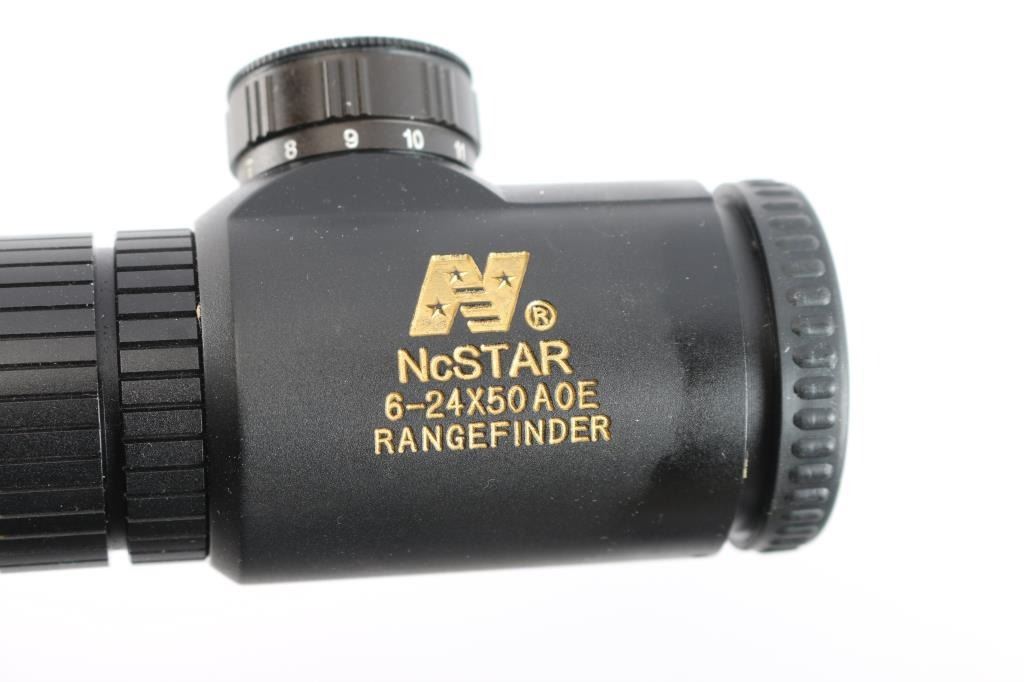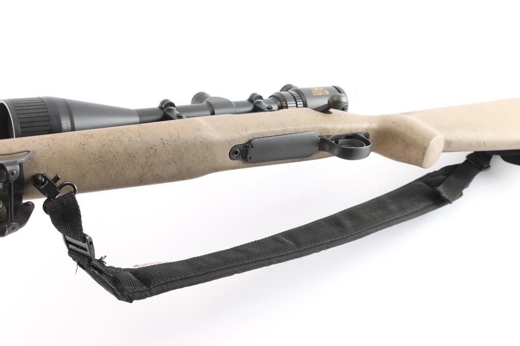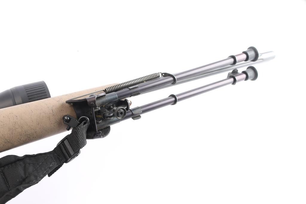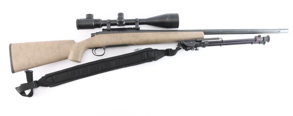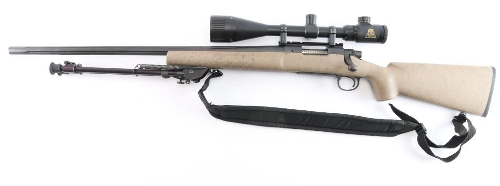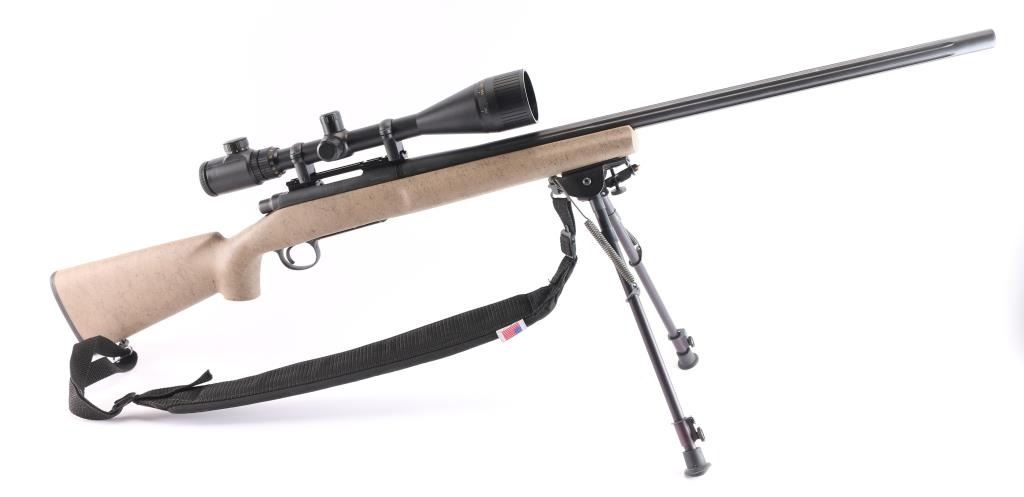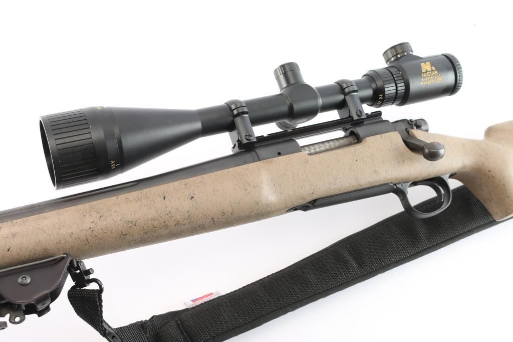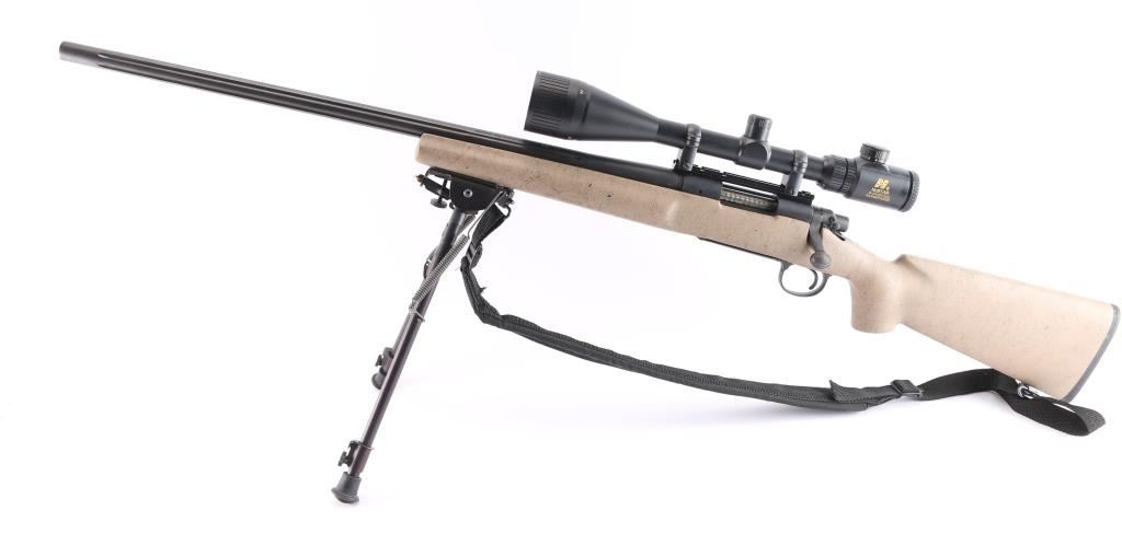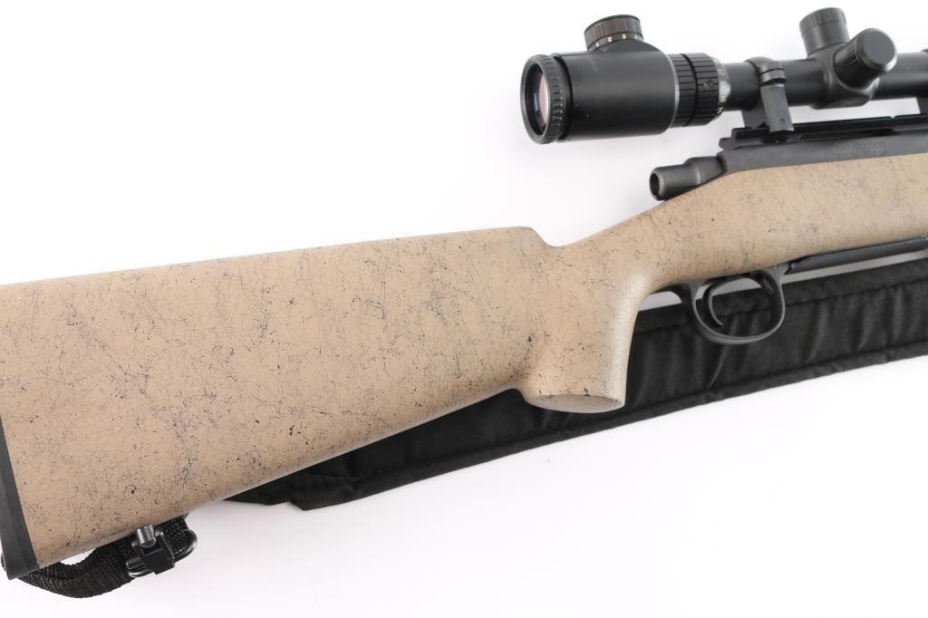 Left Hand 'Varmint Special Fluted" bolt action rifle chambered in .223 Remington., 26" fluted barrel with no provisions for sights, black finish, stock is textured tan composite with black webbing, a palm swell pistol grip, a straight comb, enlarged forend with finger grooves, and a factory black rubber buttpad, sling studs, manual thumb safety, serrated trigger, hinged floorplate, machine turned 'jeweled bolt. Harris Engineering Bipod installed. Mounted with a NcSTAR 6-24X50 AOC RangeFinder scope, Rangefinder reticle, excellent condition. Bagmaster black sling attached. The bore is excellent/bright, action is smooth, stock & finish are excellent. Manufactured 2002,