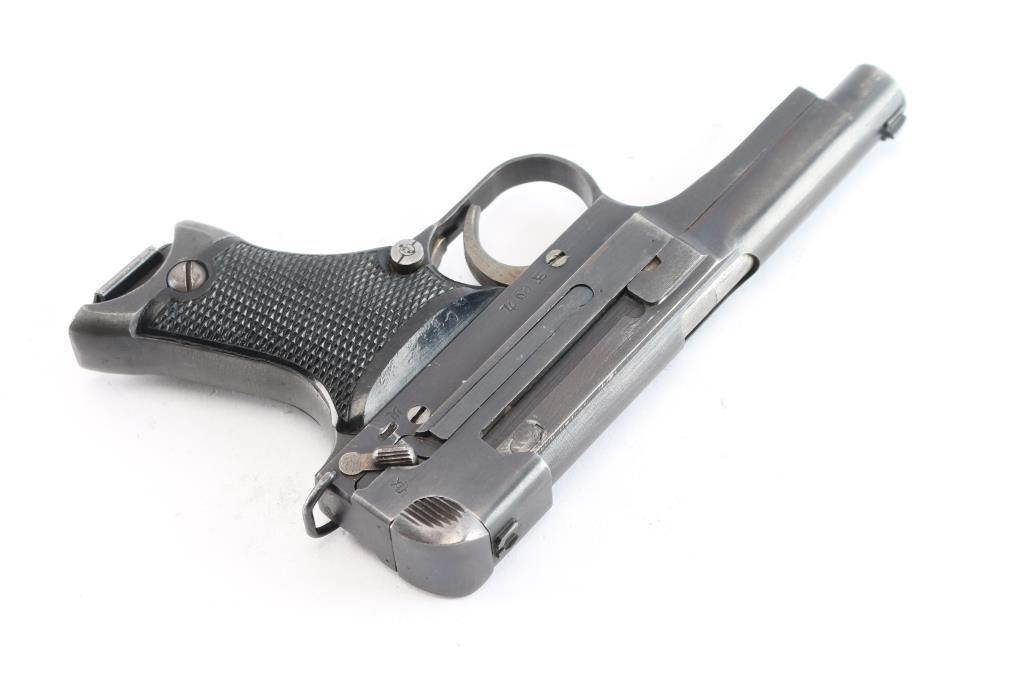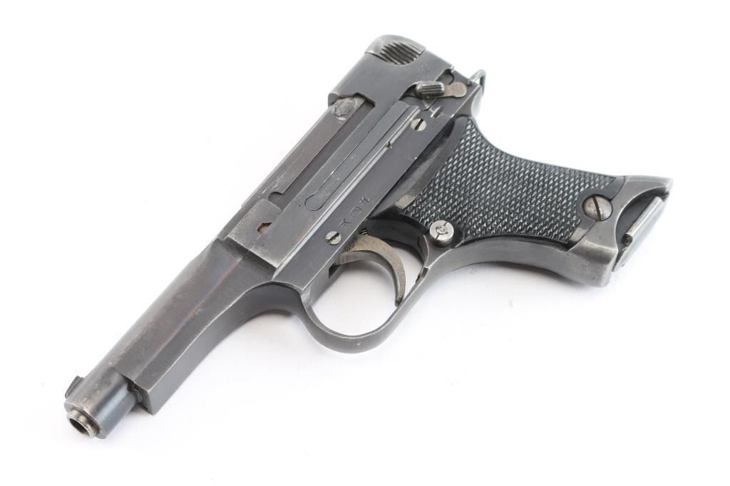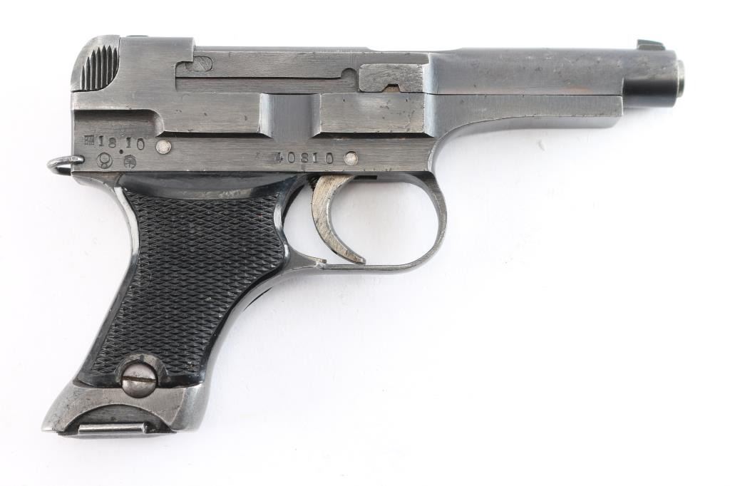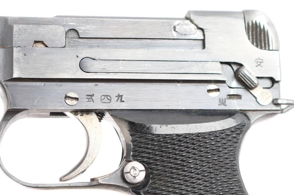 Japanese made semi-automatic pistol chambered for 8x22mm Nambu, and manufactured circa October, 1943. A military issue pistol produced from 1935 until 1945, this Nambu was intended for pilots and tank crews. The date code '18.10' refers to the 18th year, and 10th month of Hirohito's reign. Under the serial number, there are two symbols that represent the Nagoya Arsenal and the Nambu factory, respectively. This is the third variation of the Type 94. Essentially all Type 94s were made by the private firm Chuo Kogyo (or its predecessor, the Nambu Gun Mfg. Company) at their Kokubunji factory under Nagoya Arsenal supervision. This type 94 features a blued finish, a 3-3/4" barrel, fixed blade front sight, fixed square notched rear sight, smooth straw-colored curved trigger, smooth push-button magazine release, serrated frame mounted safety lever, lanyard ring at the rear of the frame, smooth grip straps, magazine disconnect, and checkered black composite grip panels. The pistol retains 96% of its original dull military finish with edge wear, handling blemishes, and some thinning. Most of the straw color remains on the safety and trigger. Metal display no deformation, but there was rust observed inside of the slide. The grips are very good to excellent with handling blemishes, and the markings are sharp an clear. The bore is dirty, but it appears to be bright with strong rifling. The action is smooth and crisp. Pistol includes one magazine total, and it is numbered #708.