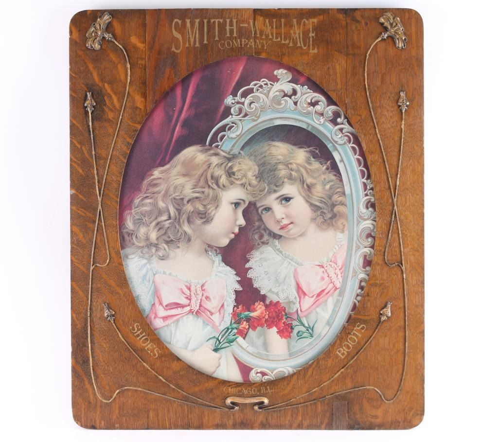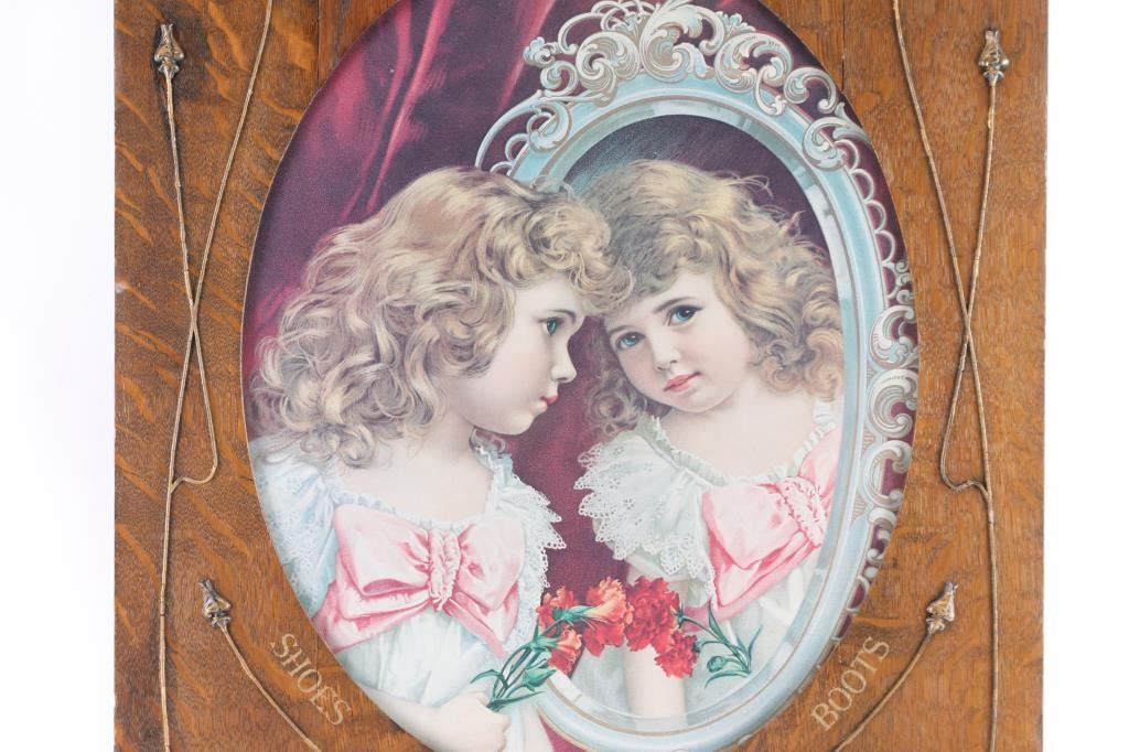 For shoes and boots, in Chicago Illinois. Fancy turn of the century era advertiser in ornate frame with print of two young girls in center oval. Frame is oak with floral applique in art nouveau style. Approximately 25 1.2" x 21 1/2" with frame. Print is near fine condition. Frame is good to very good with minor losses, cracks and aging.