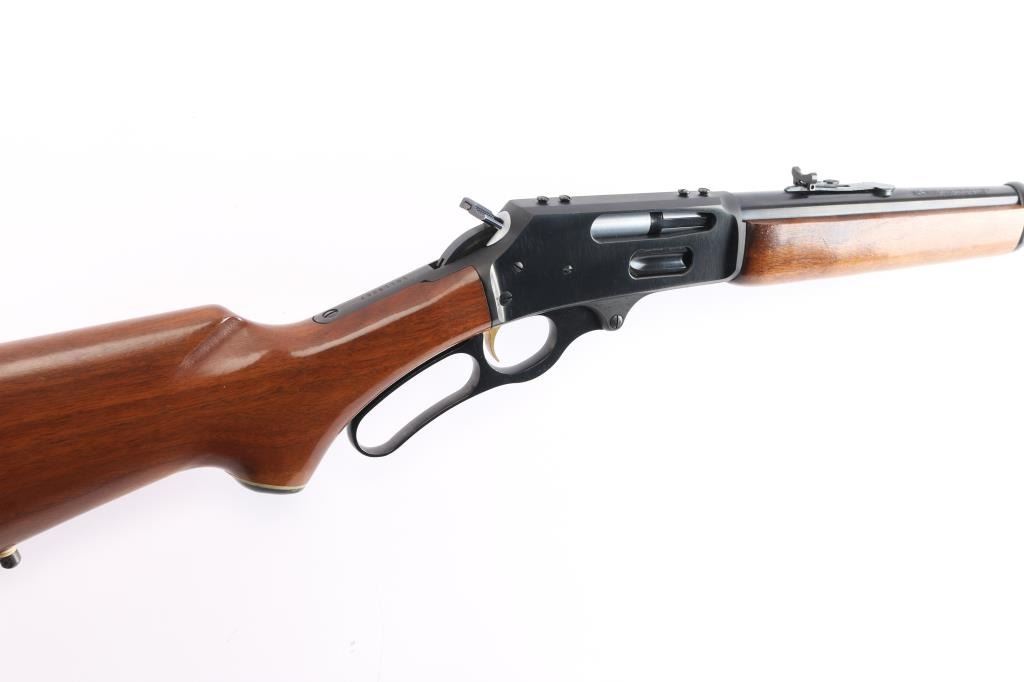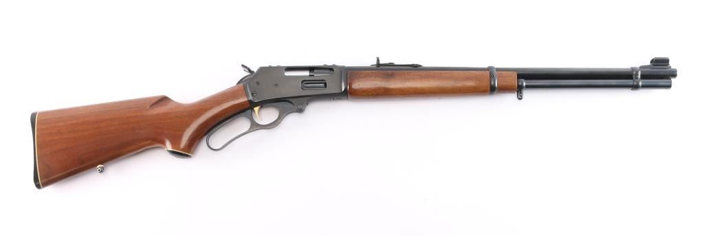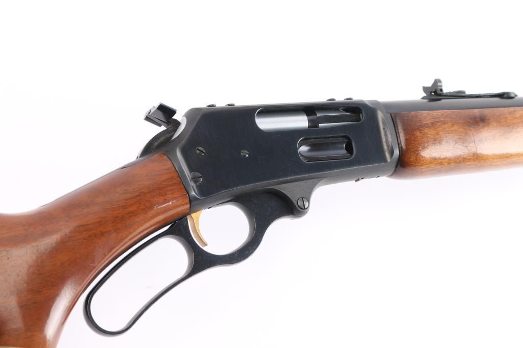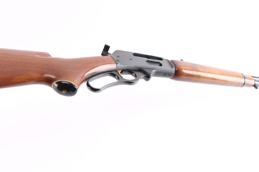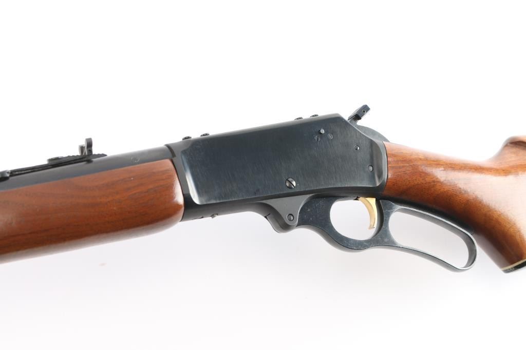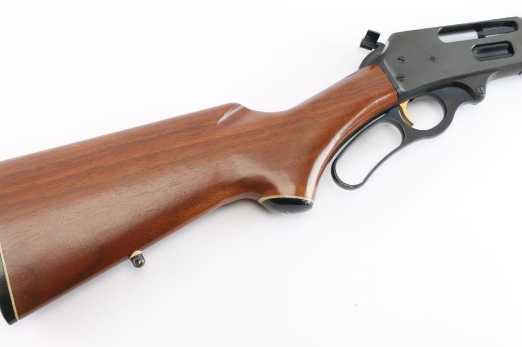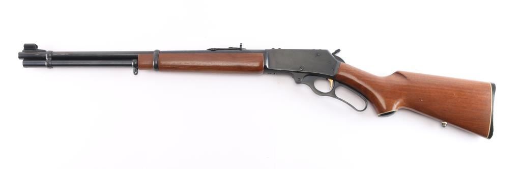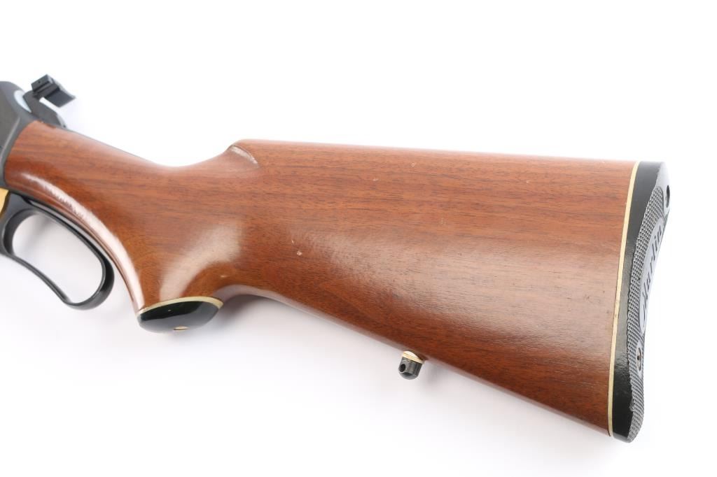 Lever action rifle manufactured circa 1981, chambered in .30-30 Winchester. Features blued finish, smooth walnut furniture with semi beavertail forend and semi pistol grip stock, factory buttstock & grip cap, 20" JM marked barrel, full length mag tube, hooded blade/brass bead front, rear sporting sights, lever safety, gold toned smooth trigger, receiver drilled/tapped for optics. Finger extension installed on trigger, sling swivel studs. Bore is excellent/bright. Retains about 97% finish with minor edge losses, scratches Wood is near excellent with minor handling marks. Comes with photocopy of manual.