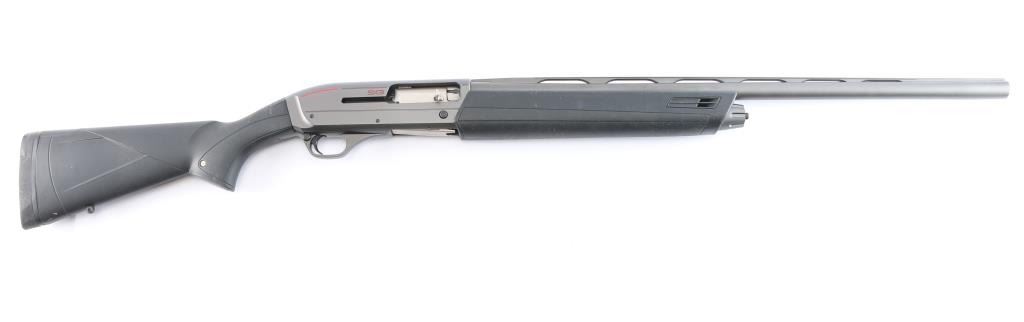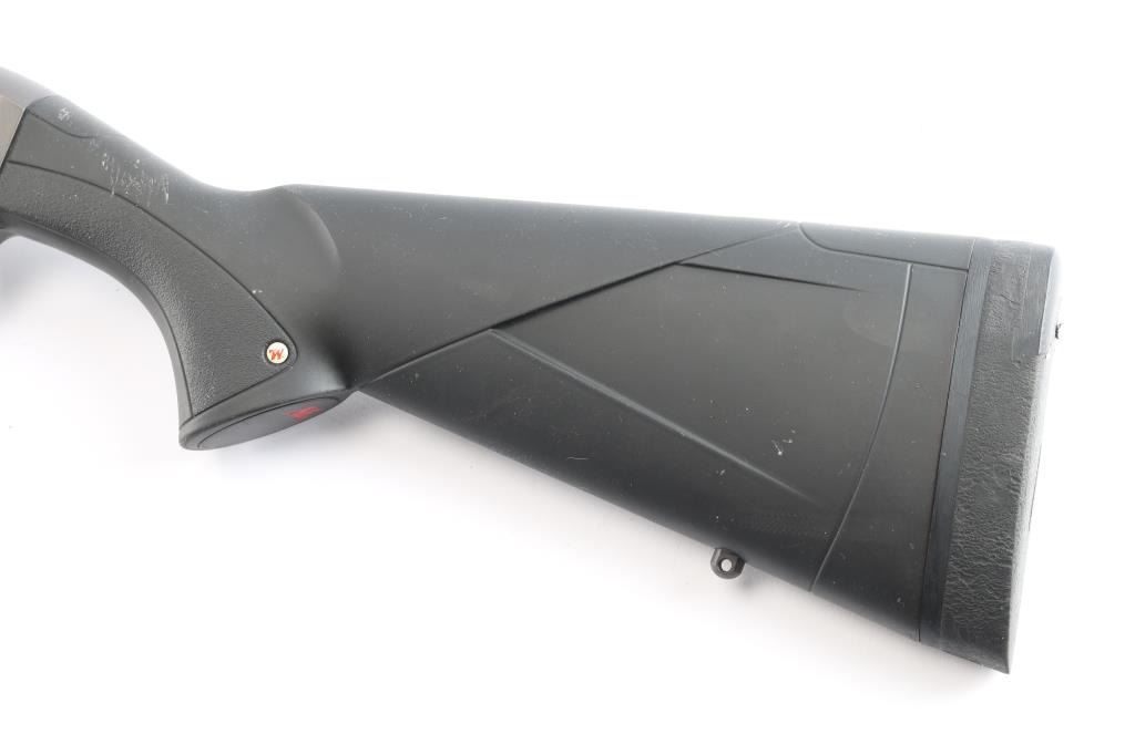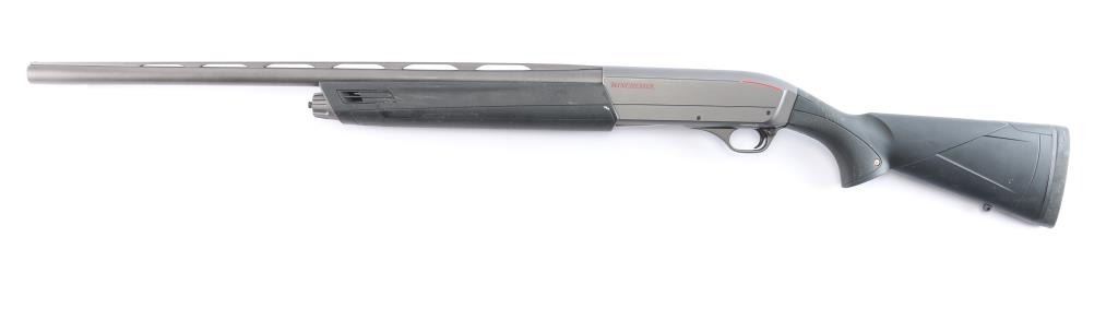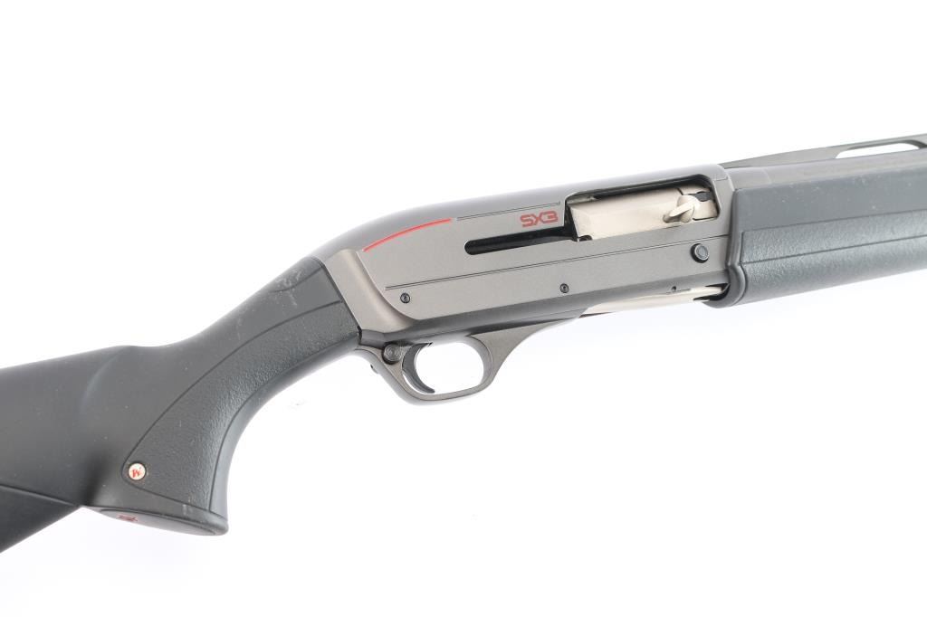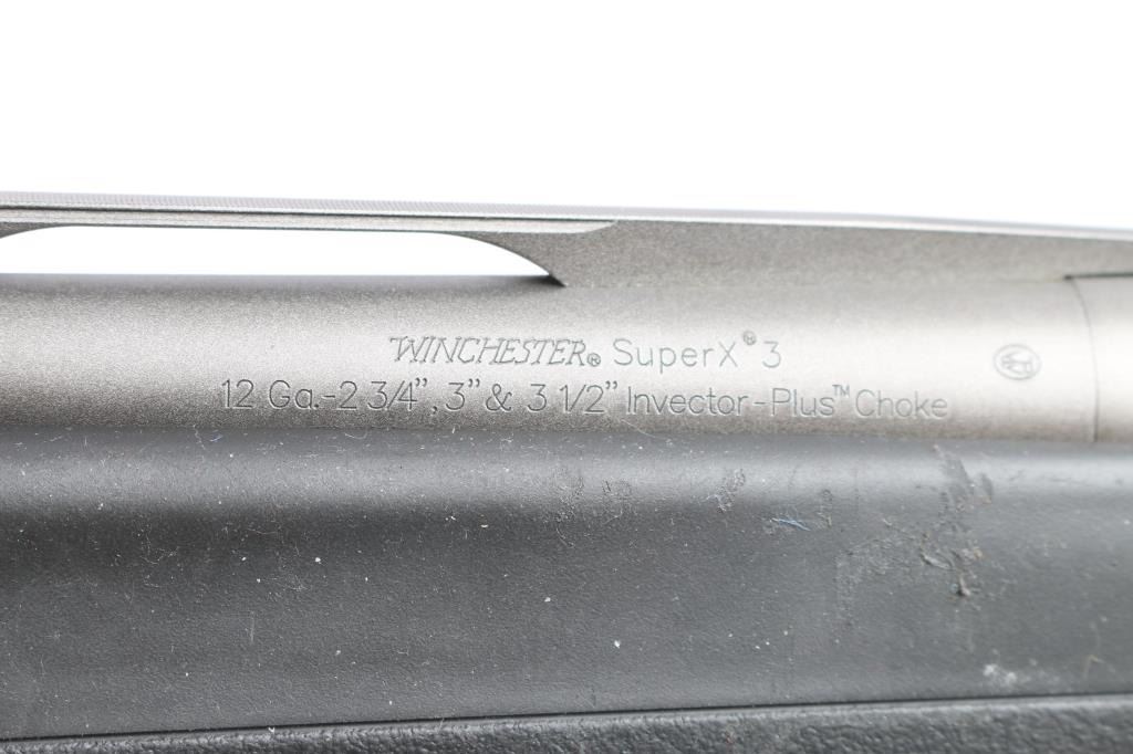 Winchester SX3 Field 12 Gauge Semiautomatic Shotgun. Ideal for shooting clays, upland game, waterfowl and turkey. Manufactured in Belgium by FN. imported by BACCO. 26" vent rib barrel, white sighting bead, chrome lined chamber & bore, Invector Plus Mod choke installed. Receiver, barrel and trigger guard have a special dark grey finish that is both scratch and corrosion resistant, 2 3/4", 3" & 3 1/2" chamber, 4 round tube magazine, push button safety. black polymer stocks with textured panels on the wrist & forearm, Solid Decelerator 1" Recoil Pad. Approximate stock measures are Lop-14", Drop at comb 1 3/4", Drop at heel-2". Bore is excellent/bright, finish id excellent, action is smooth and the polymer is overall good/sound with scuffs on the top of the left wrist and left forearm.