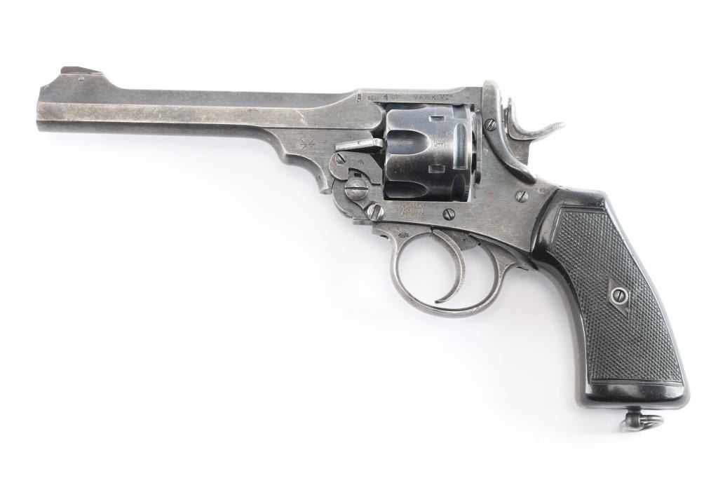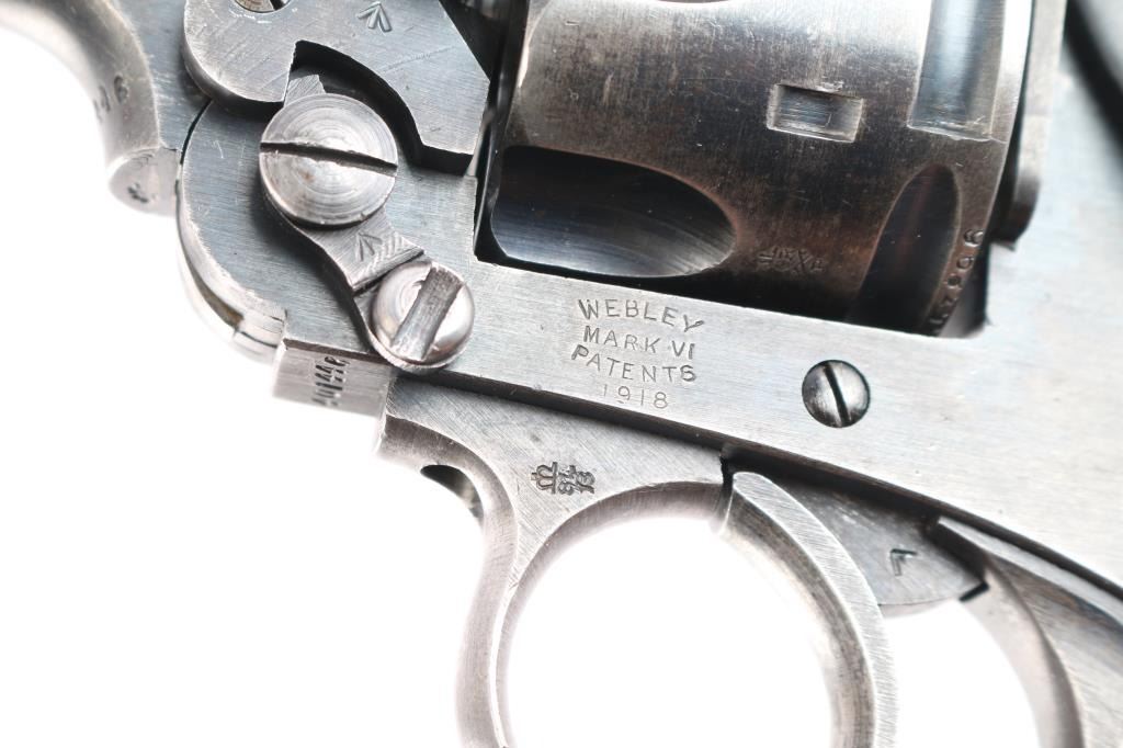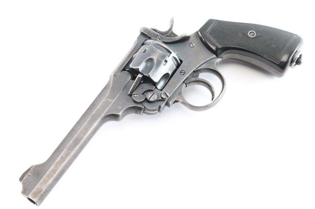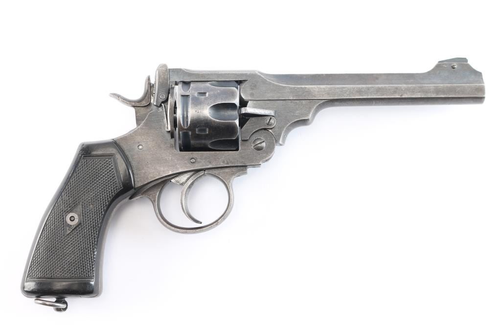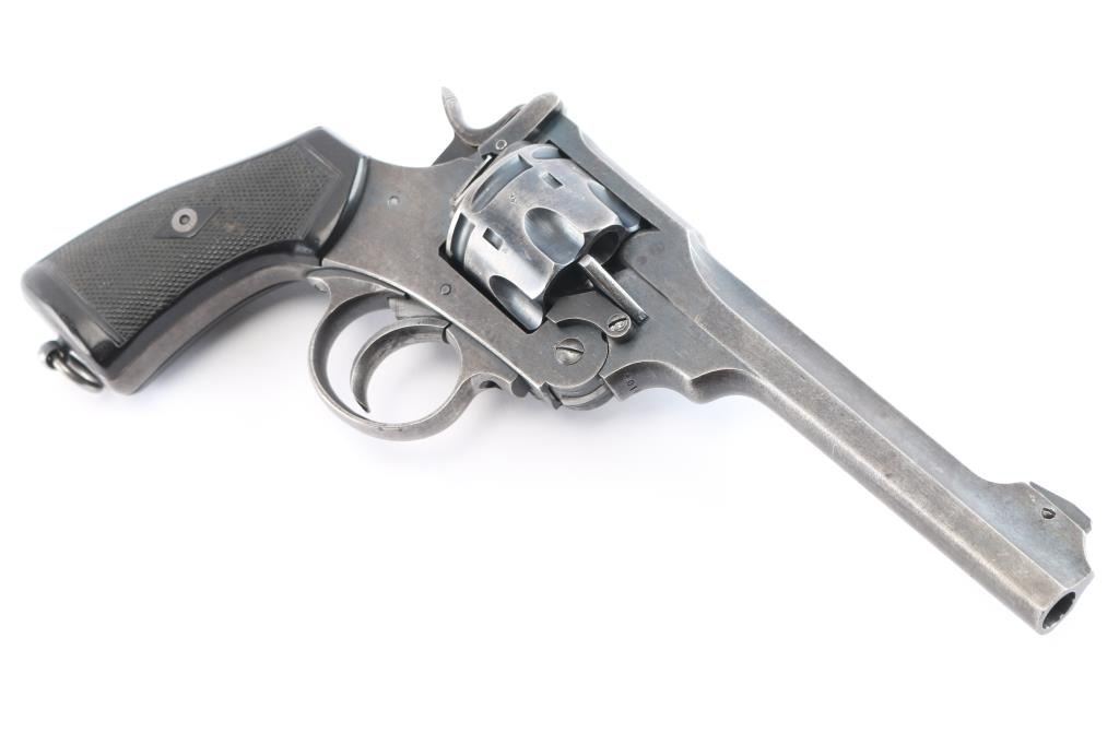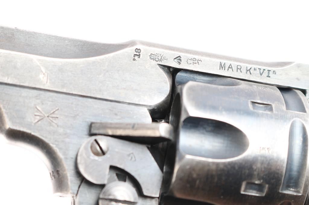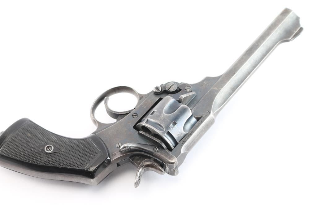 'Shaved Cylinder' British WWI era military revolver features 6" slab sided barrel, fixed front sight with pinned blade insert, notch rear sight on top latch, 6 shot fluted cylinder (appears cut at rear to allow use of 45 Auto Rim cartridges or 45 ACP in clips - more powerful than the original cartridge and hard on this revolver's action), break top style opening for loading and unloading, double/single action operation, fixed sights, square butt grip frame, checkered black plastic or hard rubber grips, lanyard ring on butt. Bore and charge holes are very good condition. Retains about 70% matte finish. overall dark gray colored with areas of light patina, holster wear, edges losses & handling marks. Grips are very good condition, no visible chips or cracks. Action operates smoothly, with good lock-up. Extractor star snaps back into place when fully opened. Markings are generally sharp & readable, include 1918 patent date, nitro proof marks. Numbers match on frame & barrel, cylinder mismatched.