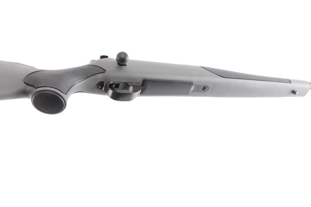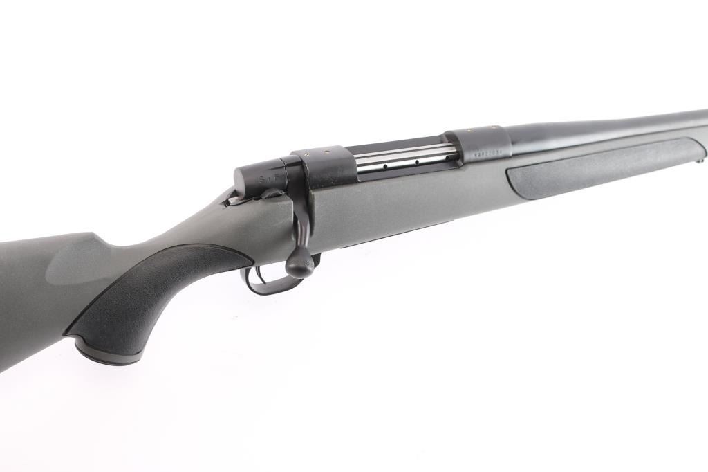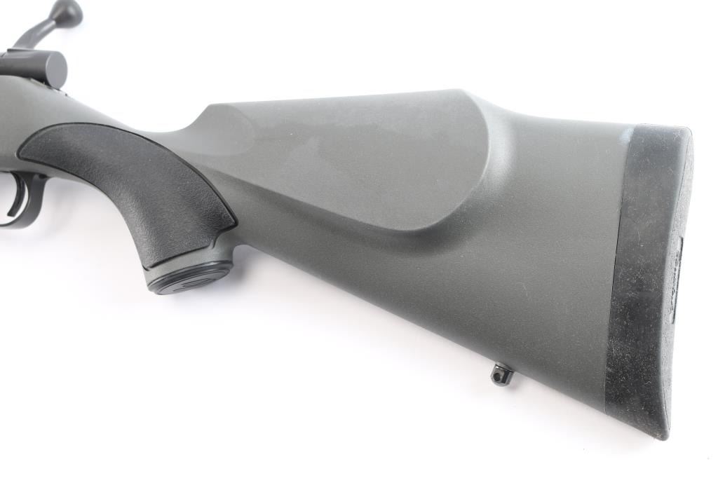 Quality SUB MOA bolt action rifle made in Japan by Howa, chambered for .257 Weather Magnum. Features matte bead blasted blued finish, 24" barrel, no provisions for sights, manual manual 3-Position Safety: Rear (safe, bolt locked), Middle (safe, bolt unlocked/operable for loading/unloading), Forward (fire) thumb safety, hinged floorplate, serrated trigger, sling studs, swept back bolt handle, solid rubber factory recoil pad. Green Monte Carlo Griptonite stock with black checkered panels at wrist & forearm, cheek rest. Receiver drilled/tapped for optics, brass filler screws. Bore is excellent/bright. Rifle is in like new condition, appears unfired. Comes in original factory box with matching label, manual & lock.