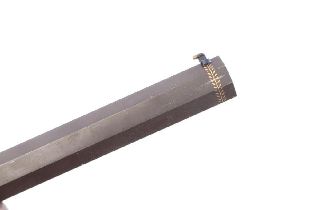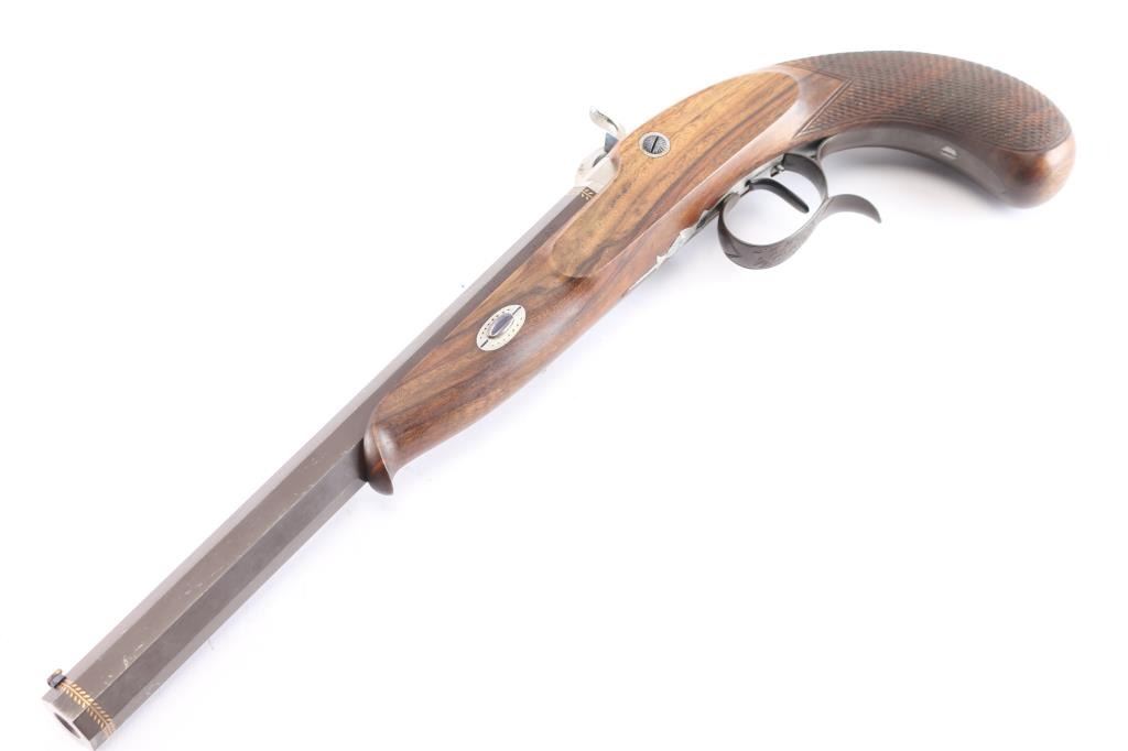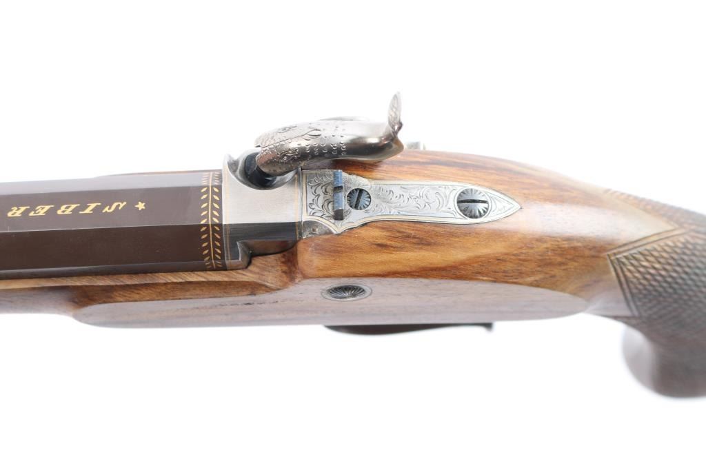 By Hege of Uberlinger Germany patterned after mid-19th Century original by Jean Siber of Lusanne, Switzerland, and gold inlaid with his name on the bbl. Approximately 16" overall with 9 1/2 medium weight octagon bbl of approximately 33 cal rifled. Half stocked with nicely checkered stock, engraved mounts, gold inlay on browned bbl with French style bright polish on lock and breach. Numbered 00164 and 33 cal marked on left side of breach. Adjustable set trigger. Absolutely as well made as a mid-19th Century European pistol. From the collection of "Bill" Ruger.