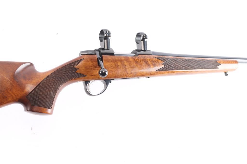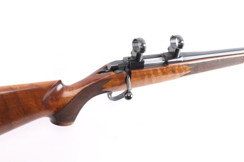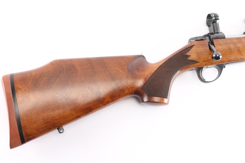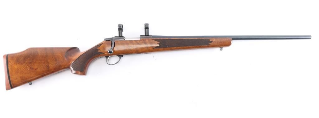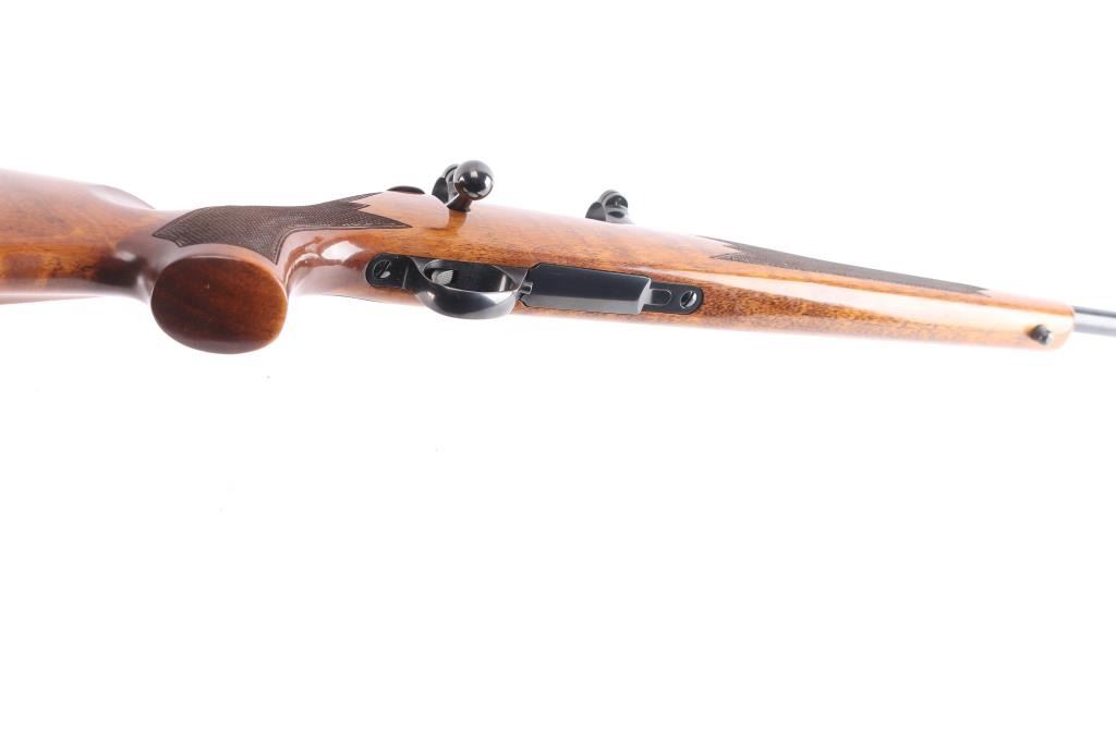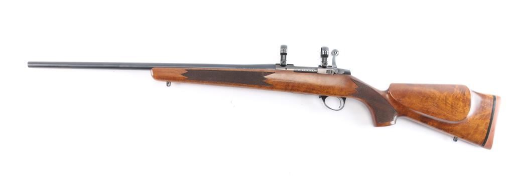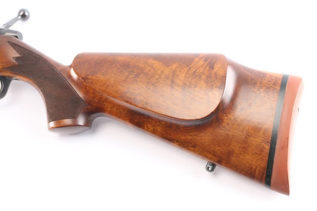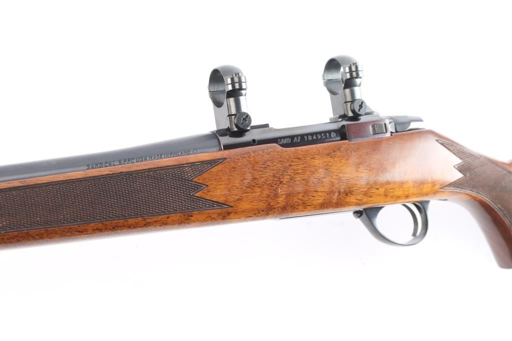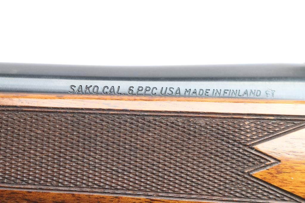 High quality Finnish made bolt action sporting rifle chambered in 6mm PPC, circa 1980's. Optics ready. Imported by Stoeger Inc. of N.J. with import marks on the underside of the barrel. Features a blued finish, plum colored bolt release. 23" barrel with no provisions for sights, installed Leupold 1" scope rings, serrated trigger, manual safety, internal box magazine with hinged floorplate, red dot cocking indicator and checkered Monte Carlo style high wood stock with swivel studs, right handed palm swell, shadow line cheek rest & red factory recoil pad. Rifle exhibits approximately 99%+ of it's original finish. Action is smooth, bore is pristine and wood stock is fine. Like new.