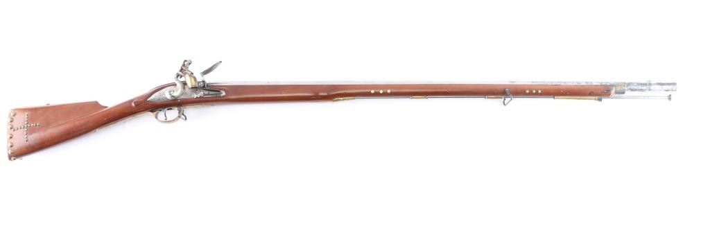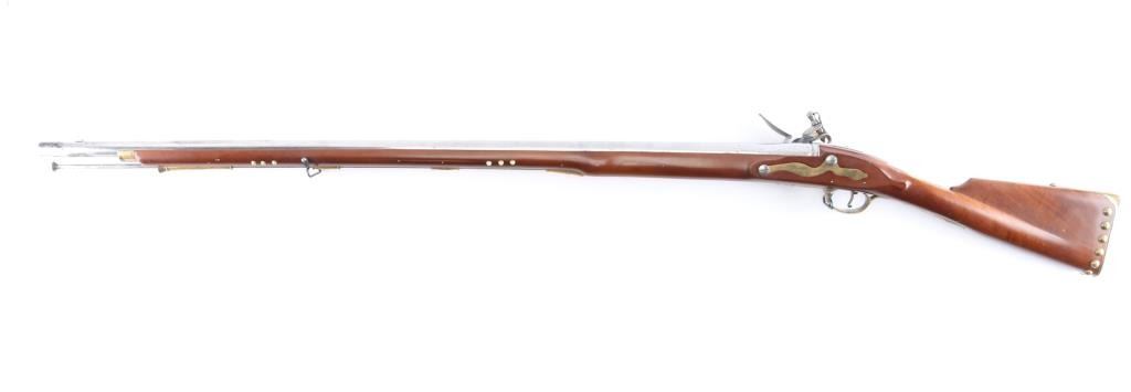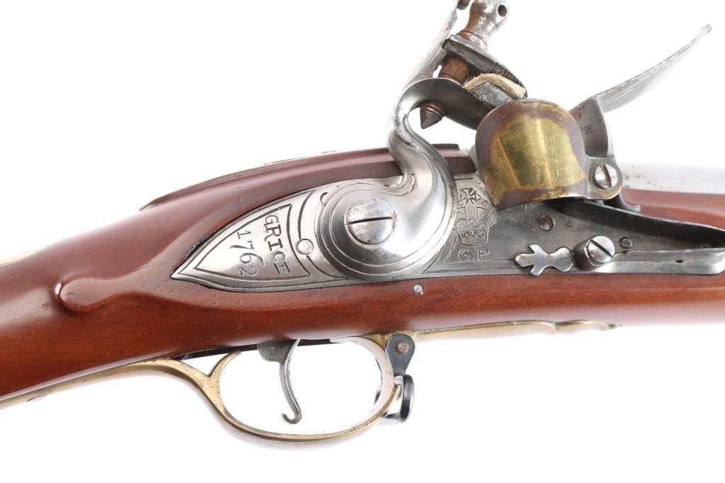 Italian made by Pedersoli, reproduction of "Brown Bess" revolutionary style musket in 75 cal smooth bore. 42" bbl, 59" overall, "S" shaped sideplate simulating revolutionary war arms. Lock marked Grice & Crown dated 1762 (Grice was an actual contractor for French and Indian War and Revolutionary muskets.) Good used condition with American style brass tacks added. Made 1982 or 83 showing very good quality. Ramrod included.