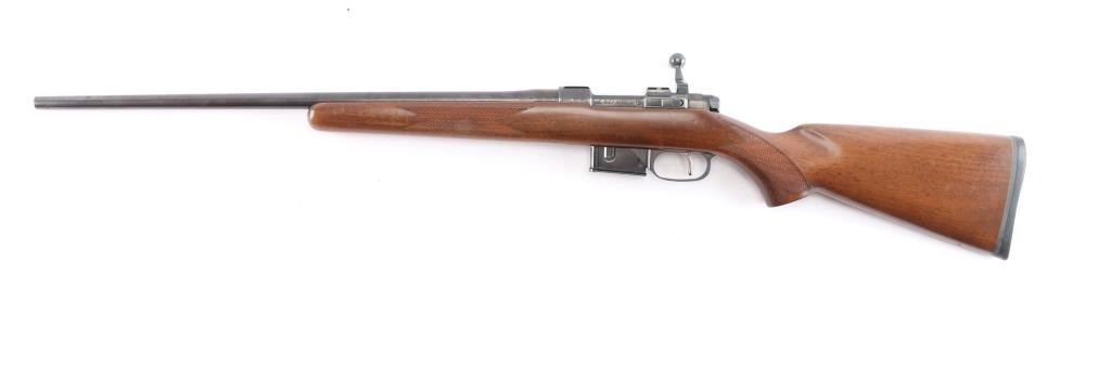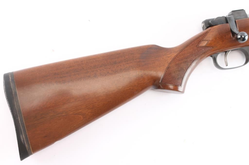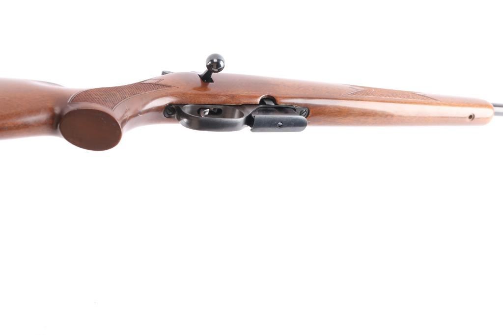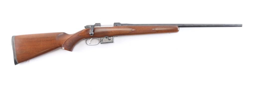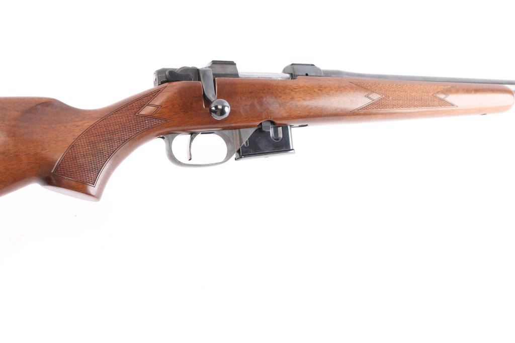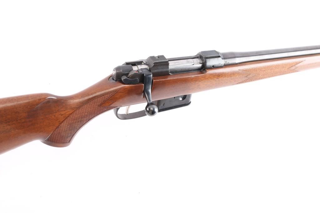 Czech Republic made bolt action sporting rifle chambered in .222 Remington. Features a blued finish, 21.875" tapered barrel with no provisions for sights, receiver with integrated 16mm scope bases, smooth single set trigger, two position thumb safety, sling swivel studs have been removed, checkered Turkish walnut pistol grip shoulder stock with textured black rubber factory recoil pad. Rifle exhibits approximately 97% of it's original finish with slight muzzle wear, handling marks. Action is smooth, bore is excellent, strong rifling and wood stock is overall excellent with some minor scratches. Includes one 5 rd metal magazine.