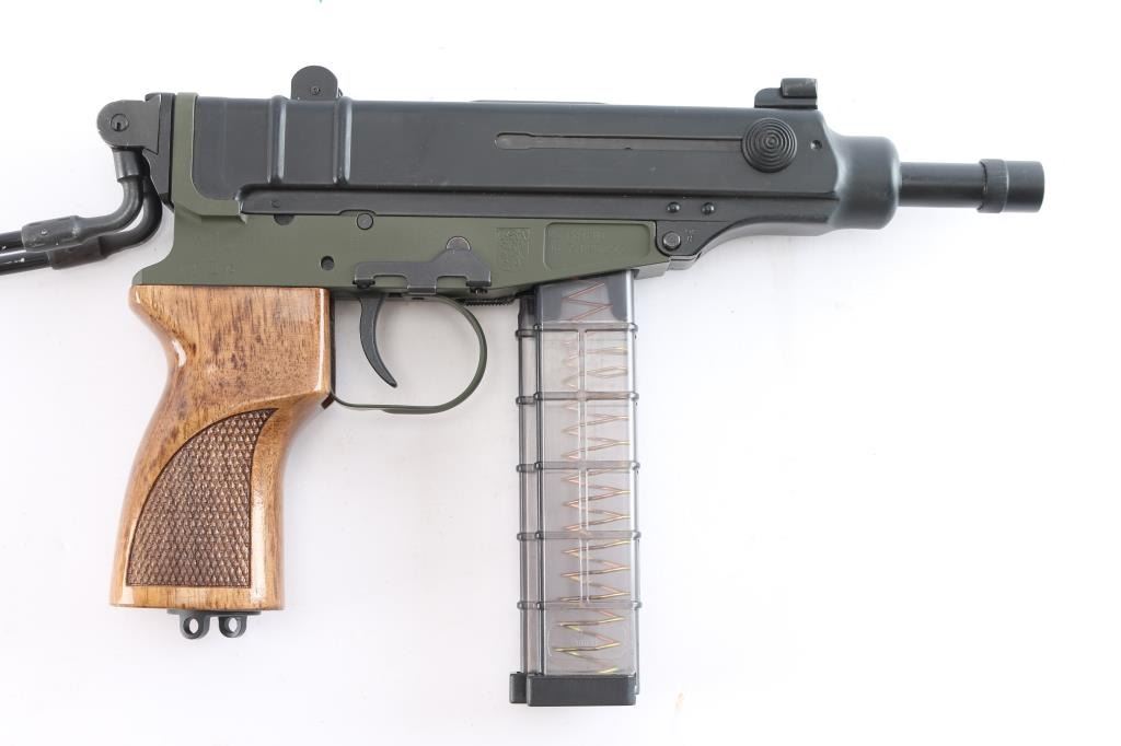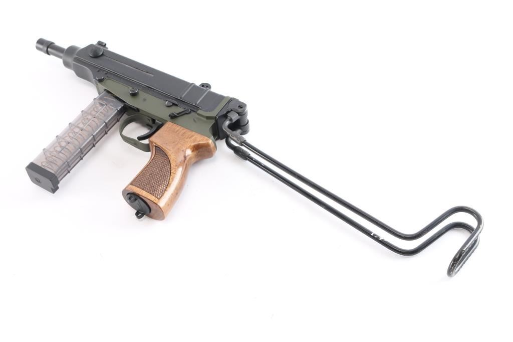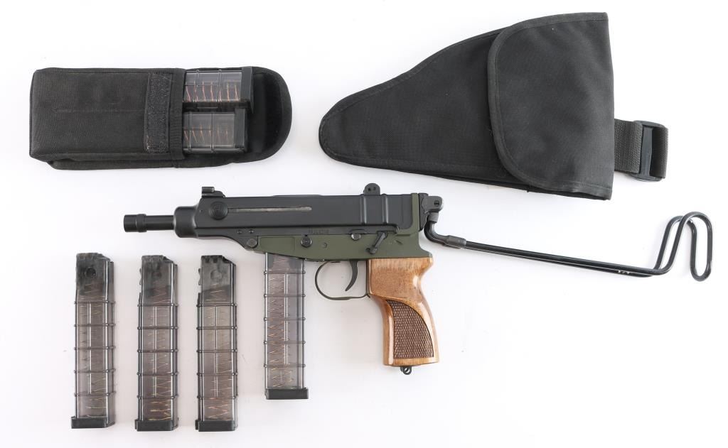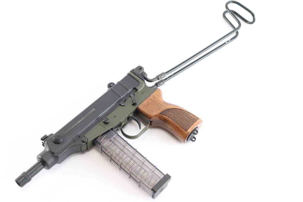#69B00832. The SA Vz. 61 Scorpion, semi-automatic, blow-back action. 4.53" Threaded Barrel folding wire stock, checkered ribbed hardwood grip, and a matte black finish with olive drab receiver. Manufactured in the Czech republic, imported by Czech-Point, Knoxville, TN. Protected front post and notched two leaf rear sight, marked "75" & "450", manual safety on left receiver, round knurled charging knobs, push button magazine release, rotating plate on the heel allows for quick access to the internal spring and weight for cleaning or replacement, as the mechanism is exposed to carbon buildup. The bore is excellent/bright, finish & grip are excellent, action is smooth. Includes a dual magazine black nylon pouch, a black synthetic soft OWB holster. It also comes with six factory clear plastic 20-round magazines.