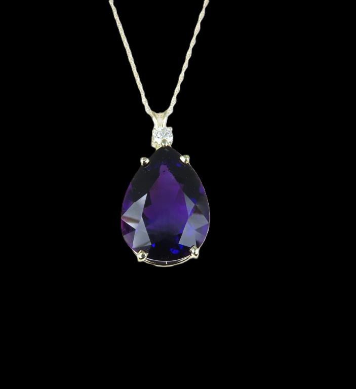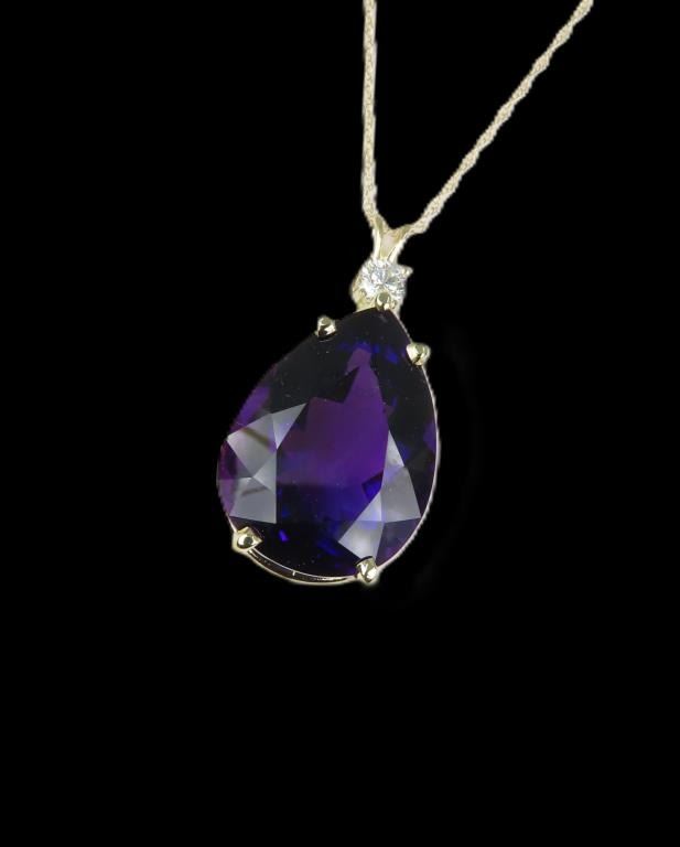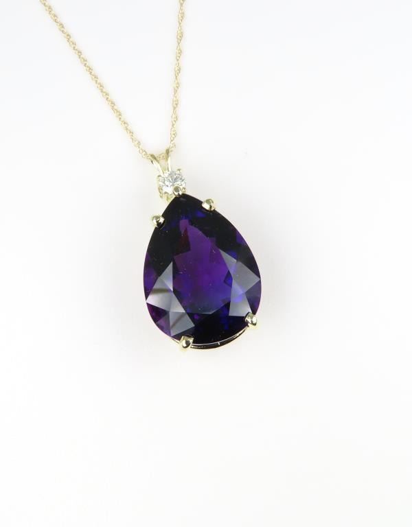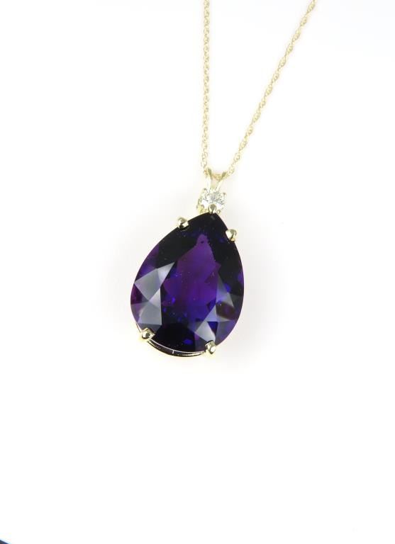 and Diamond Pendant featuring a 17.50 carat Amethyst with vivid purple color and excellent clarity accented by a round brilliant cut Diamond weighing approx. 0.25 carats with G-H color and SI clarity all set in a heavy 14 karat yellow gold setting. Retail $5,000-$7,000.